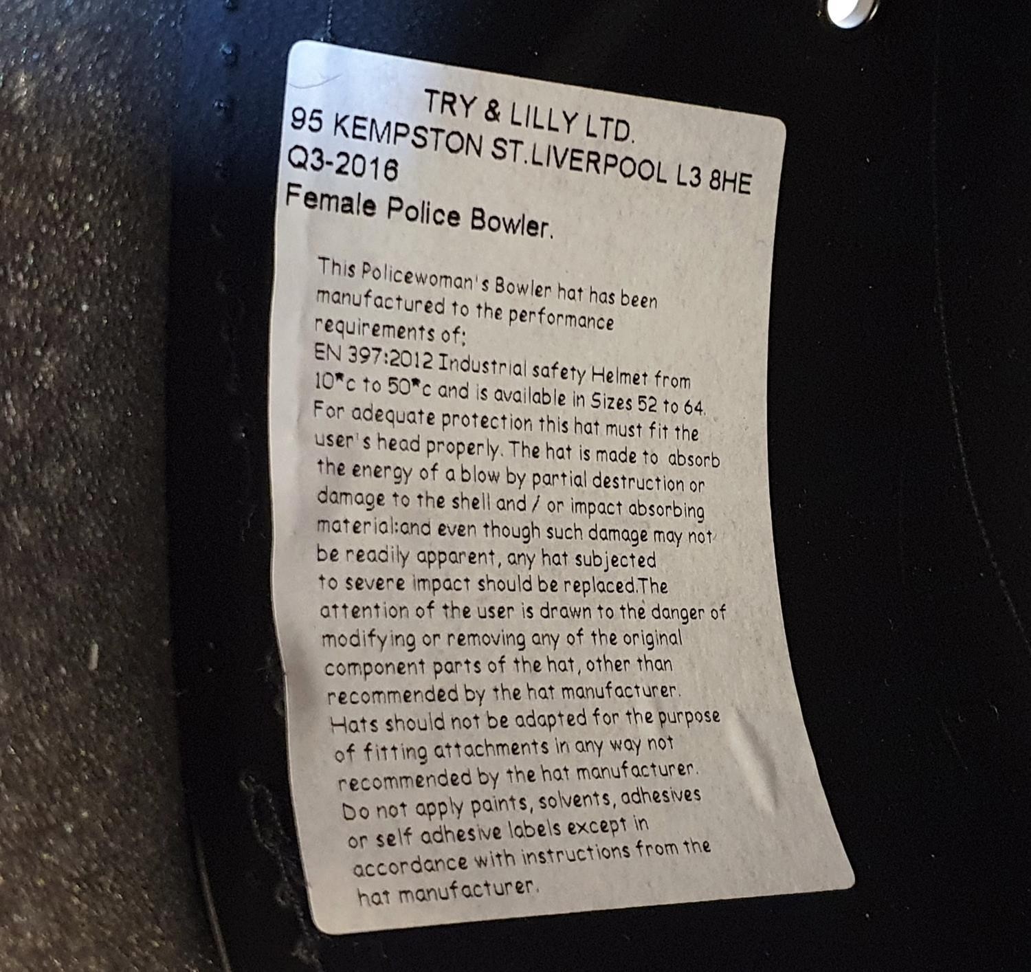 Female police Bowler hat by Try & Lilly Ltd of Liverpool with Northumbria cap badge,