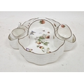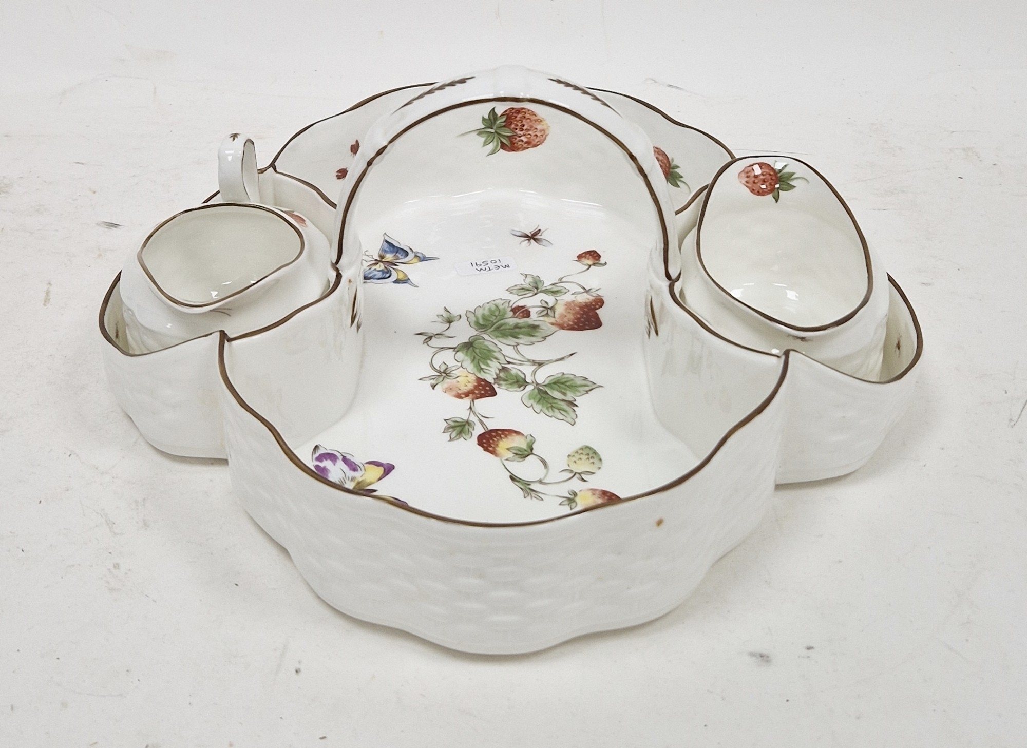 Coalport bone china strawberry serving basket, cream jug sugar bowl, basket moulded printed with strawberries, butterflies and insects, within brown line borders, basket 28.5cm wide