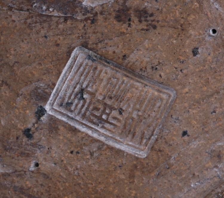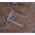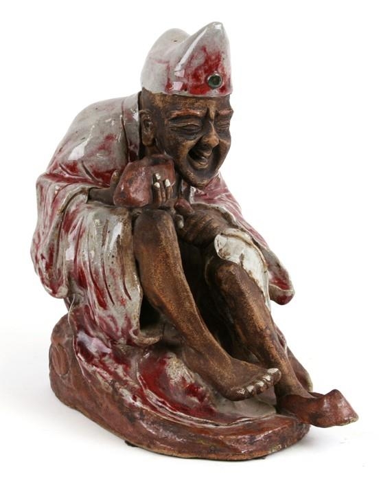 A Chinese Shiwan pottery figure in the form of an emaciated robed figure holding his shoe, impressed mark to the underside, 28cms (11ins) high.