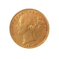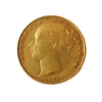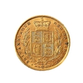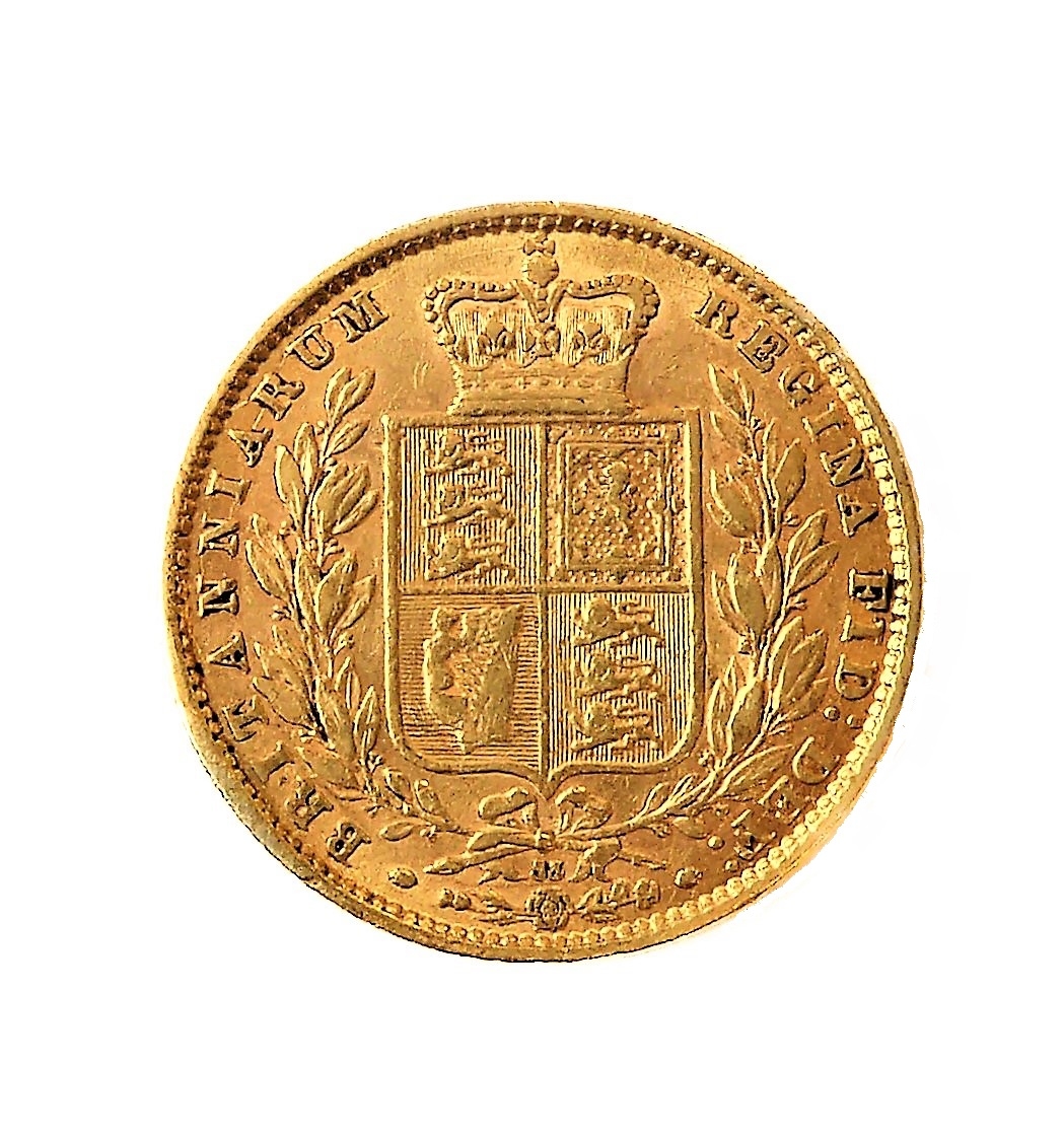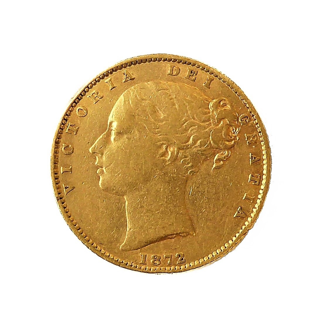 An 1872 gold sovereign (young head obverse and royal arms reverse).