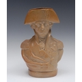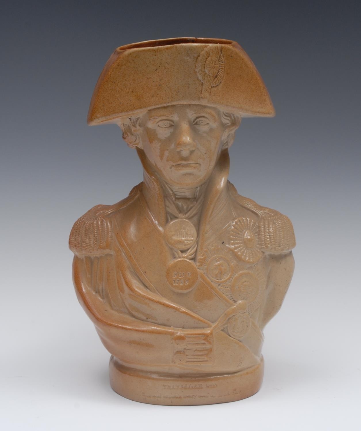 A 19th century brown salt glazed stoneware Lord Nelson bust jug, in military dress, inscribed Nile 1798, Trafalgar 1806, 27.5cm high, c.1820