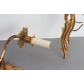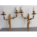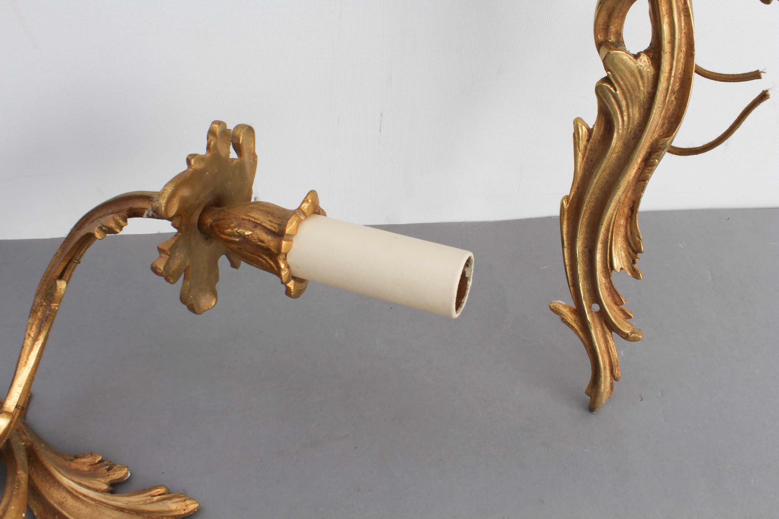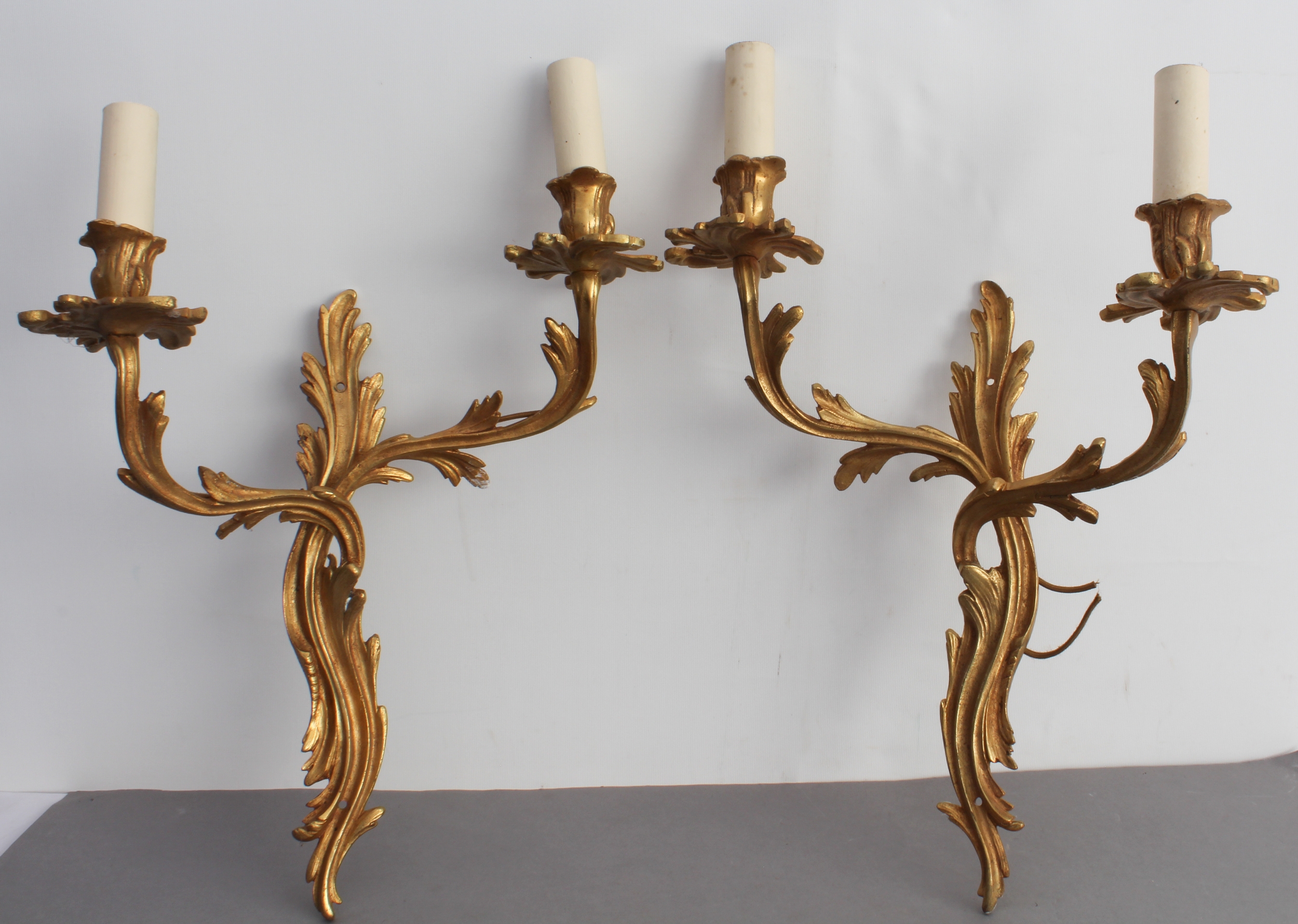 A pair of early 20th century gilt-metal two-light wall appliques in Louis XV style and carved as acanthus-style leaves (49.5 cm high including brass electrical fitting)