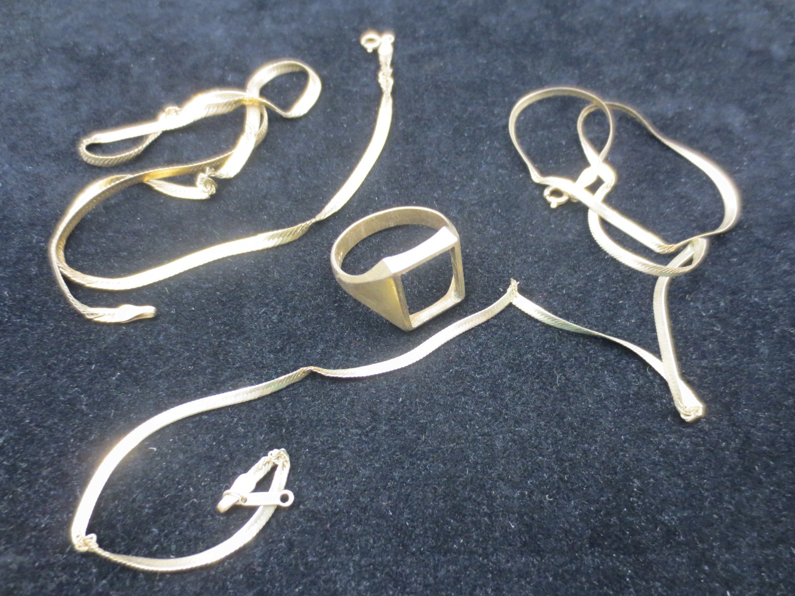 A gentleman's 9 carat gold ring missing its stone, and a pair of ribbon necklaces in 9 carat gold, both badly kinked - scrap gold lot, approx weight 9.81g