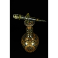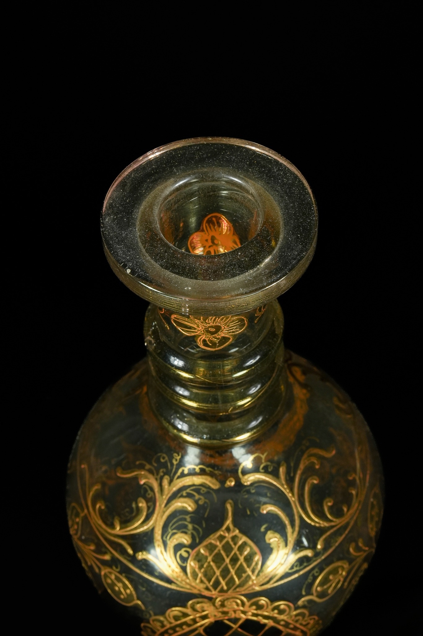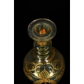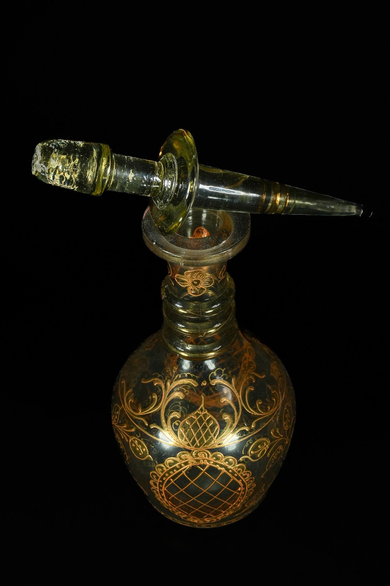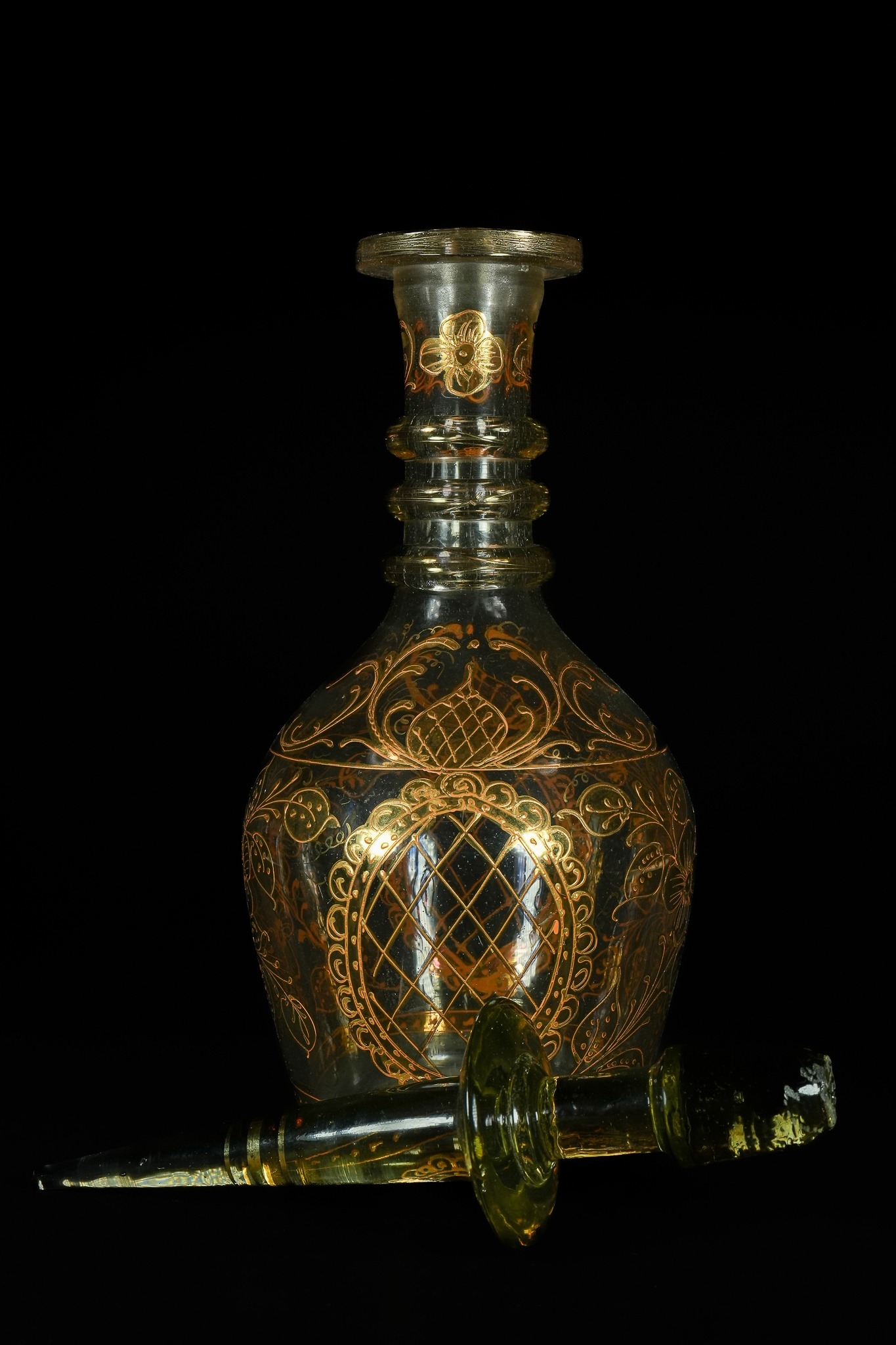 A glass decanter with a conforming stopper, crafted from a pale green or olive-tinted glass. It features extensive gilded decoration across its bulbous body and ridged neck, comprising scrolling floral and arabesque motifs, with a central lozenge cartouche enclosing a lattice pattern.