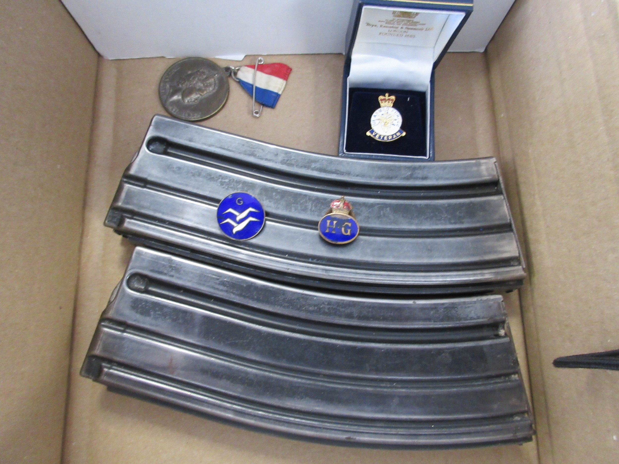 A selection of military items including a pair of SA-80 magazines, a WW2 Home Guard enamel button badge, veterans badge etc