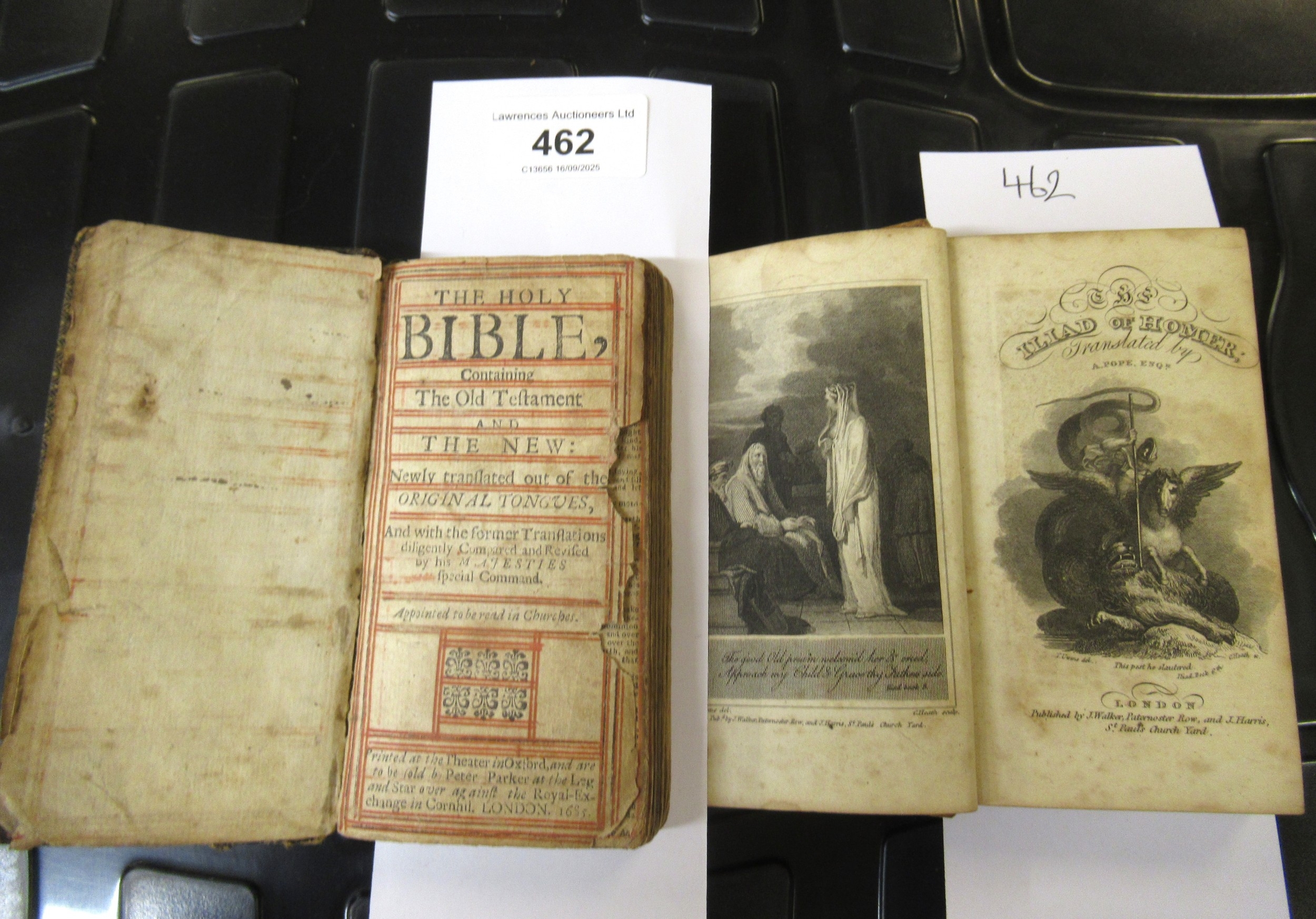 Miniature leather bound bible, London 1685, together with a small antique leather bound volume, ' The Iliad of Homer '