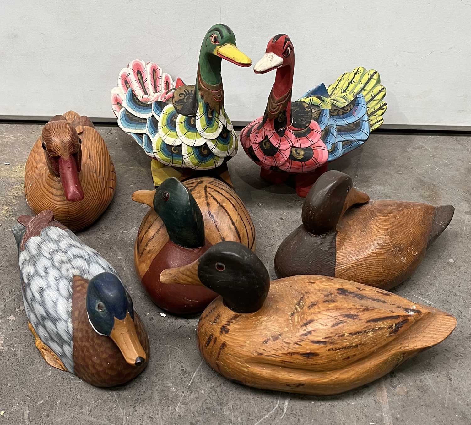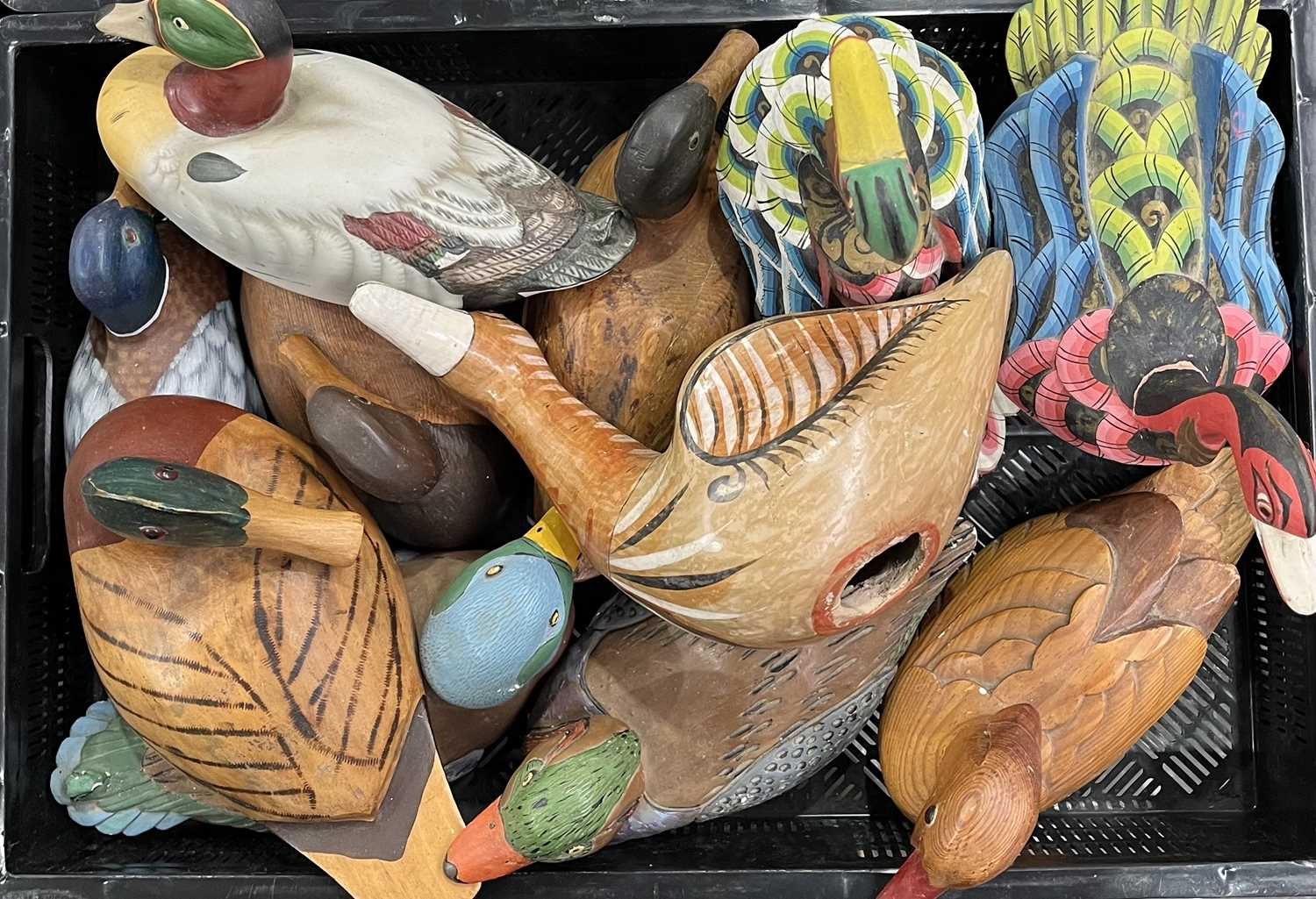 A collection of duck ornaments, wood, ceramic, plaster etc (1 tray)