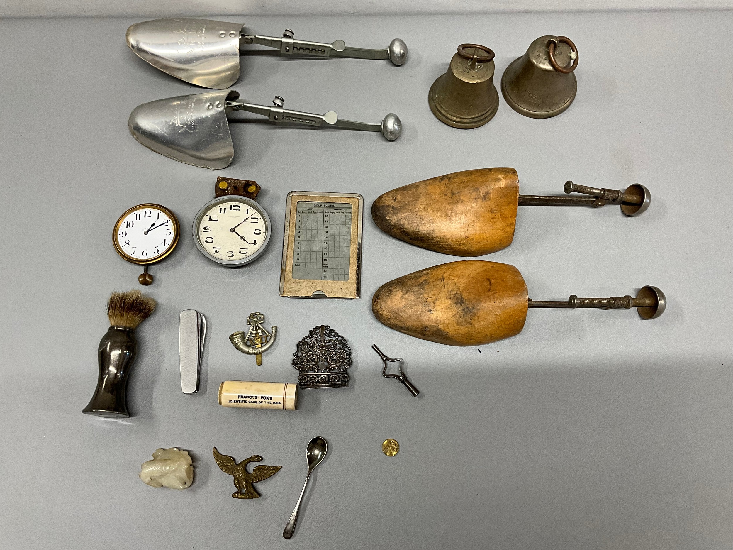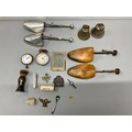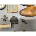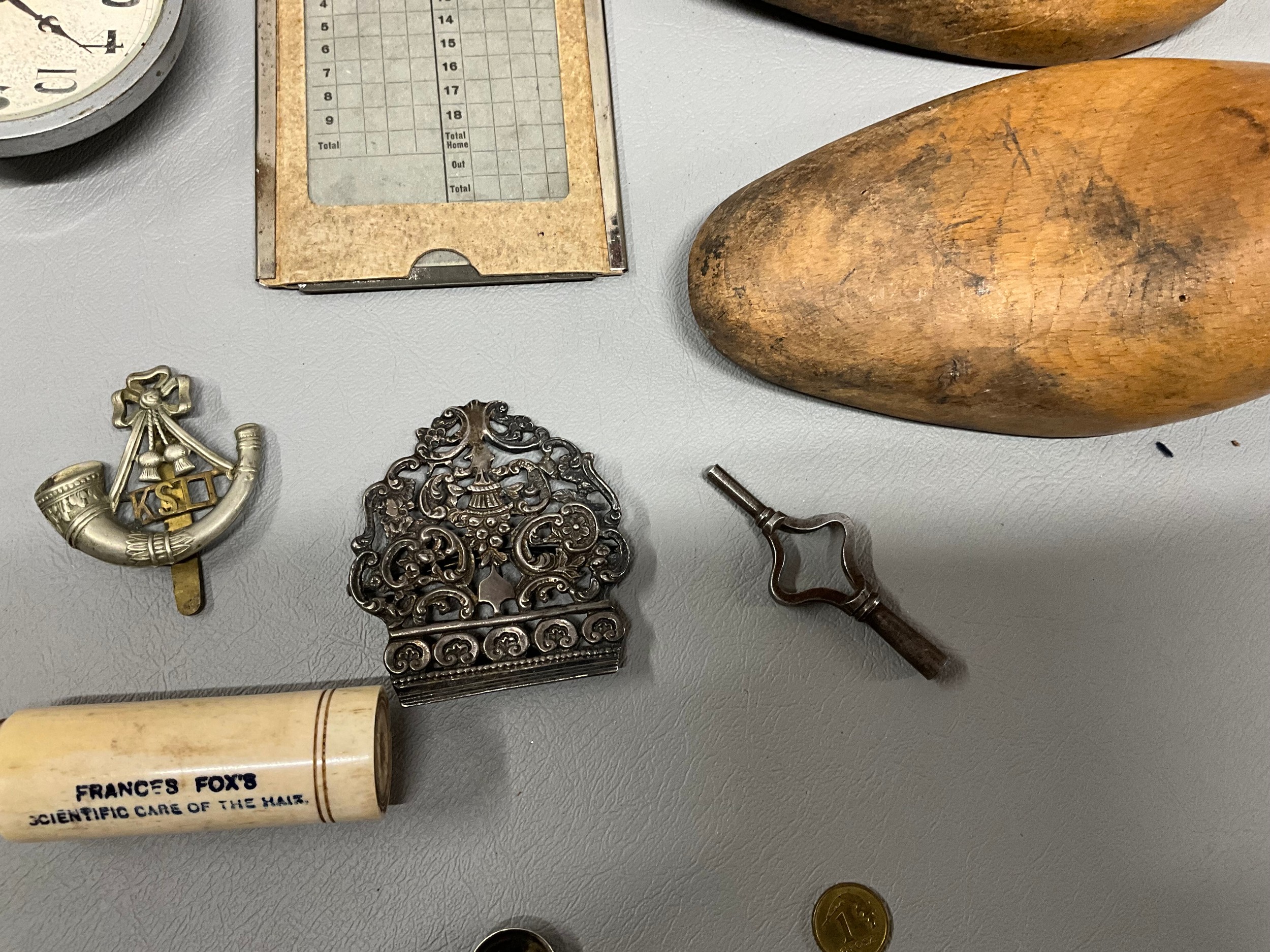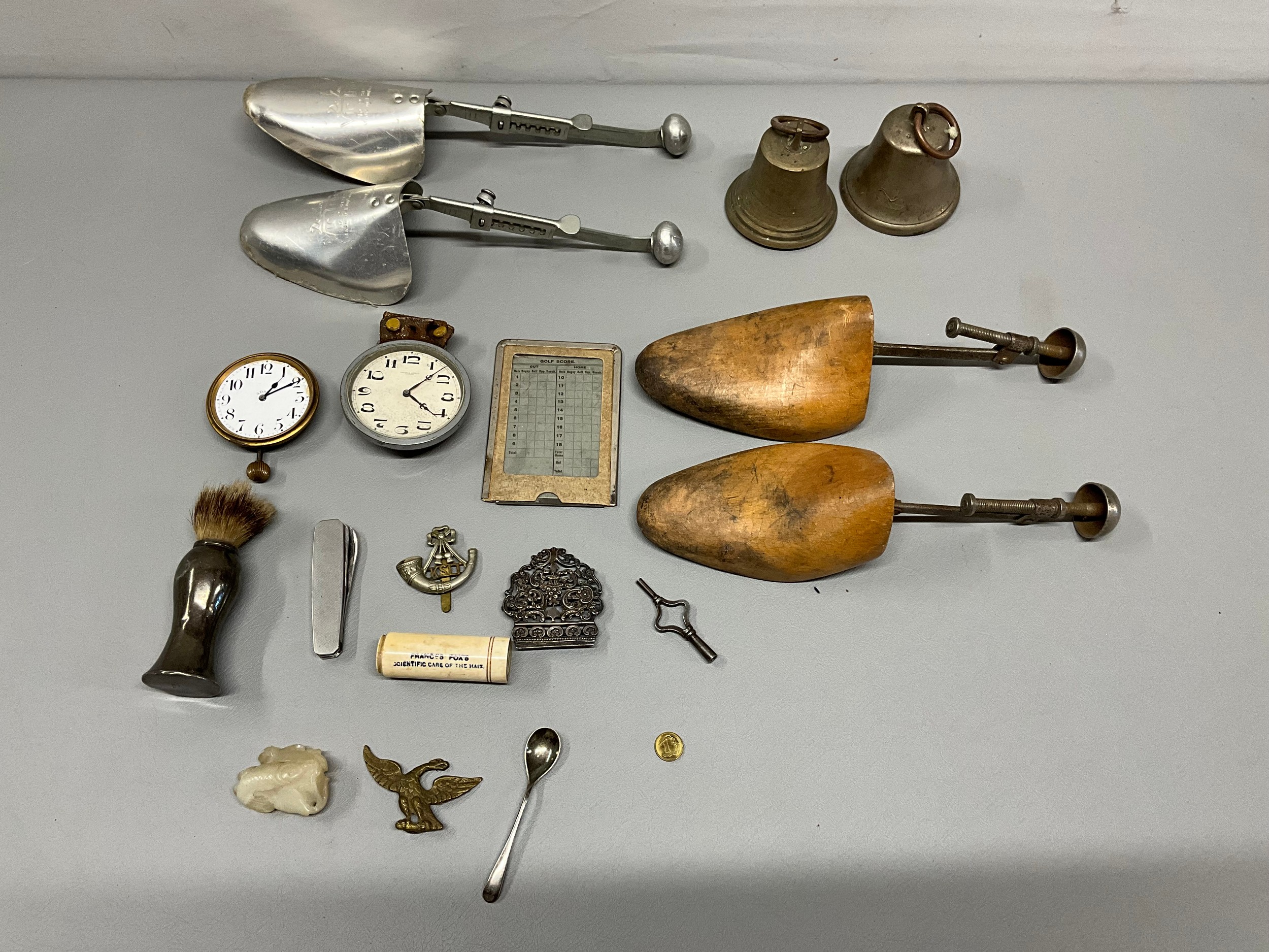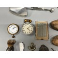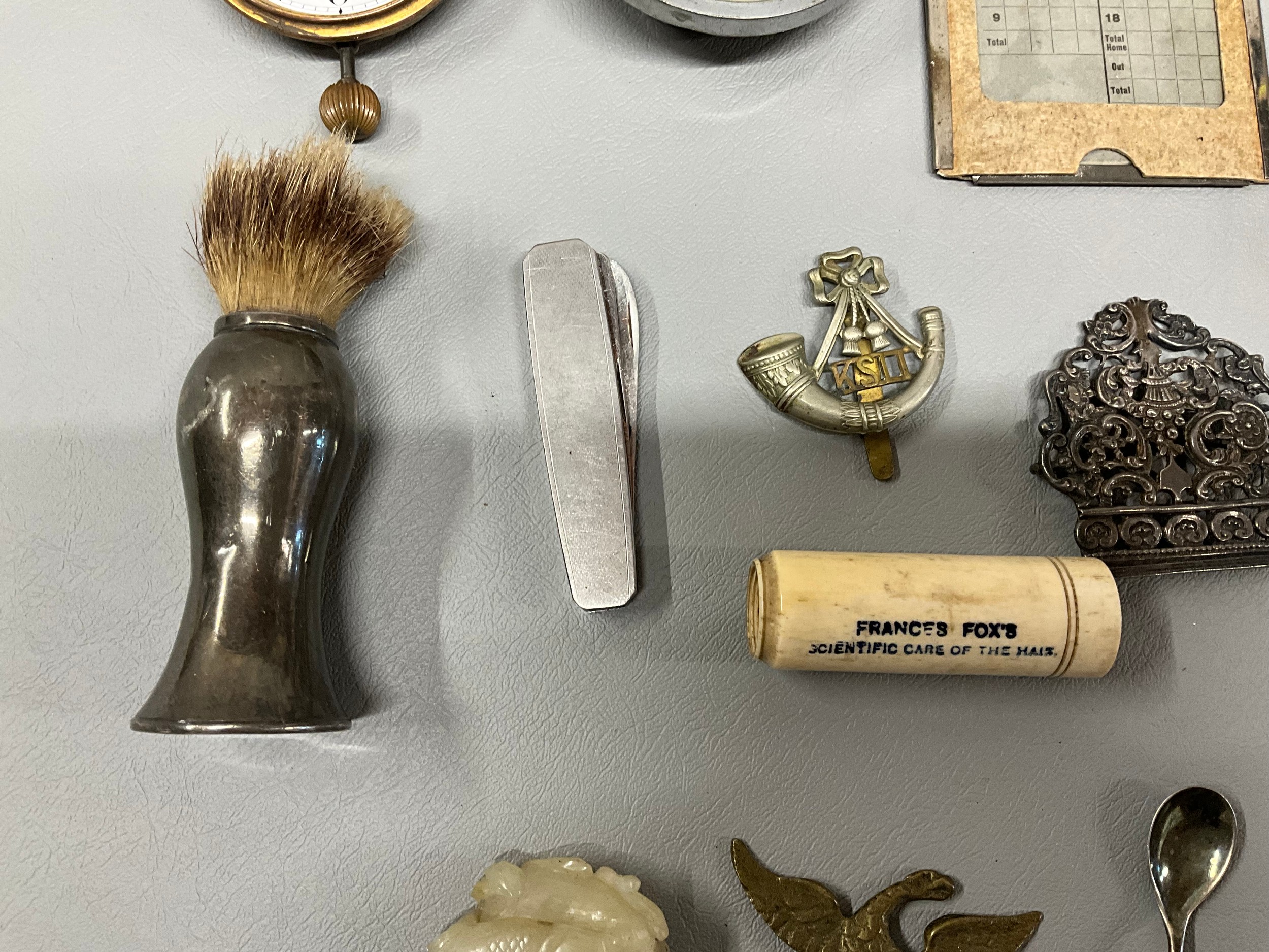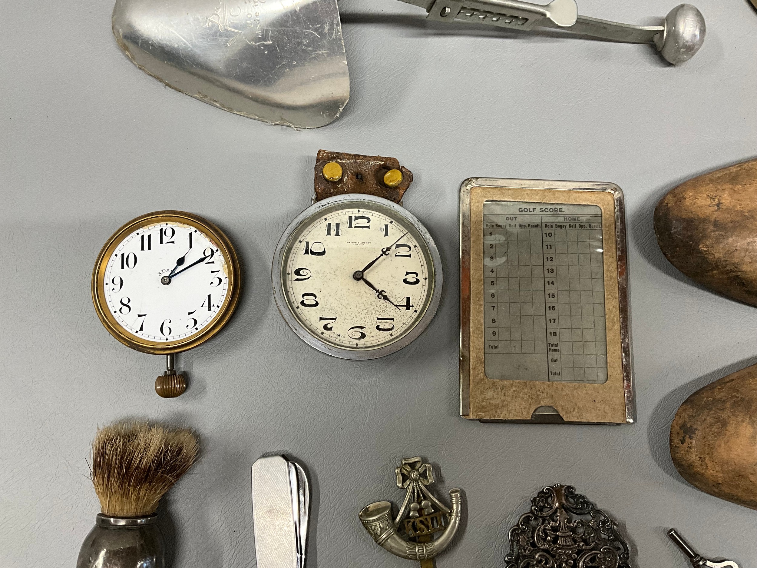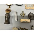 BOX OF VINTAGE COLLECTABLES - GOLF SCORE CARD BELLS CLOCKS HALLMARKED SILVER SHAVING BRUSH ETC