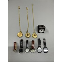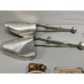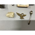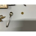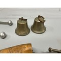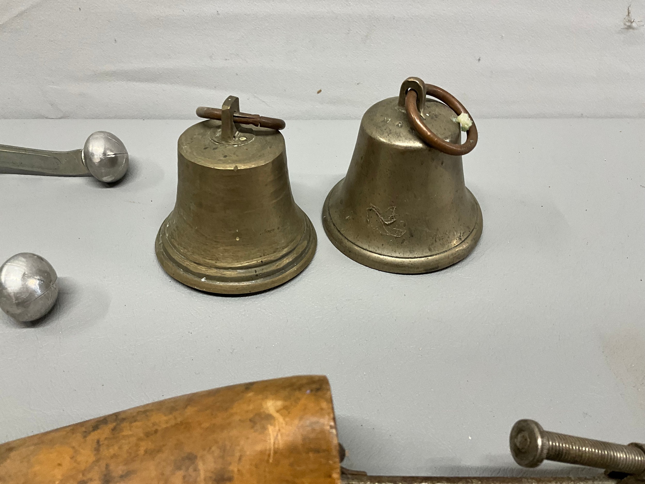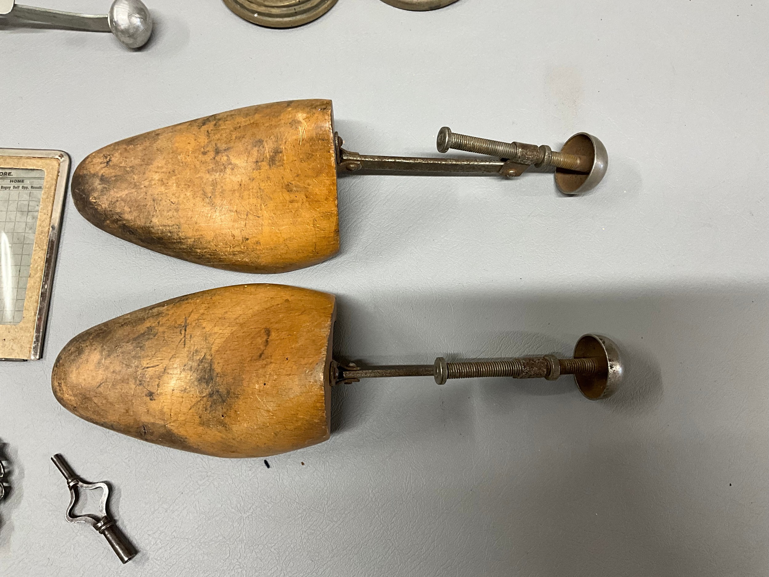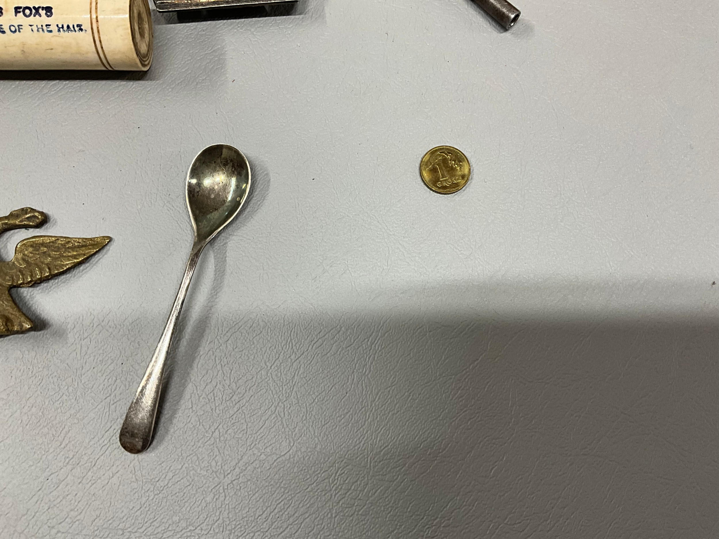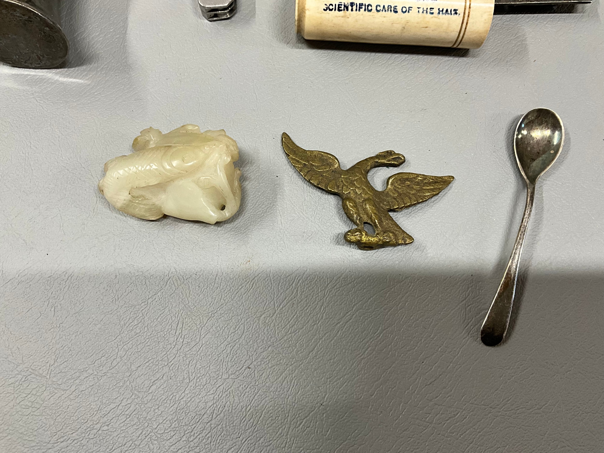 BOX OF VINTAGE COLLECTABLES - GOLF SCORE CARD BELLS CLOCKS HALLMARKED SILVER SHAVING BRUSH ETC