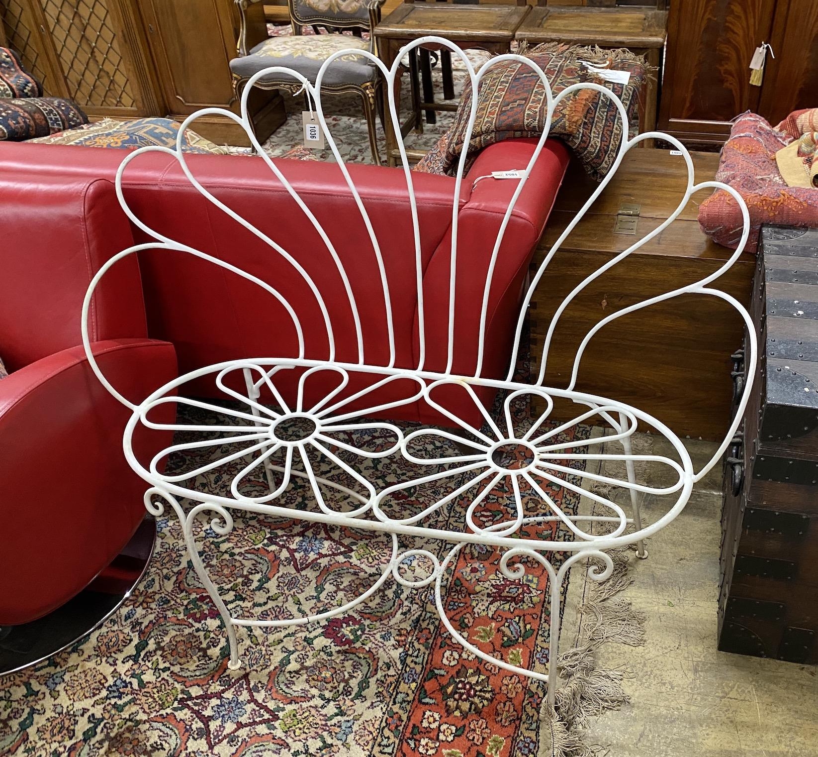 A painted wrought iron garden bench, length 113cm, depth 46cm, height 102cm