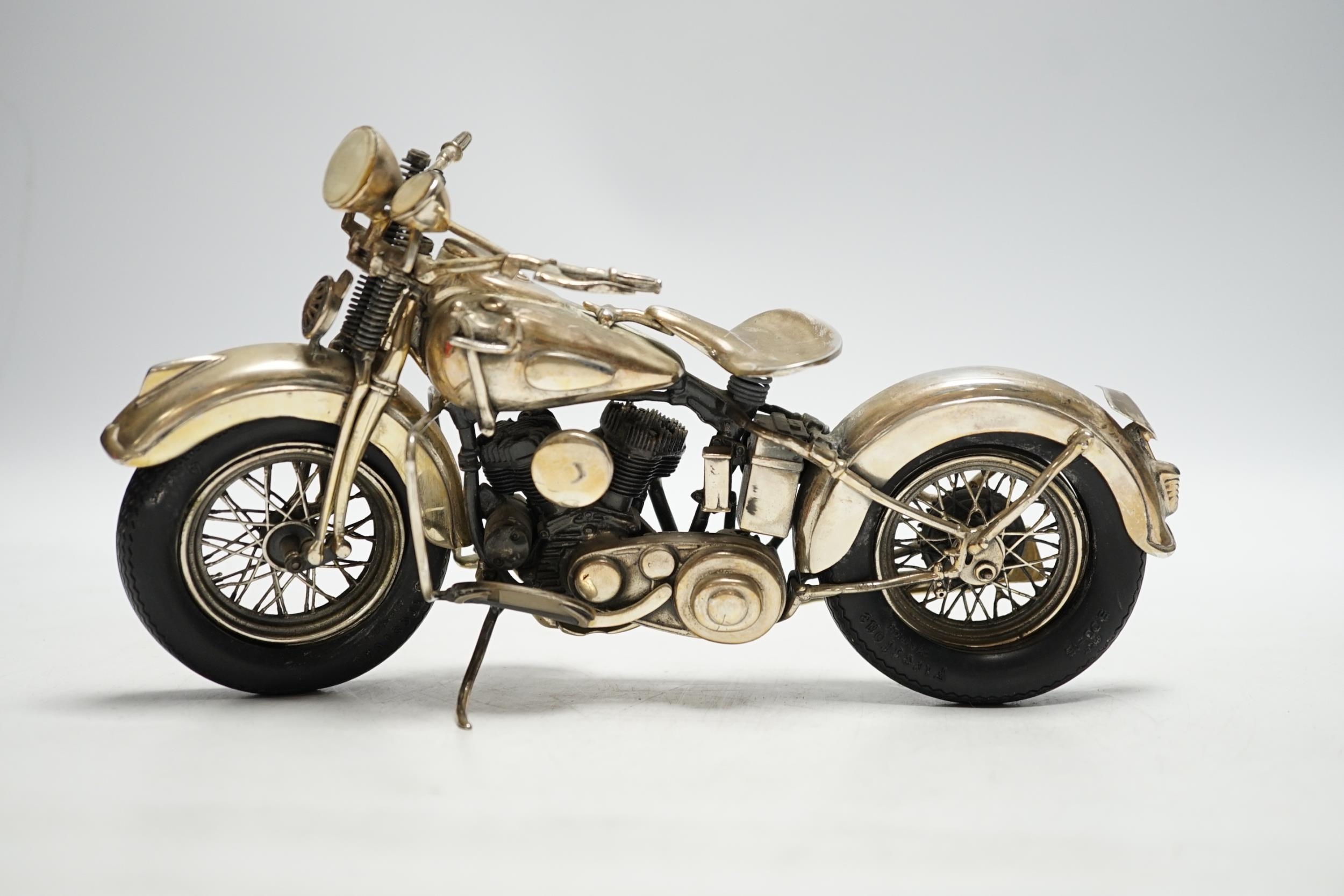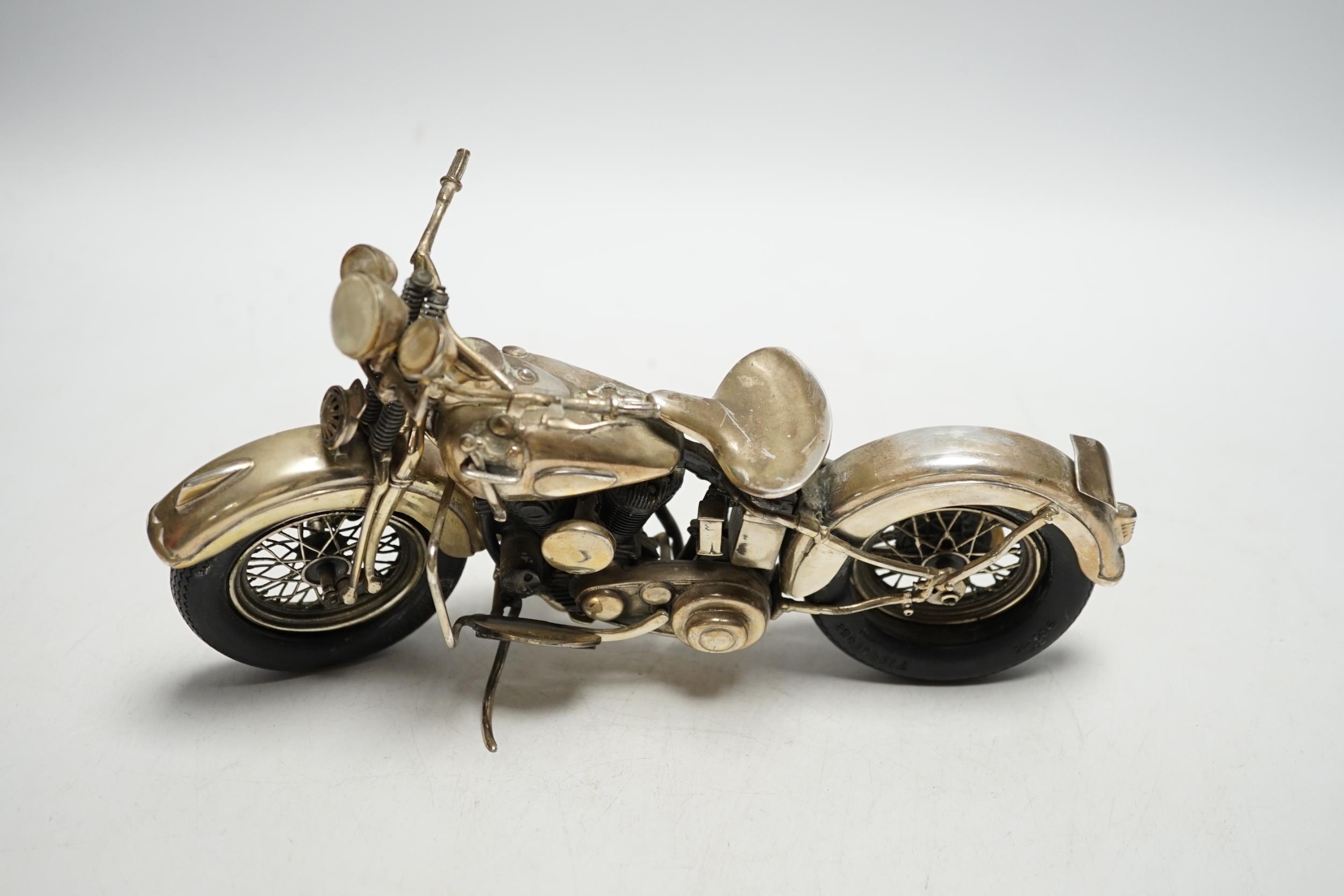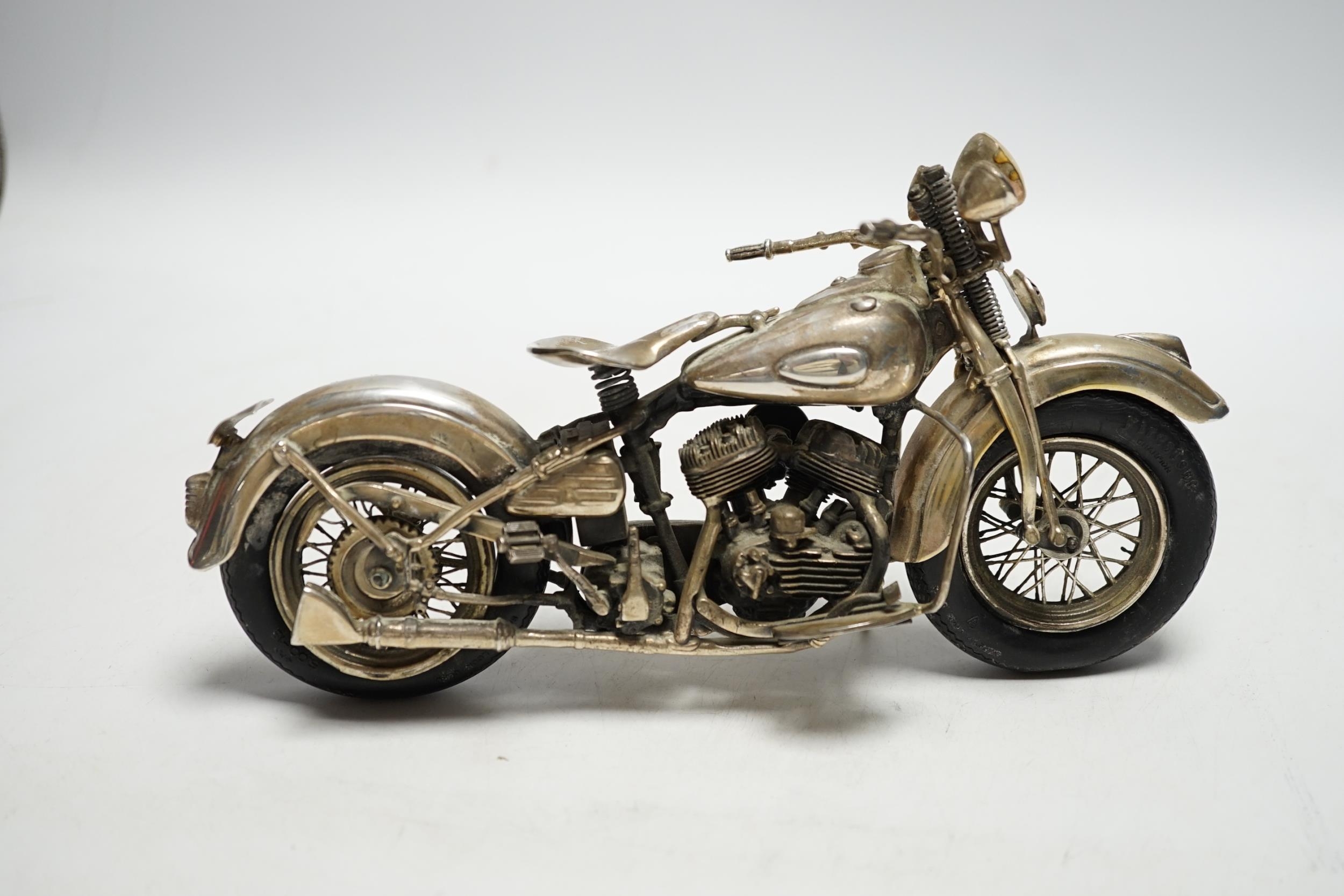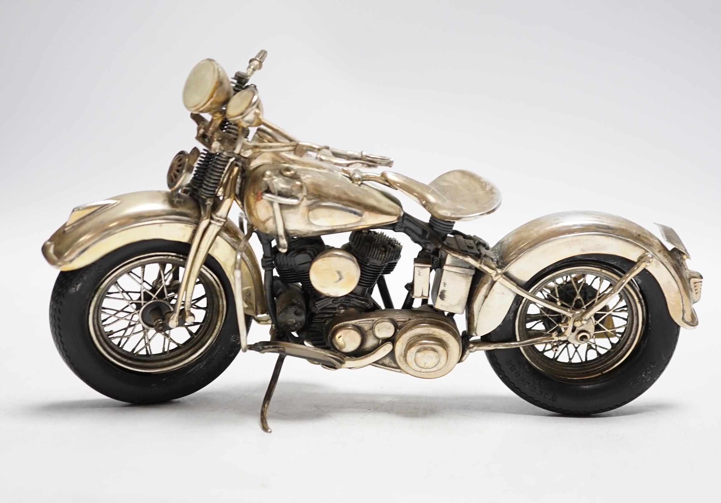 A late 1990's part silver miniature model of a Harley Davidson motor bike, Casa Julia International, London, 1997, length 23.3cm, gross weight 24.9oz.