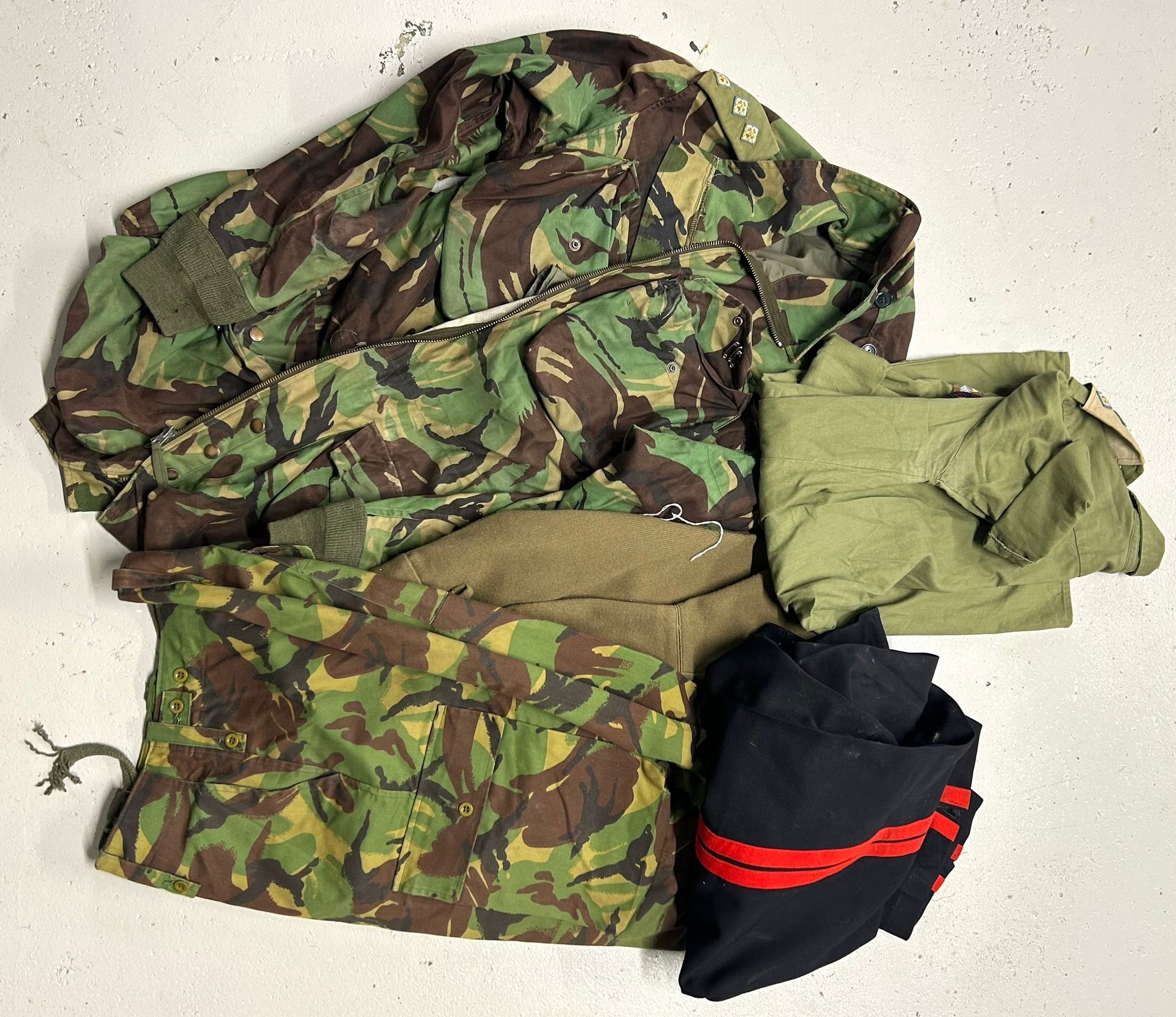 Various items of uniform to an officer in 10 para inc; 1968 pattern DPM combat smock with post war badges size 6, 1968 pattern DPM combat trousers size 6 also 2 pairs of lightweight trousers etc. GC