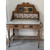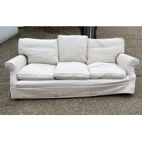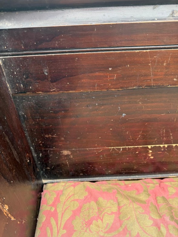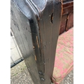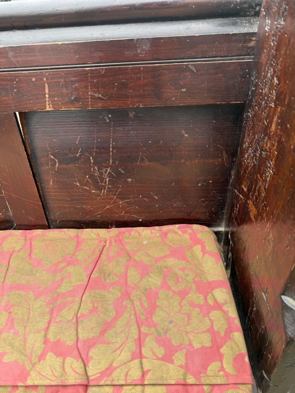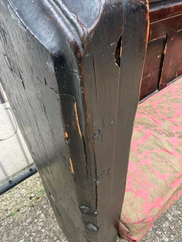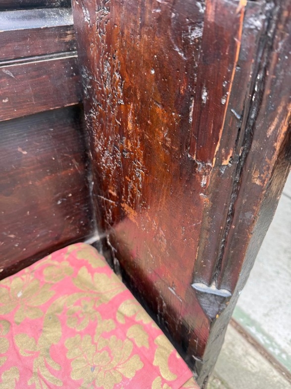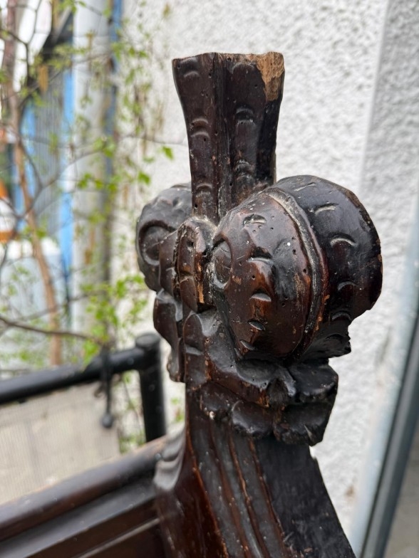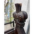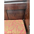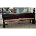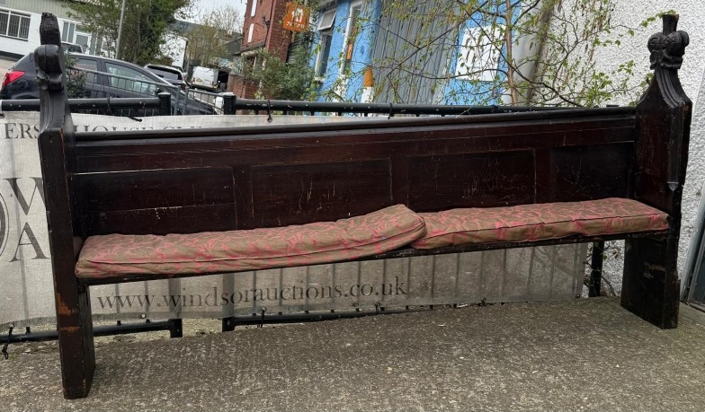 A part oak church pew with paneled back and carved ornamental ends H123cm W228cm D33cm
