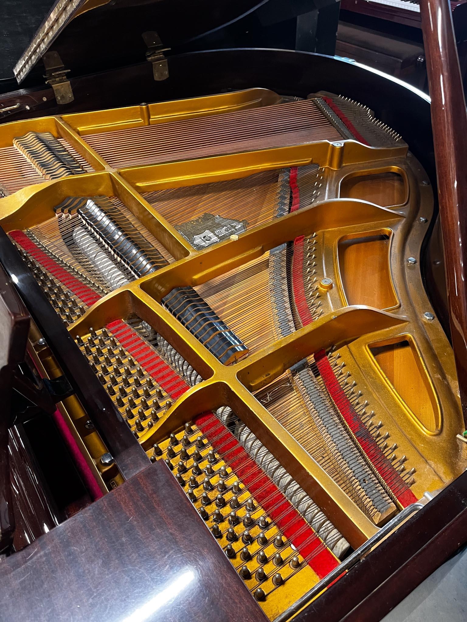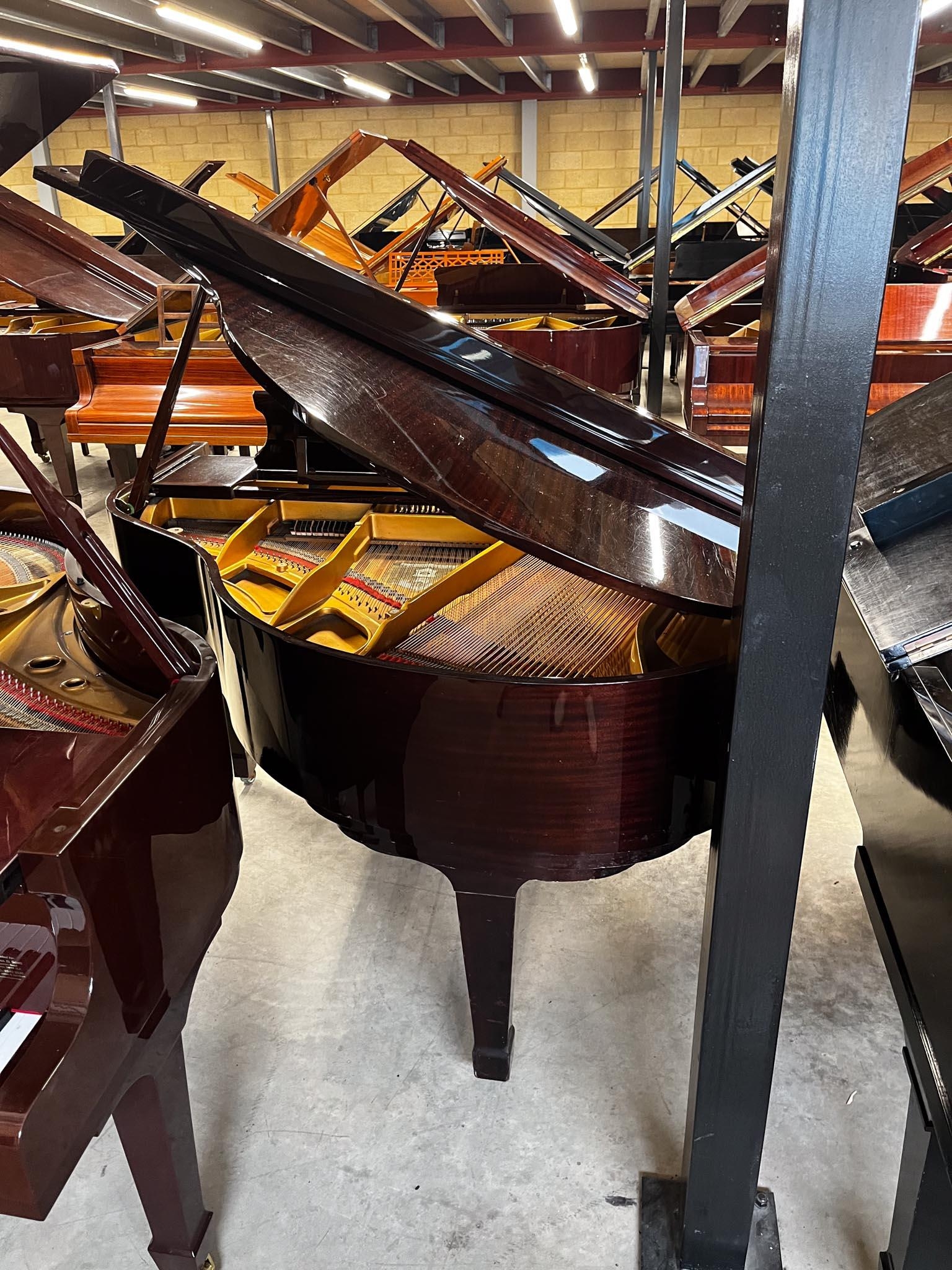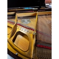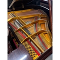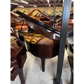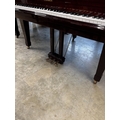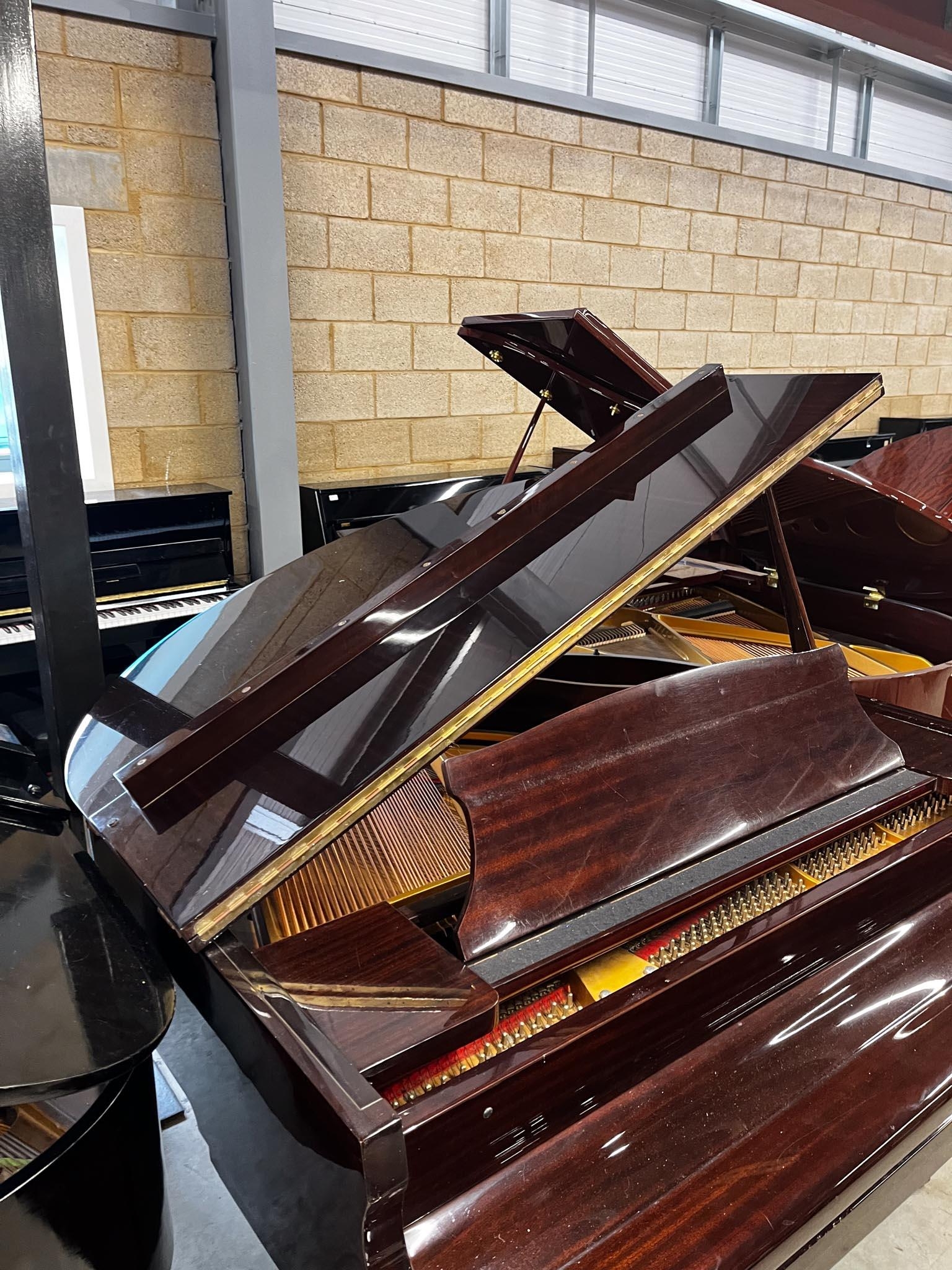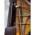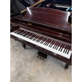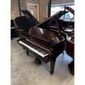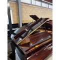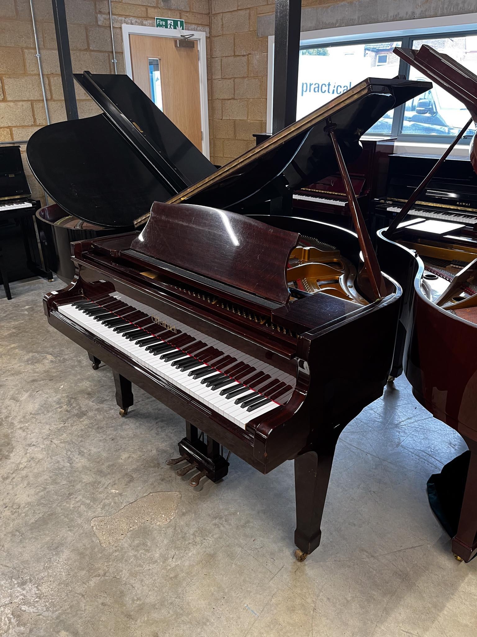 A recent 5ft grand piano in a bright mahogany case on square tapered legs; together with a stool. AMENDMENT Is 4ft 8in.