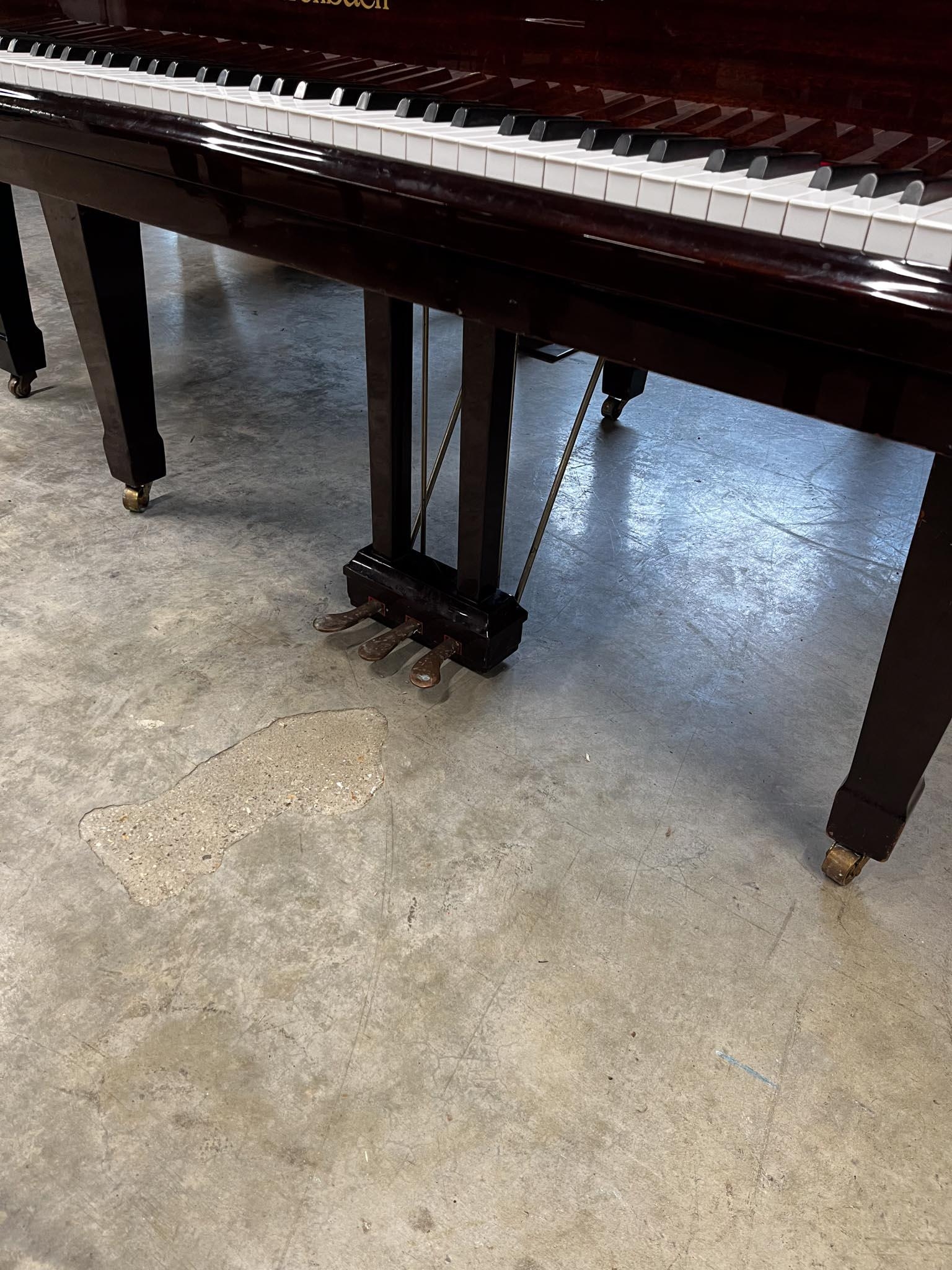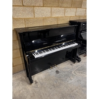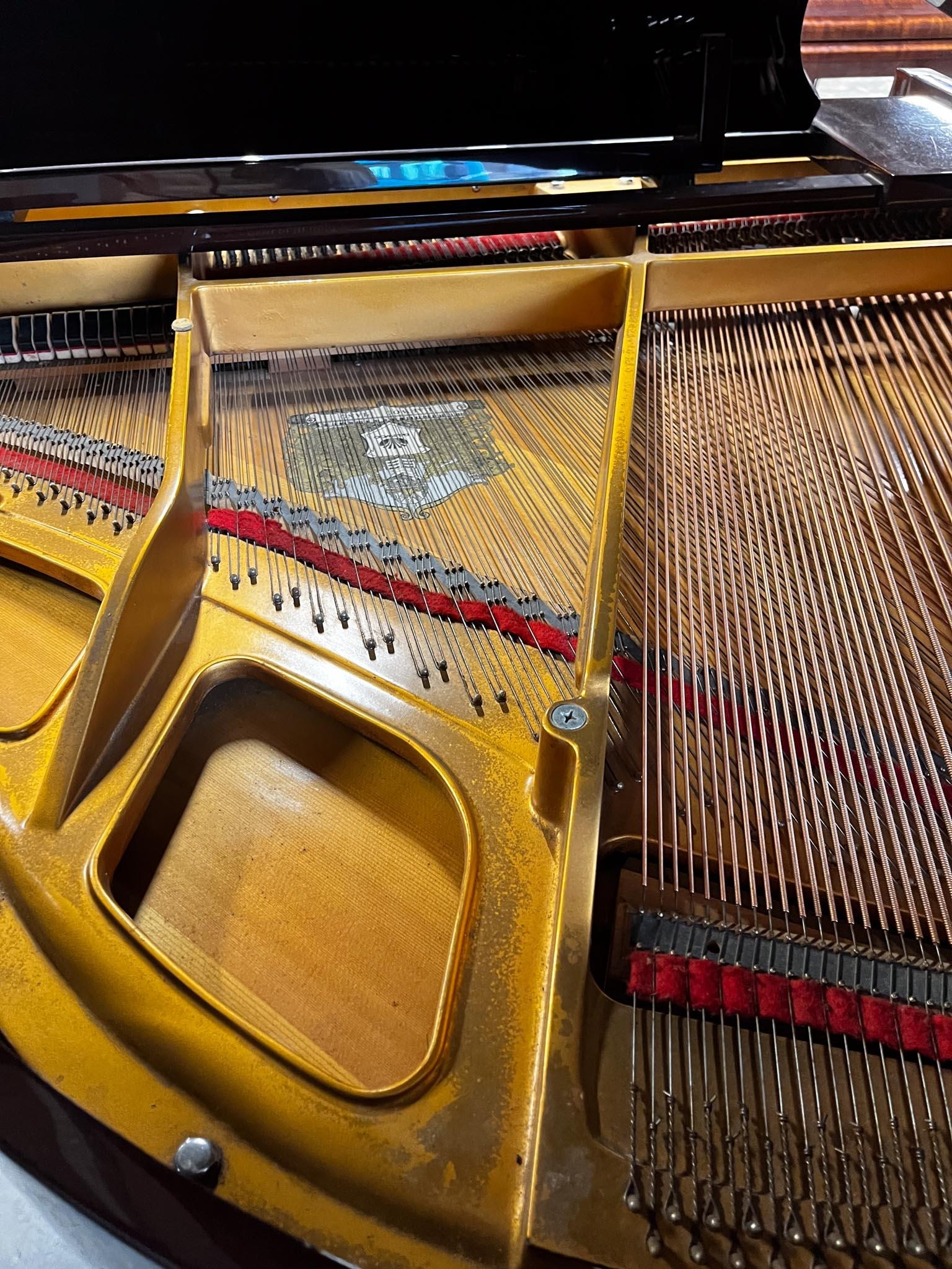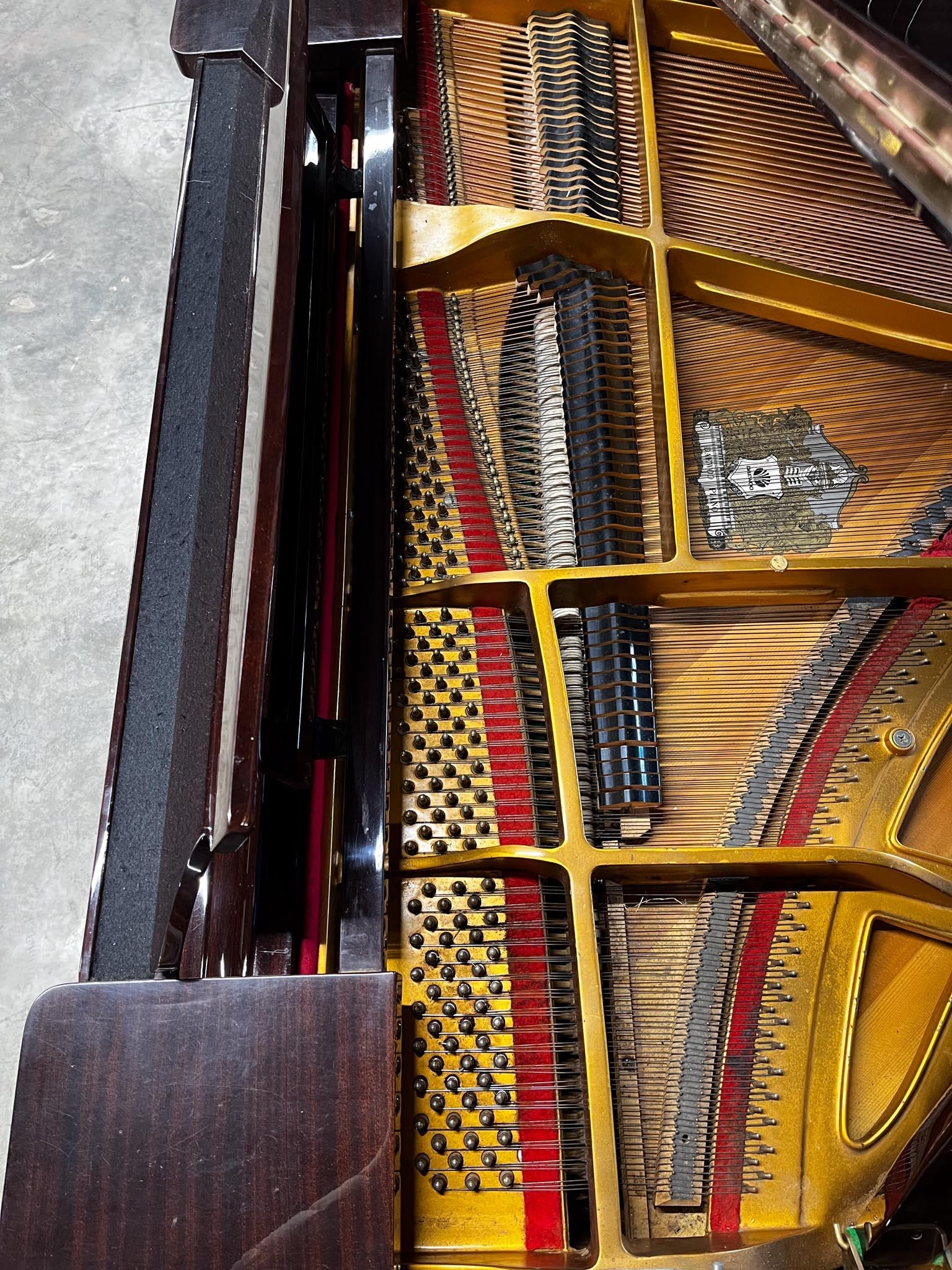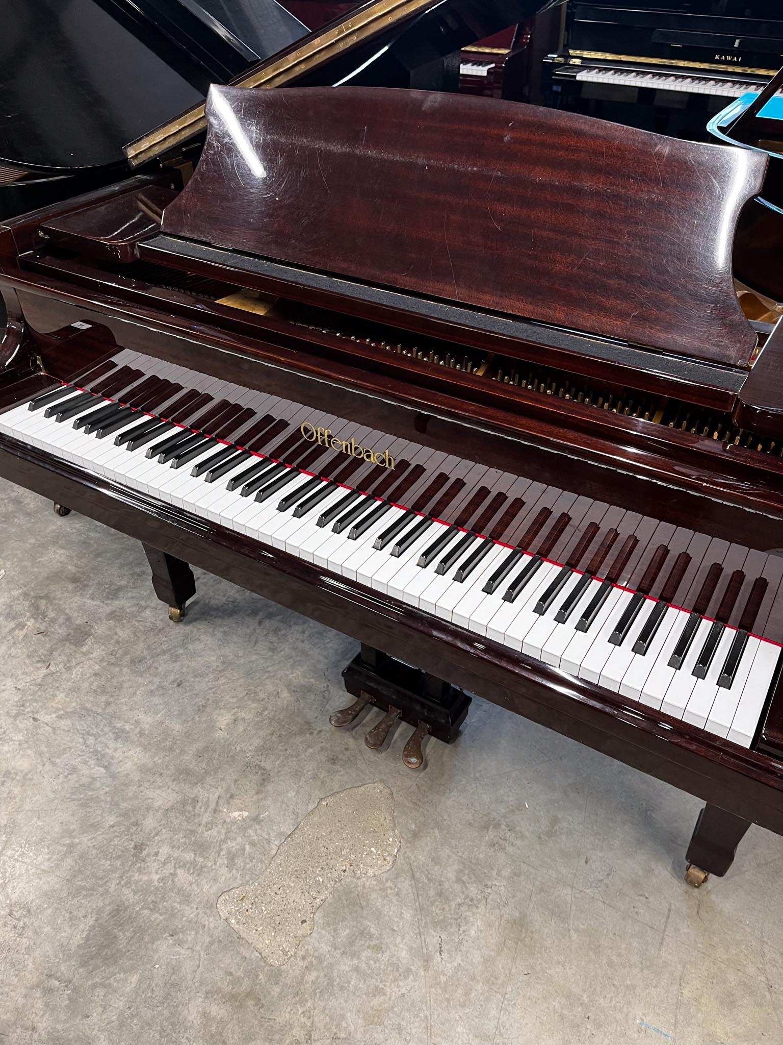 A recent 5ft grand piano in a bright mahogany case on square tapered legs; together with a stool. AMENDMENT Is 4ft 8in.