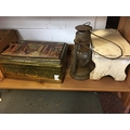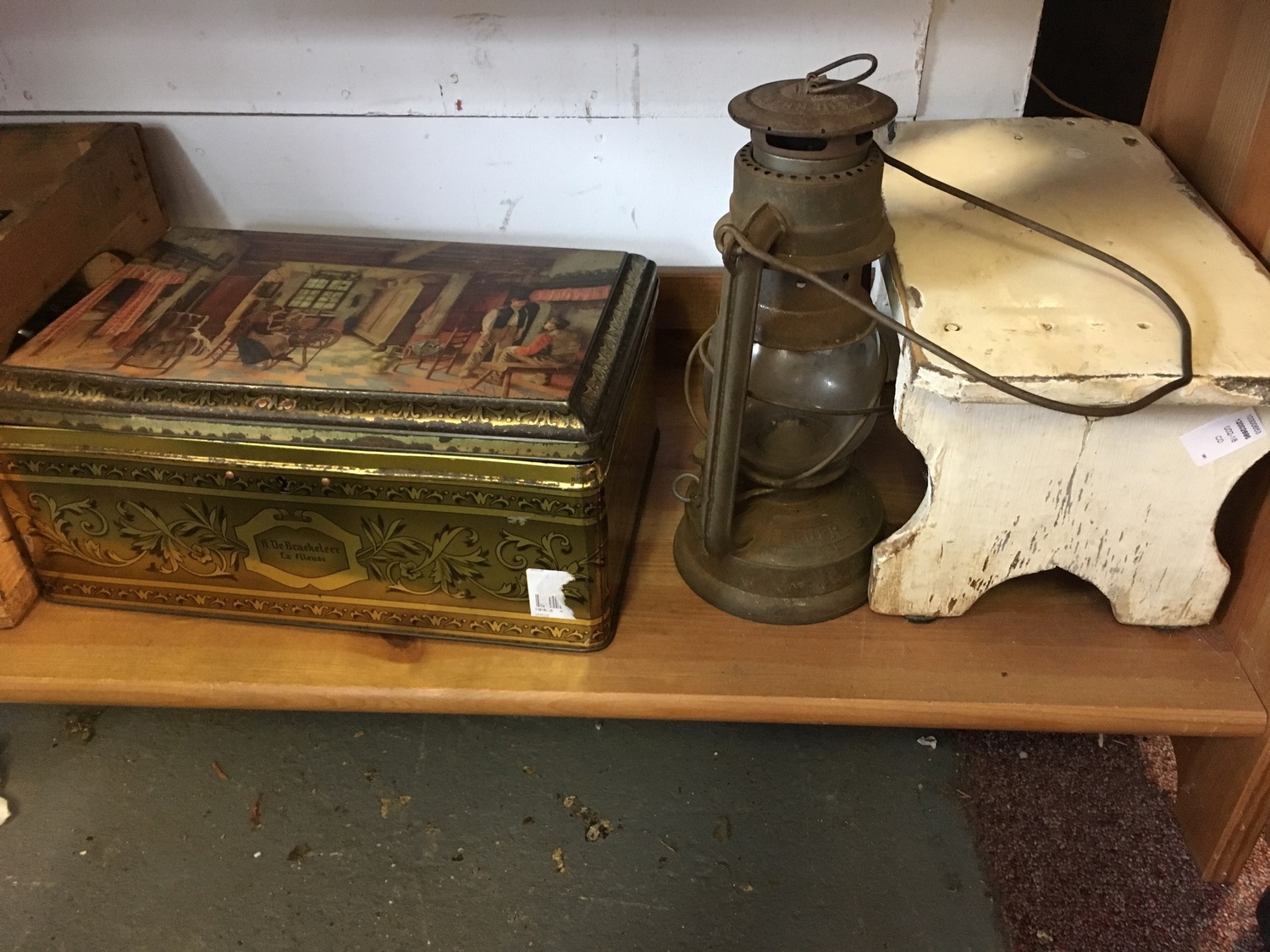 A small painted stool, a French tin, an oil lamp etc -