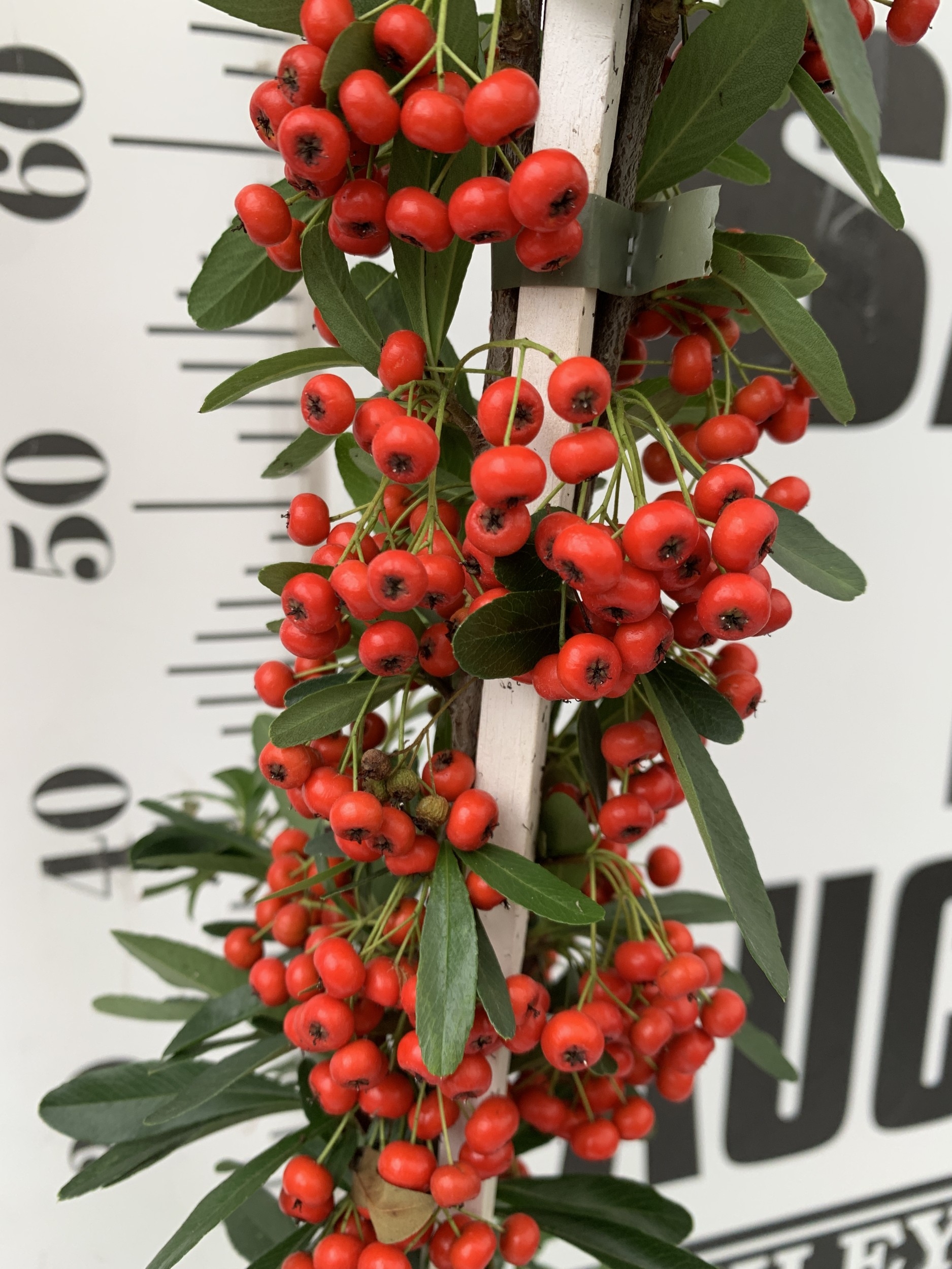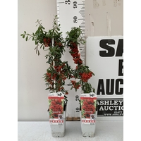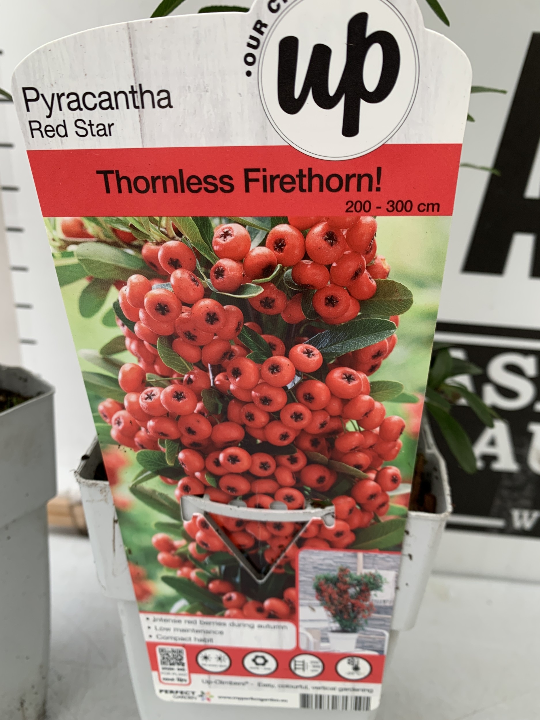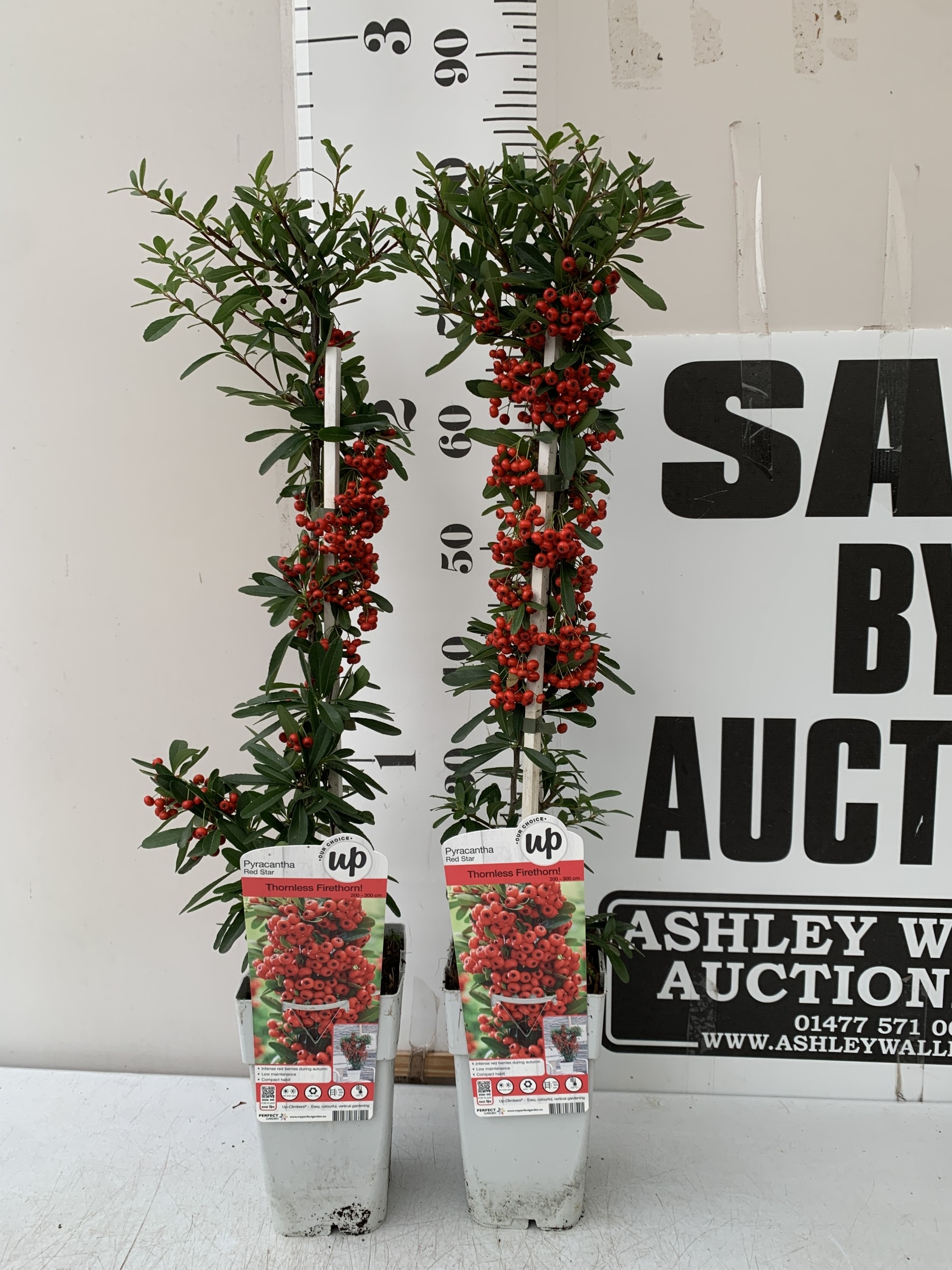TWO PYRACANTHA COCCINEA 'RED STAR' THORNLESS SCARLET FIREHORN. INTENSE RED BERRIES THROUGHOUT AUTUMN, APPROX 80CM TALL IN 2 LTR TALL POTS. TO BE SOLD FOR THE TWO