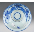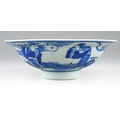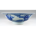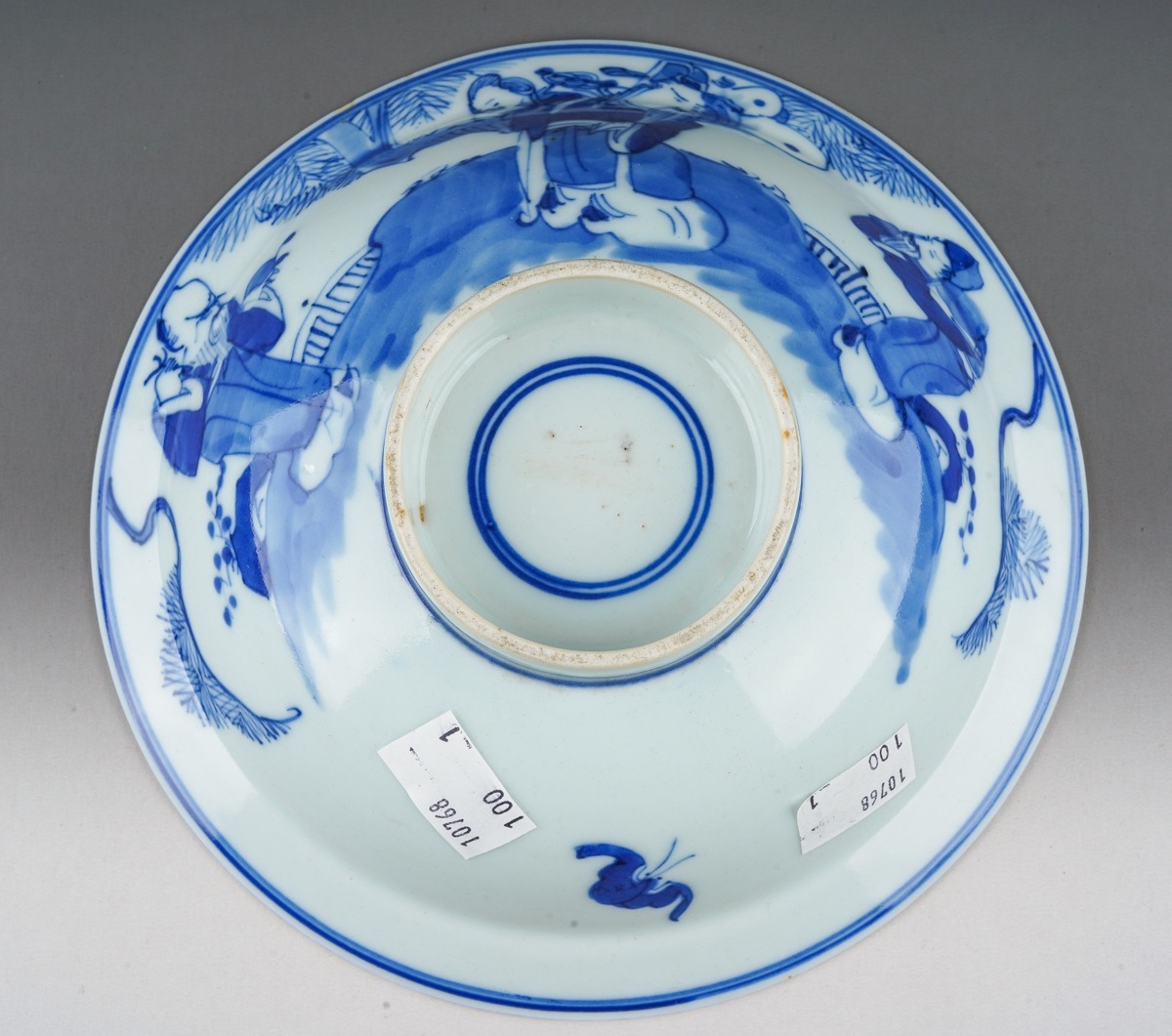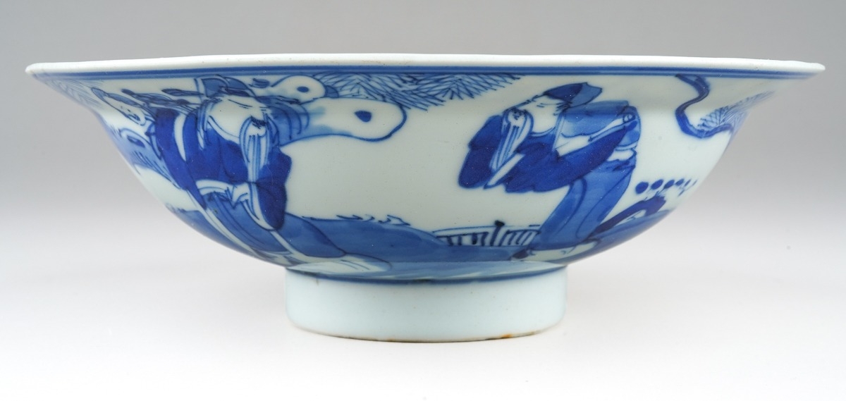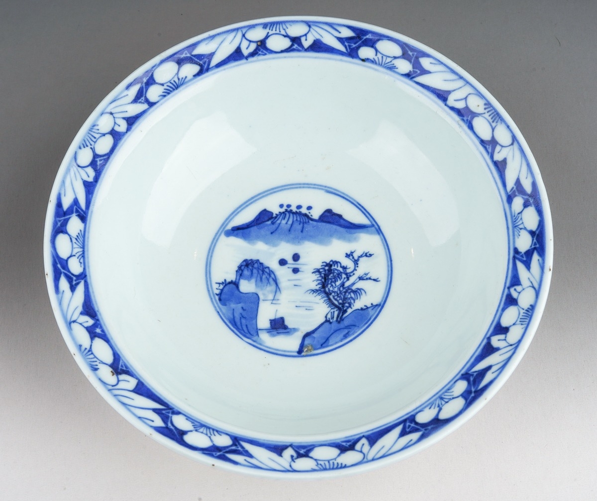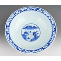 A 19th century Chinese blue and white shallow bowl, interior with roundel depicting a coastal scene, the exterior decorated with the Three Star Gods, short foot, unmarked, diameter 18.9cm