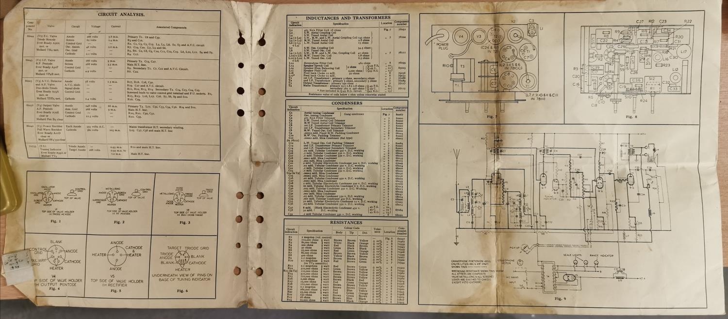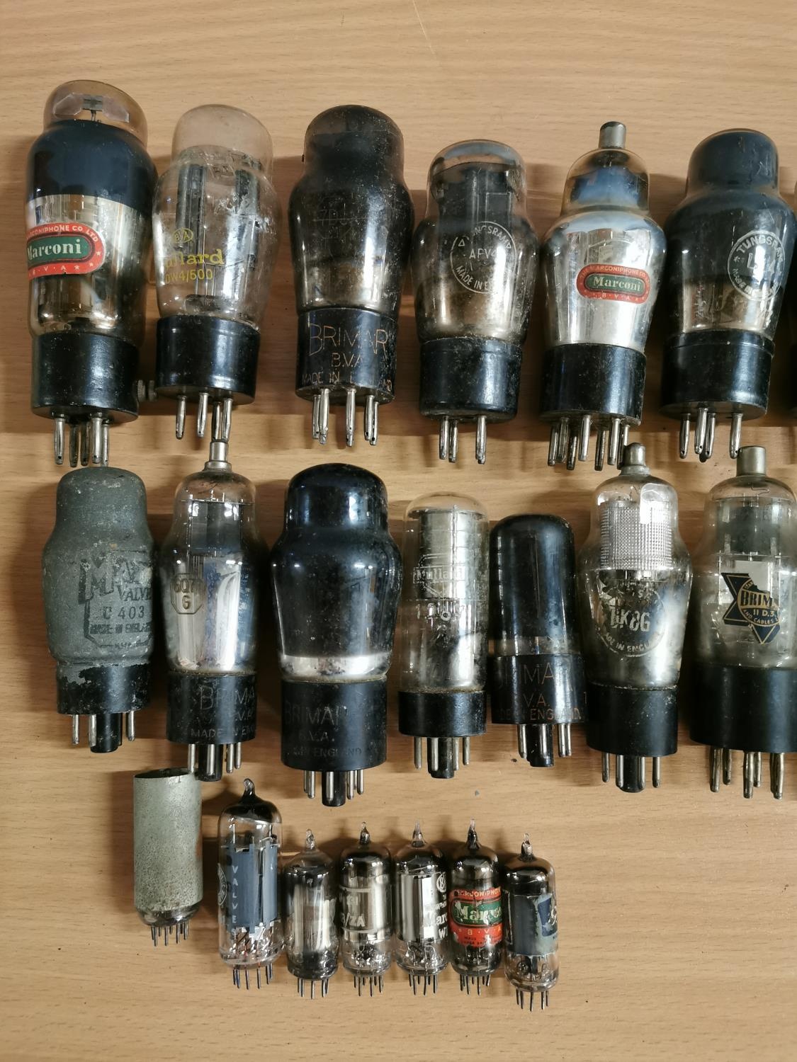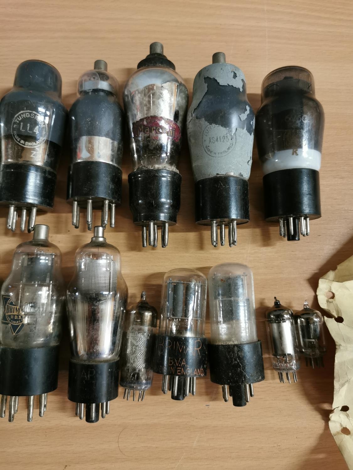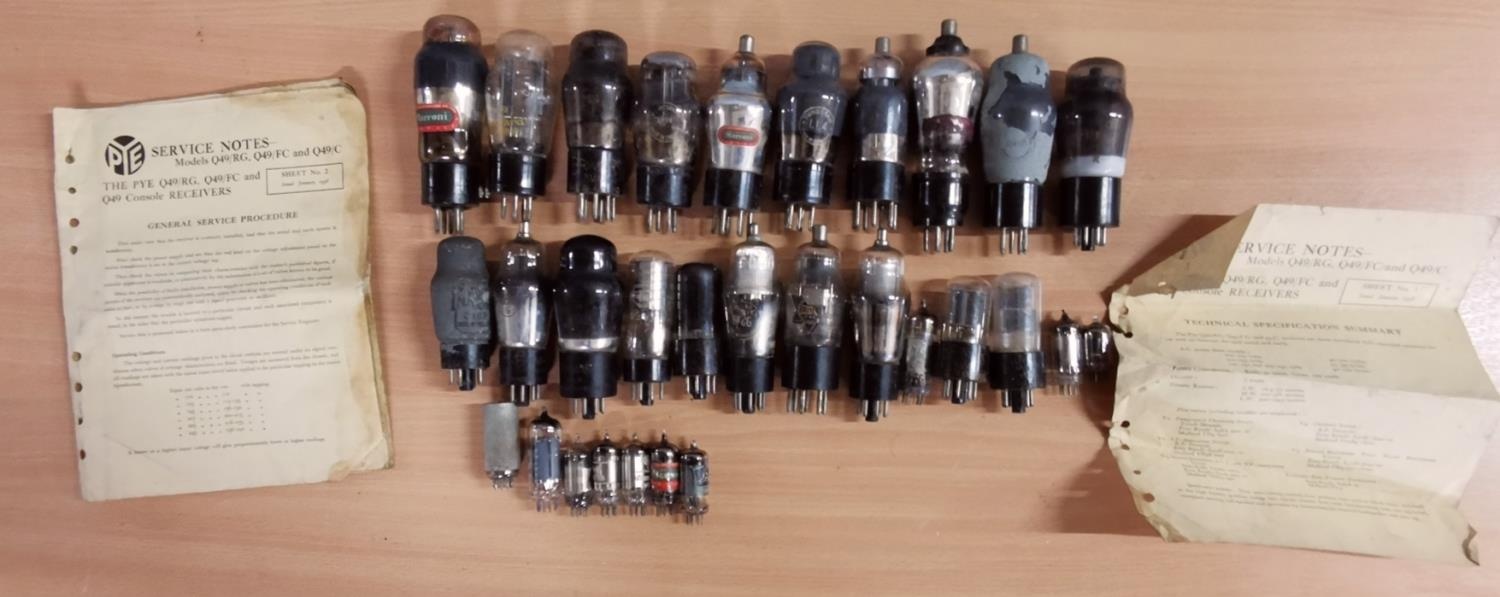 Bundle of assorted size and make vintage radio valves & service procedure & technical spec for PYE Q49 receivers dated 1938