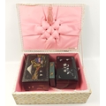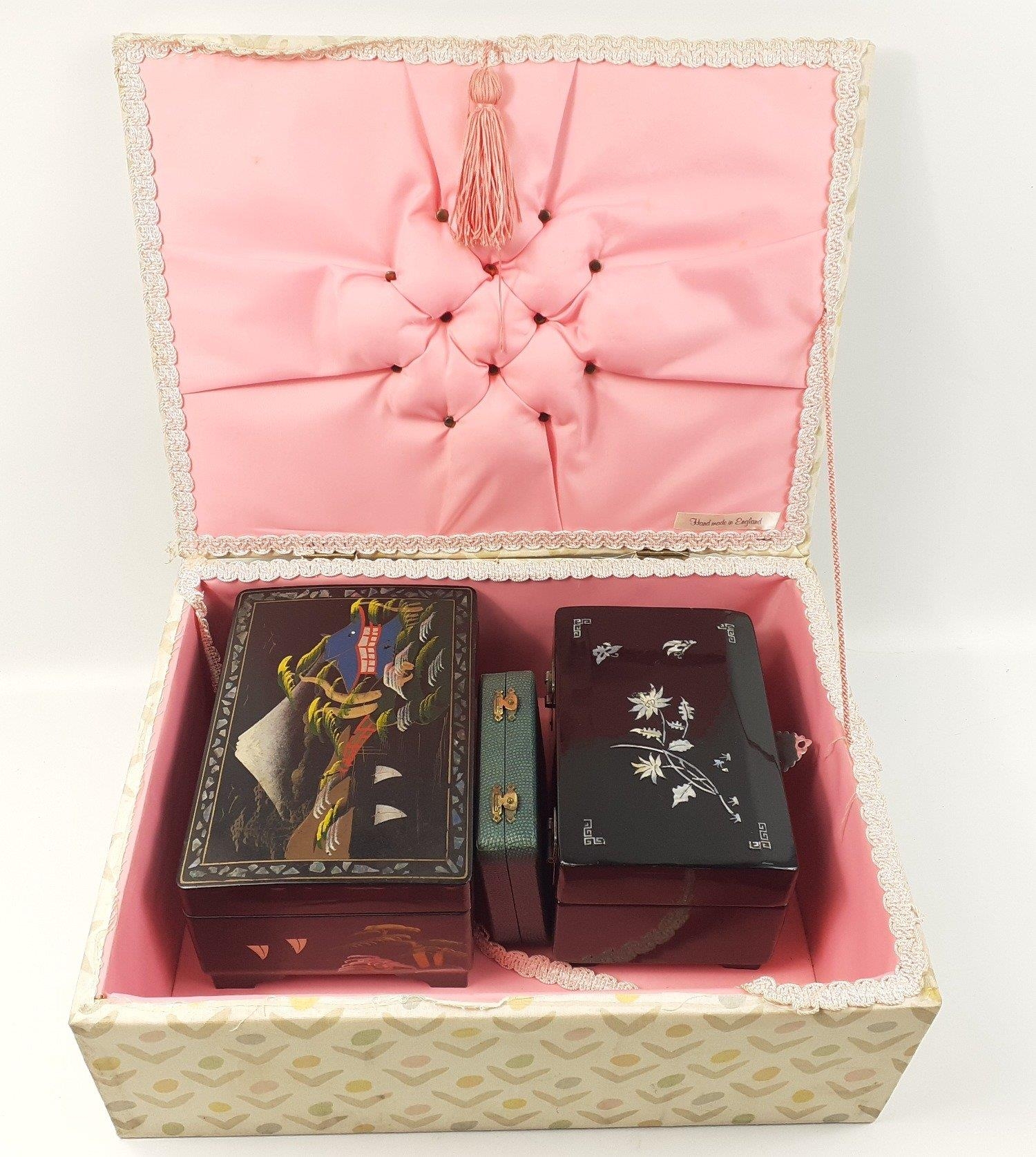 A plush silk lined box containing two musical jewellery boxes in good useable condition and a set of plated spoons