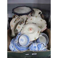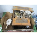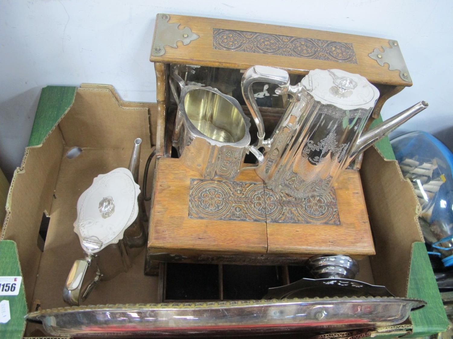 A Late XIX Century Plated Tea Coffee Pot, sugar bowl, oak tantalus, (no bottles), oval tray, etc:- One Box.