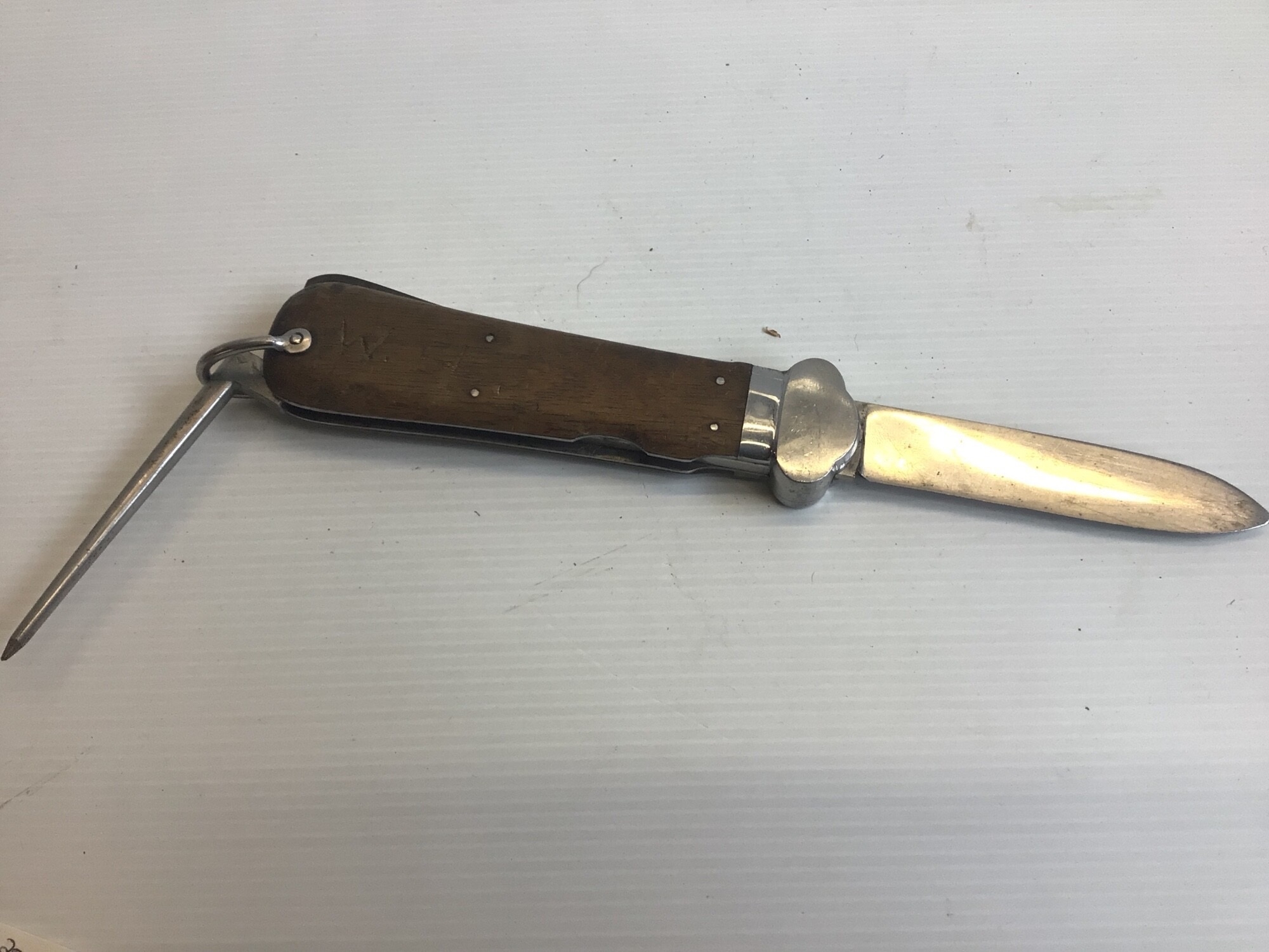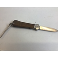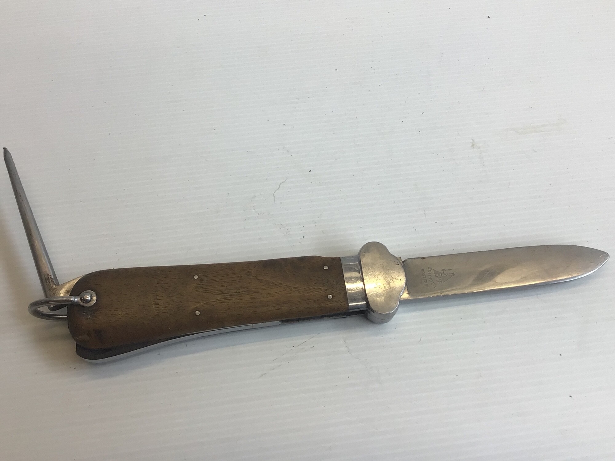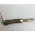 A German Third Reich Luftwaffe II world war Paratroopers gravity Knife with a wood grip maker SMF Solingen.