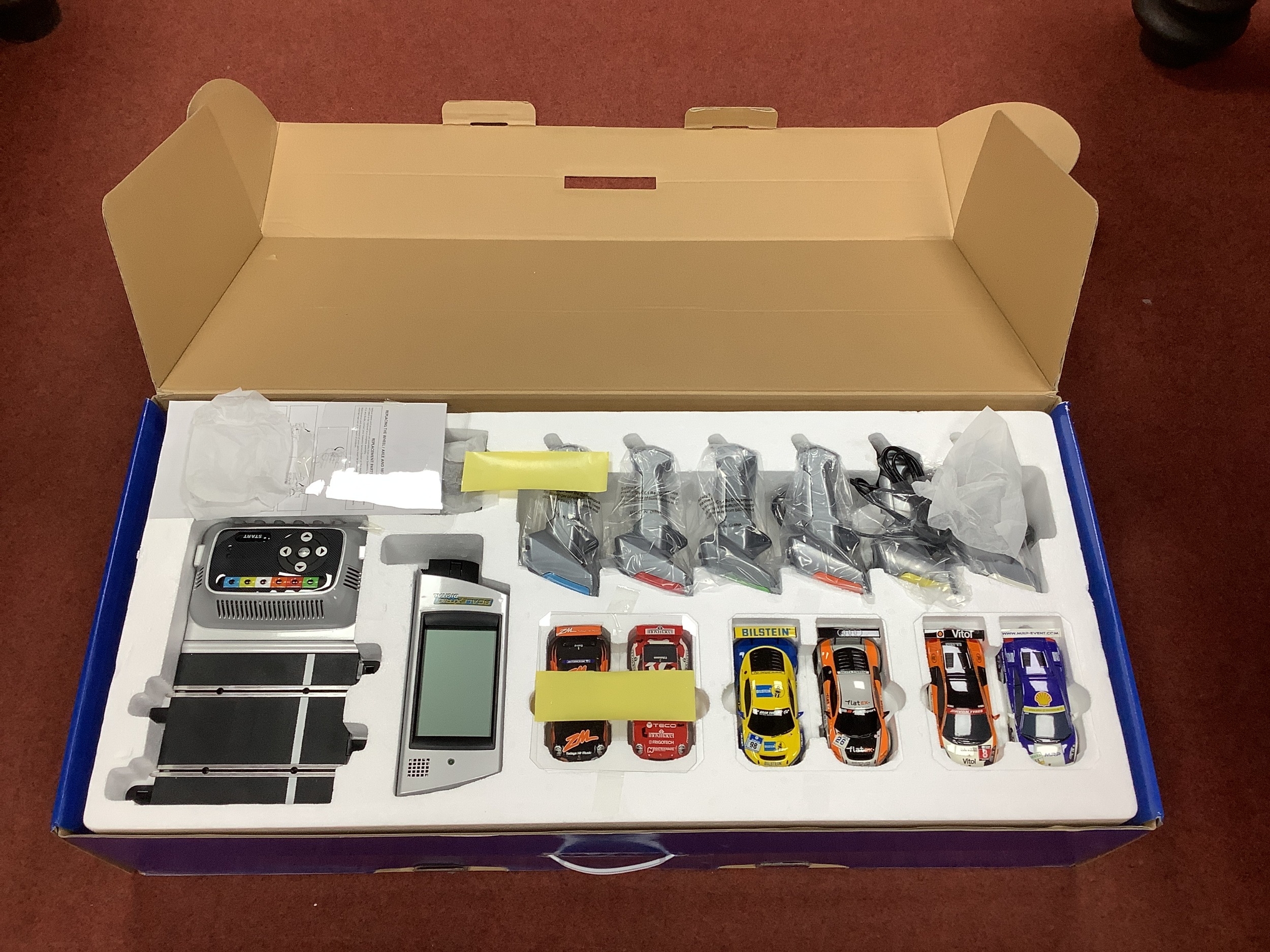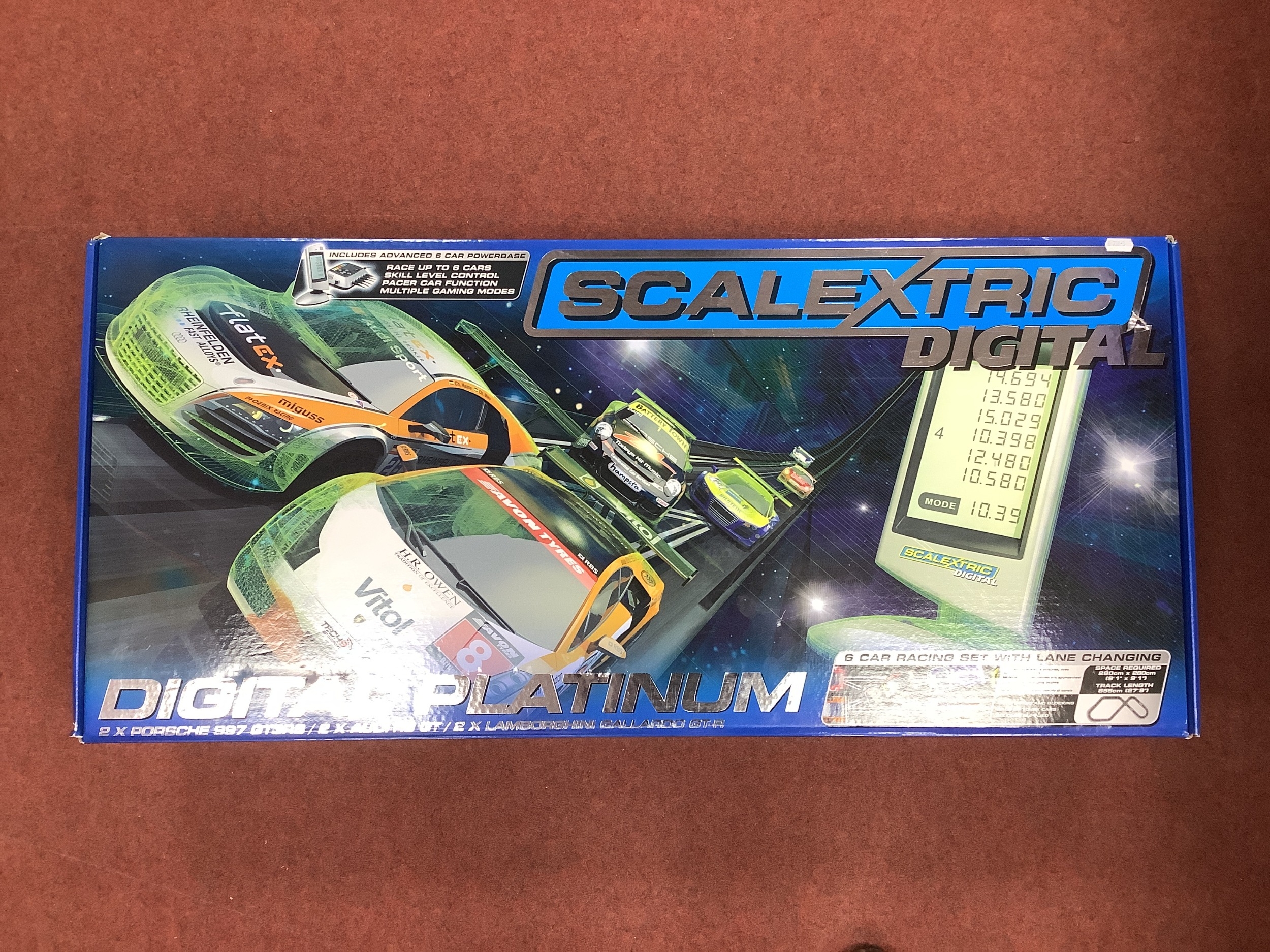 A Scalextric Digital Platinum #C1276 1:32 6 Car Racing Set With Lane Changing, including 2 x Porsche 997 GT3RS, 2 x Audi R8 GT, 2 x Lamborghini Gallardo GT-R slot cars. Some minor damage to box noted.