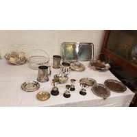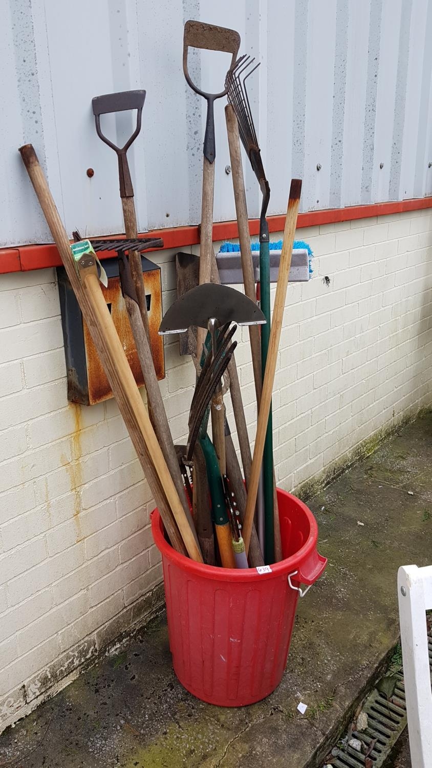 Red Plastic Garden Bin & Quantity of Garden Tools.