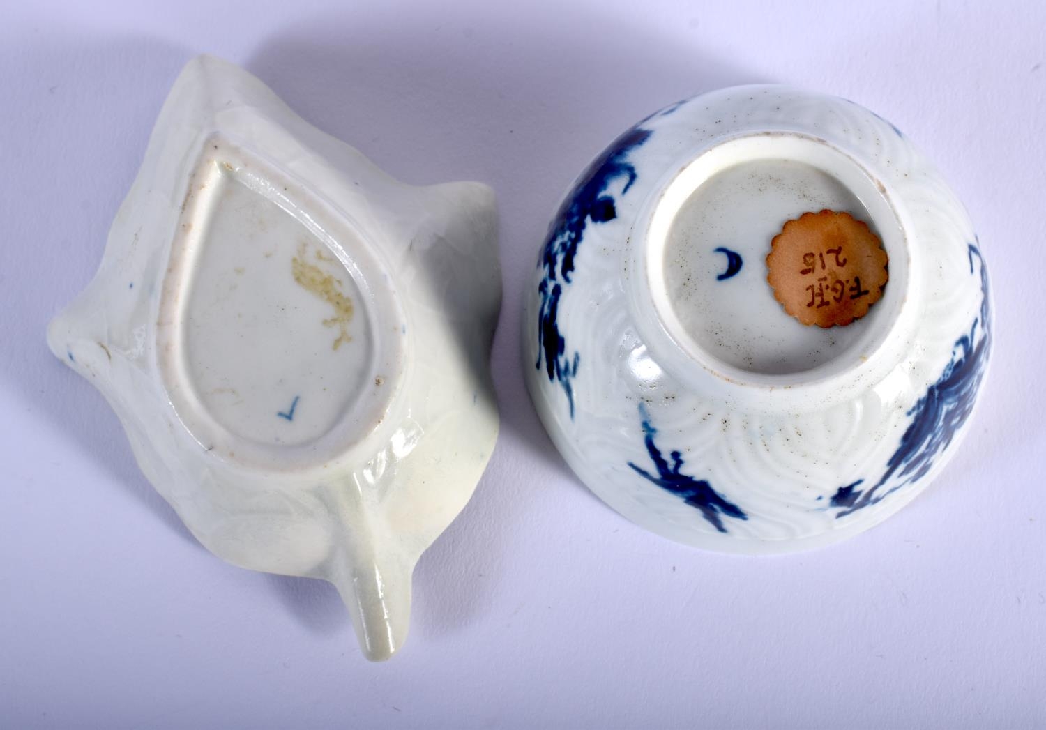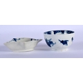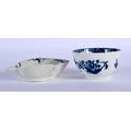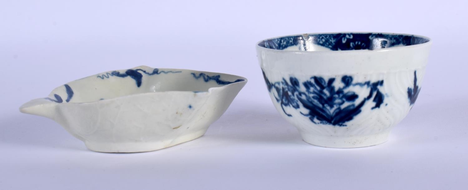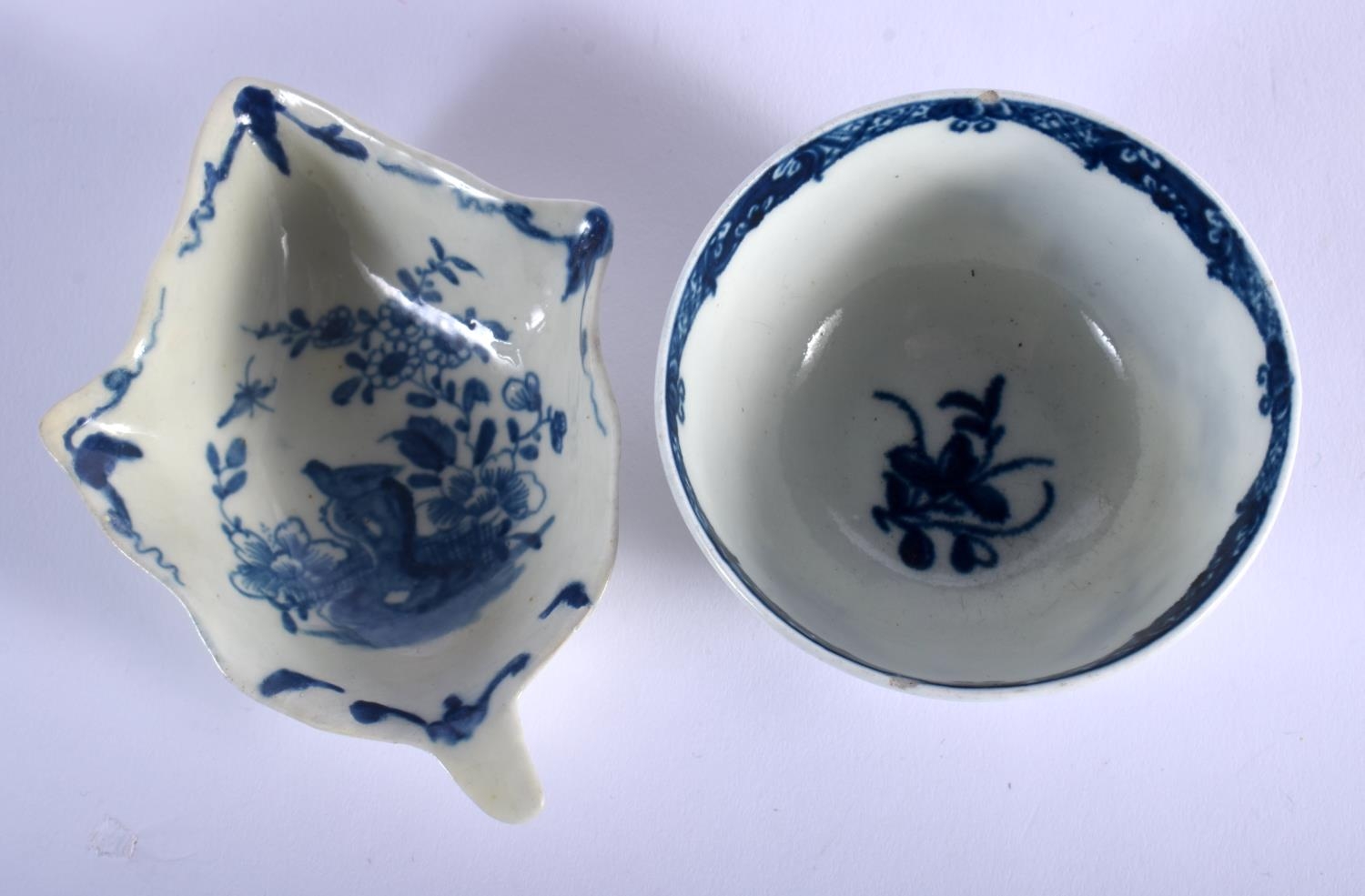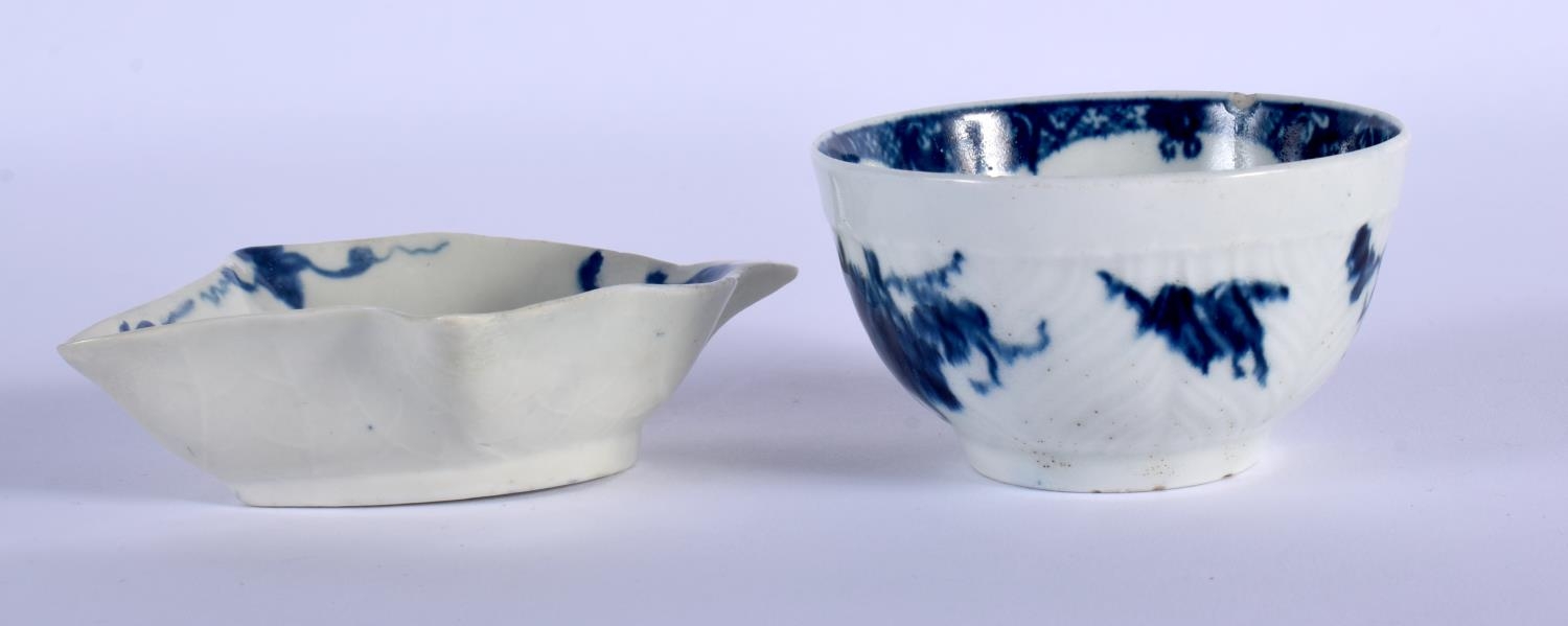 18TH C. WORCESTER 'RARE' TEABOWL PAINTED WITH FEATHER MOULD BIRDS AND AN EARY WORCESTER EARLY LEAF SHAPED DISH PAINTED WITH THE TWO PEONY ROCK BIRD PATTERN. Tea bowl 4cm high, dish 10.5cm length (2)