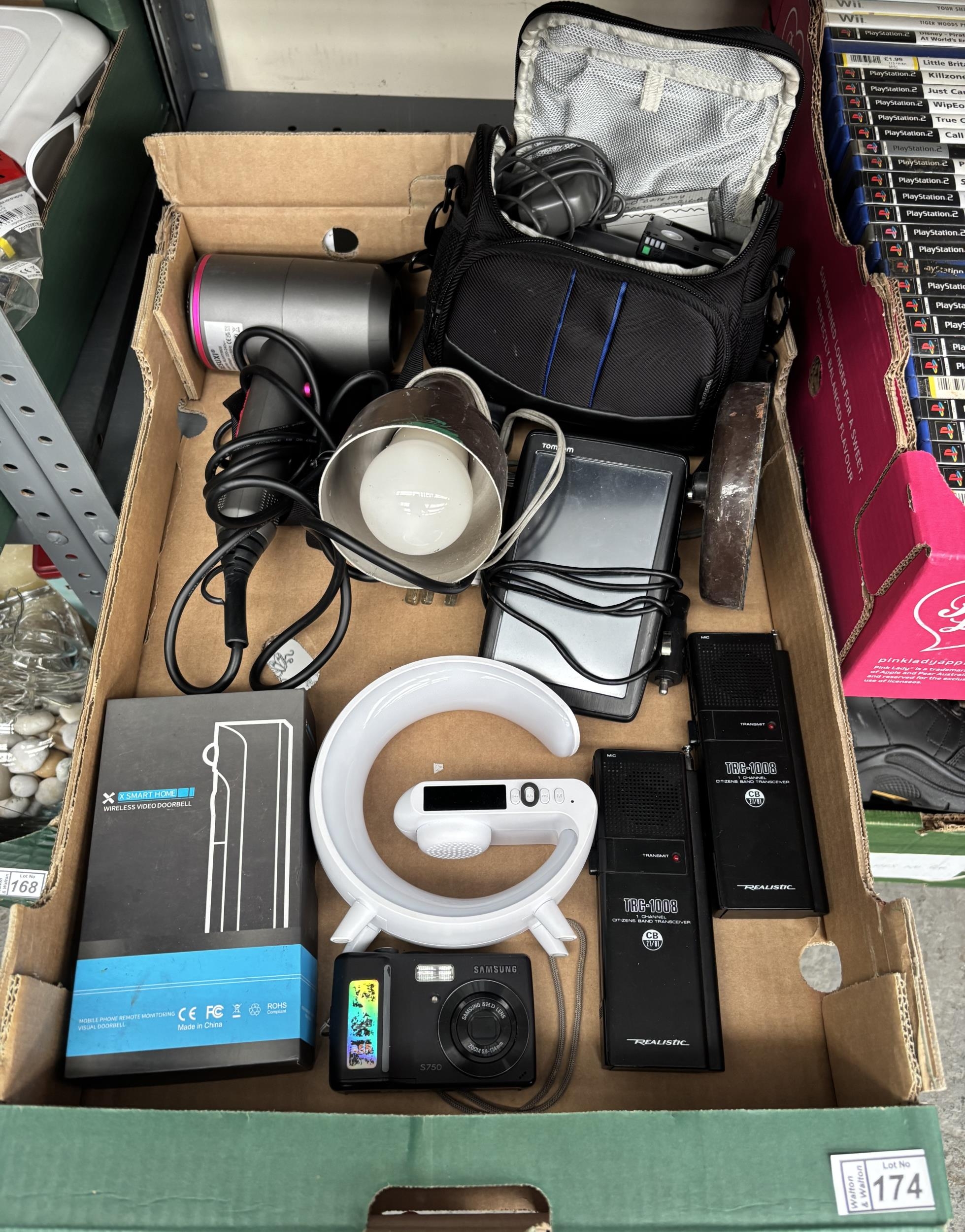Box containing electronics including Realistic transceivers, wireless doorbell, TomTom sat nav etc