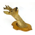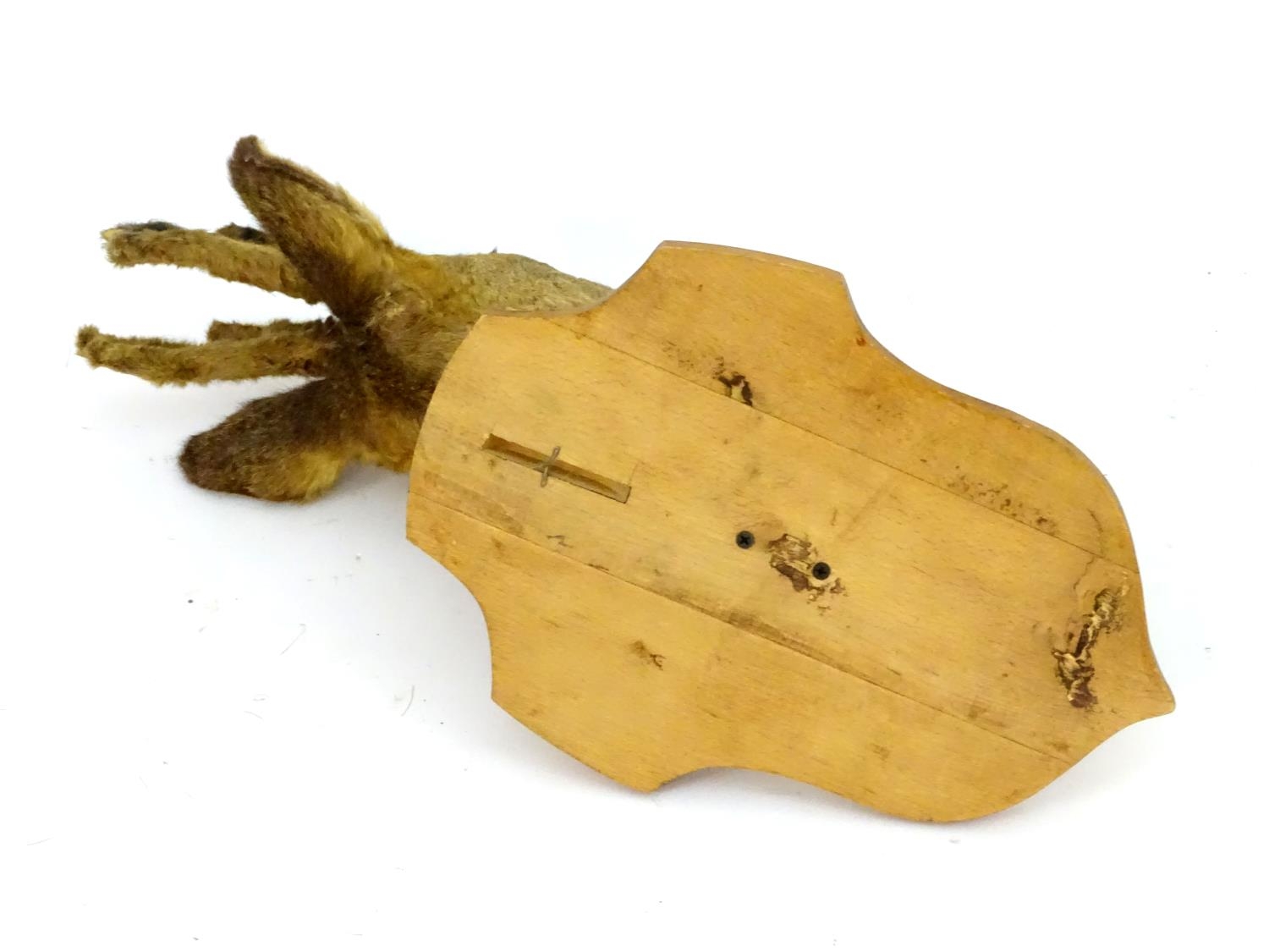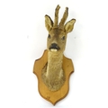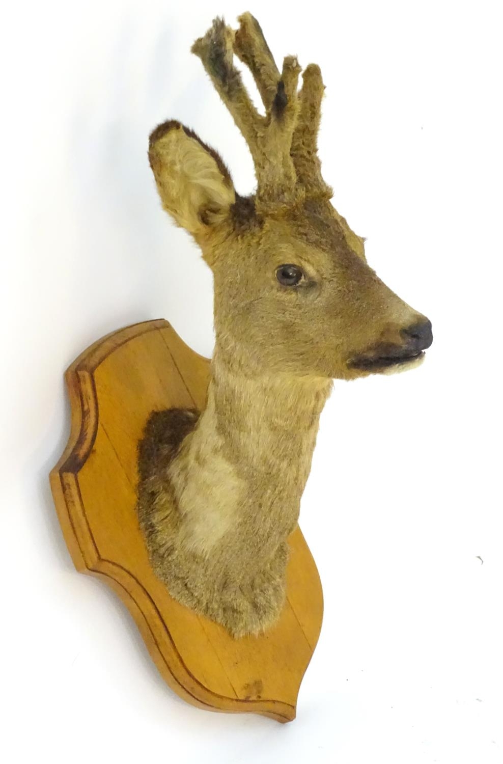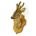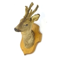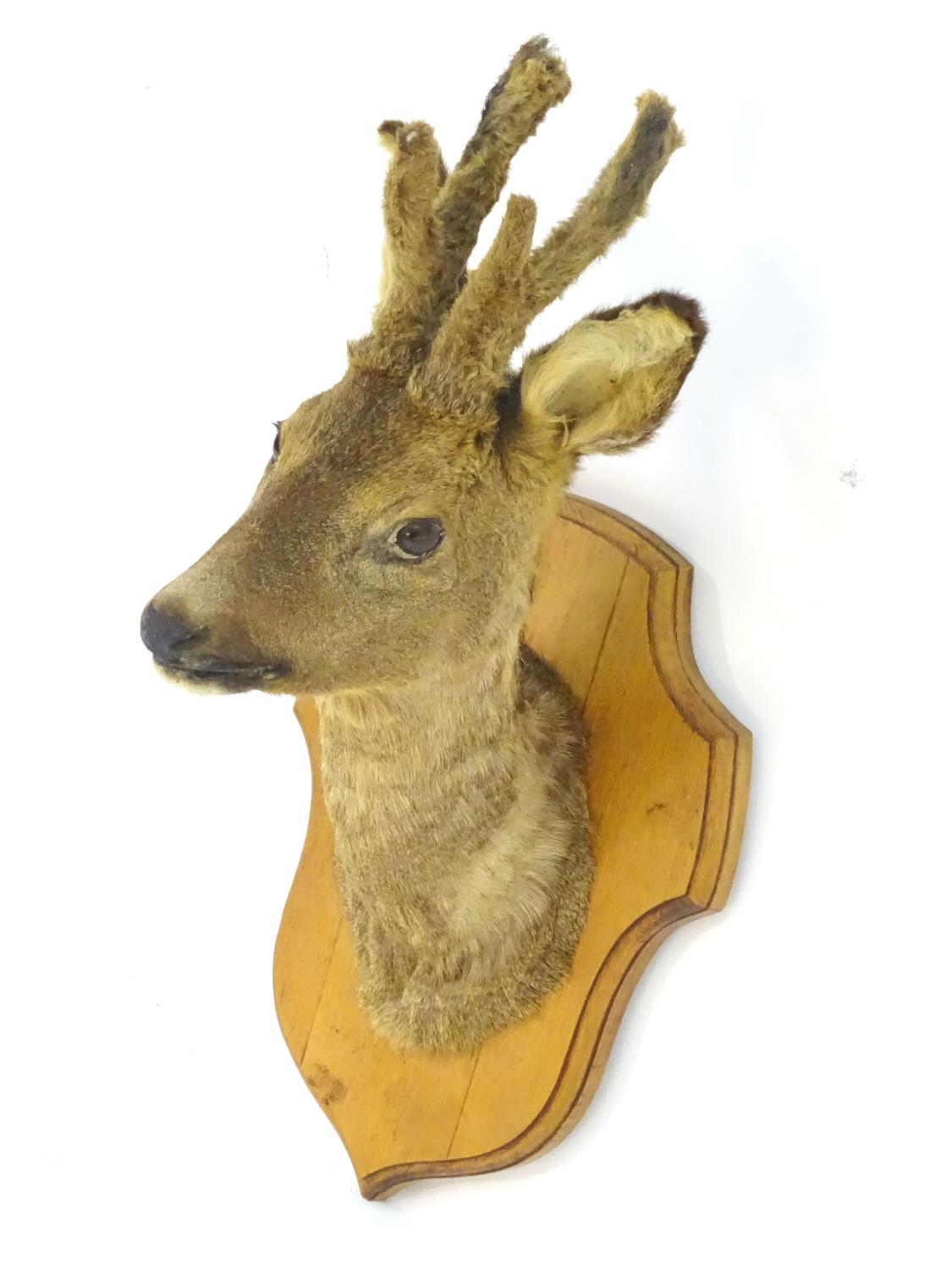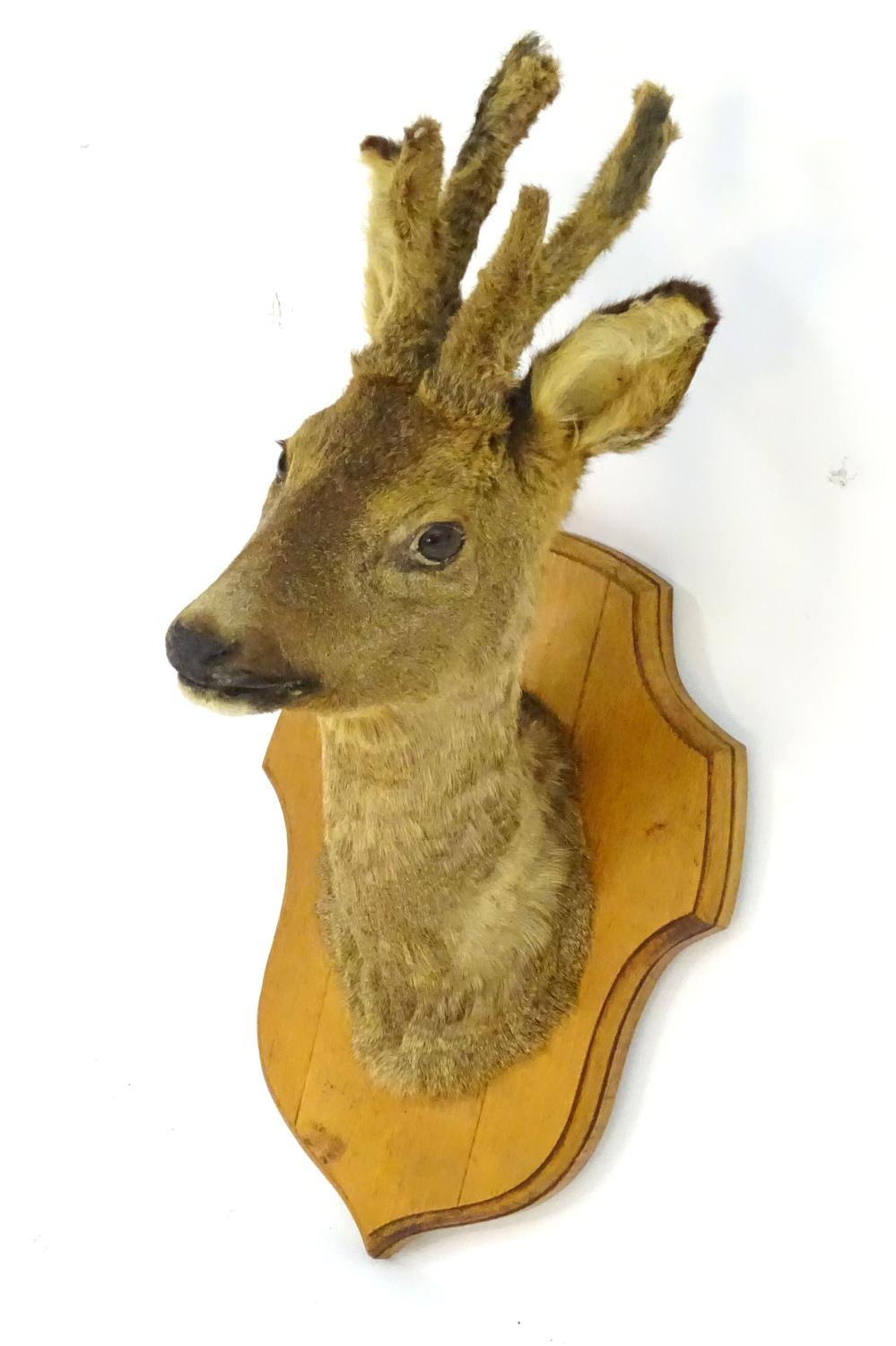 Taxidermy: a mid-20thC Continental head mount of a Roe buck, with antlers in velvet, affixed to an oak shield plinth, 23" tall, 10" wide