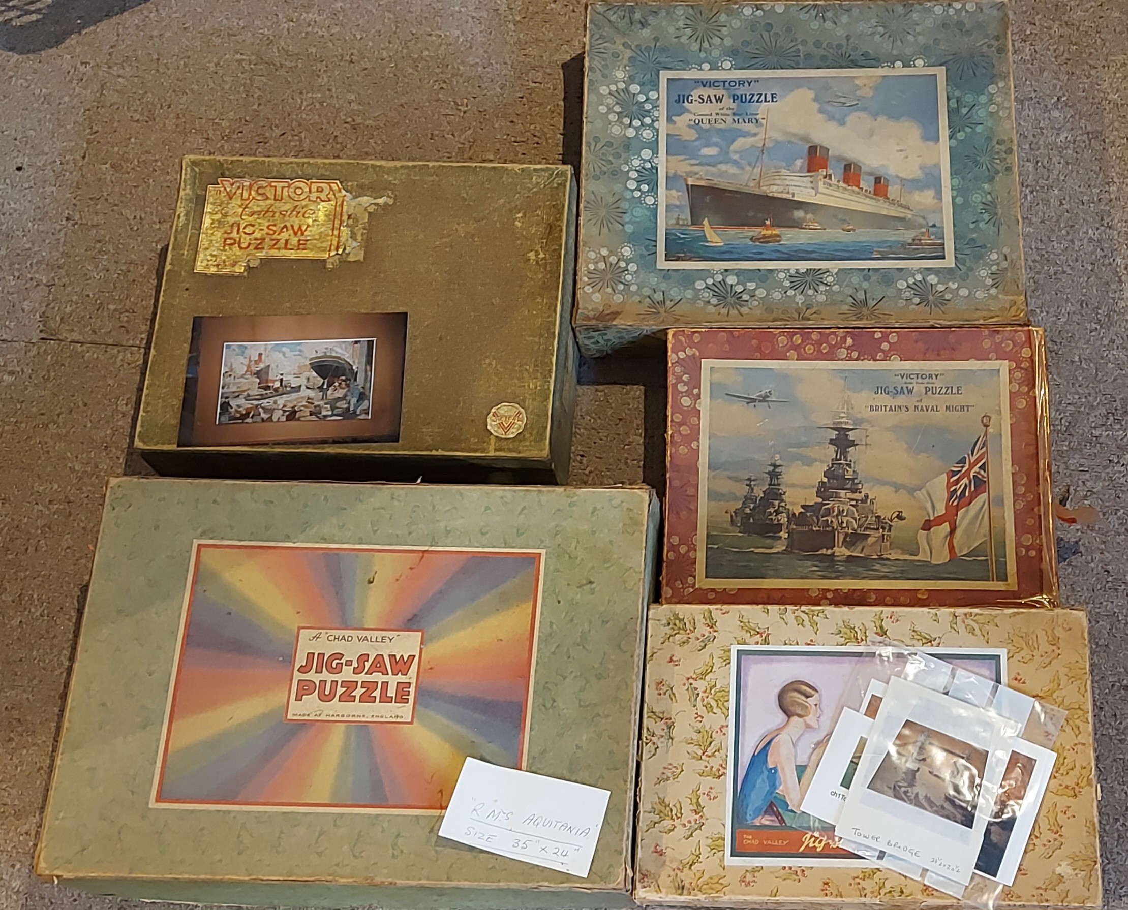 A Jigsaw puzzle by Chad Valley R.M.S. Aquitania together with another by Chad Valley and three puzzles by Victory
