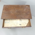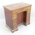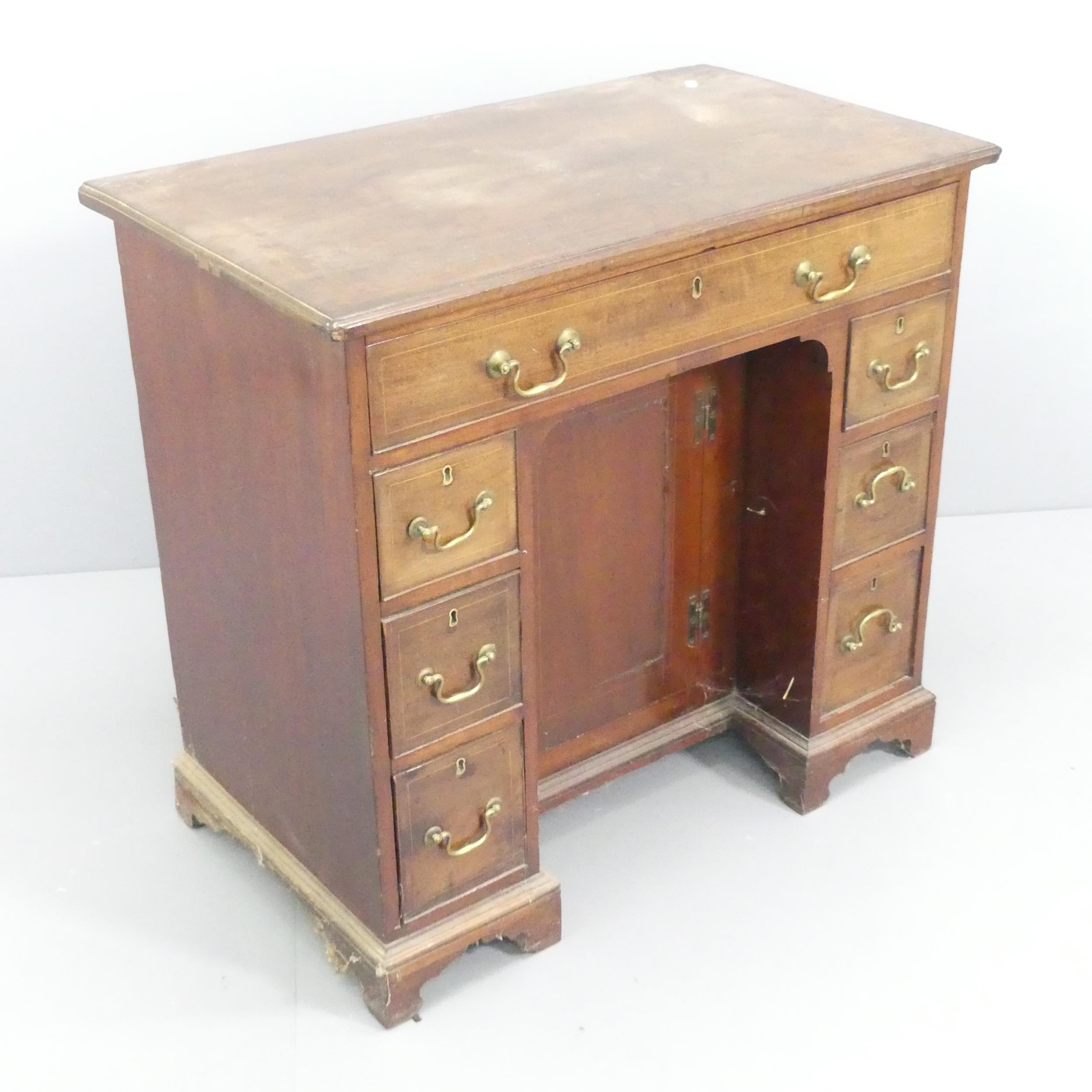 A Queen Anne style mahogany and satinwood strung kneehole writing desk with seven drawers and cupboards under. 80x75x47cm.