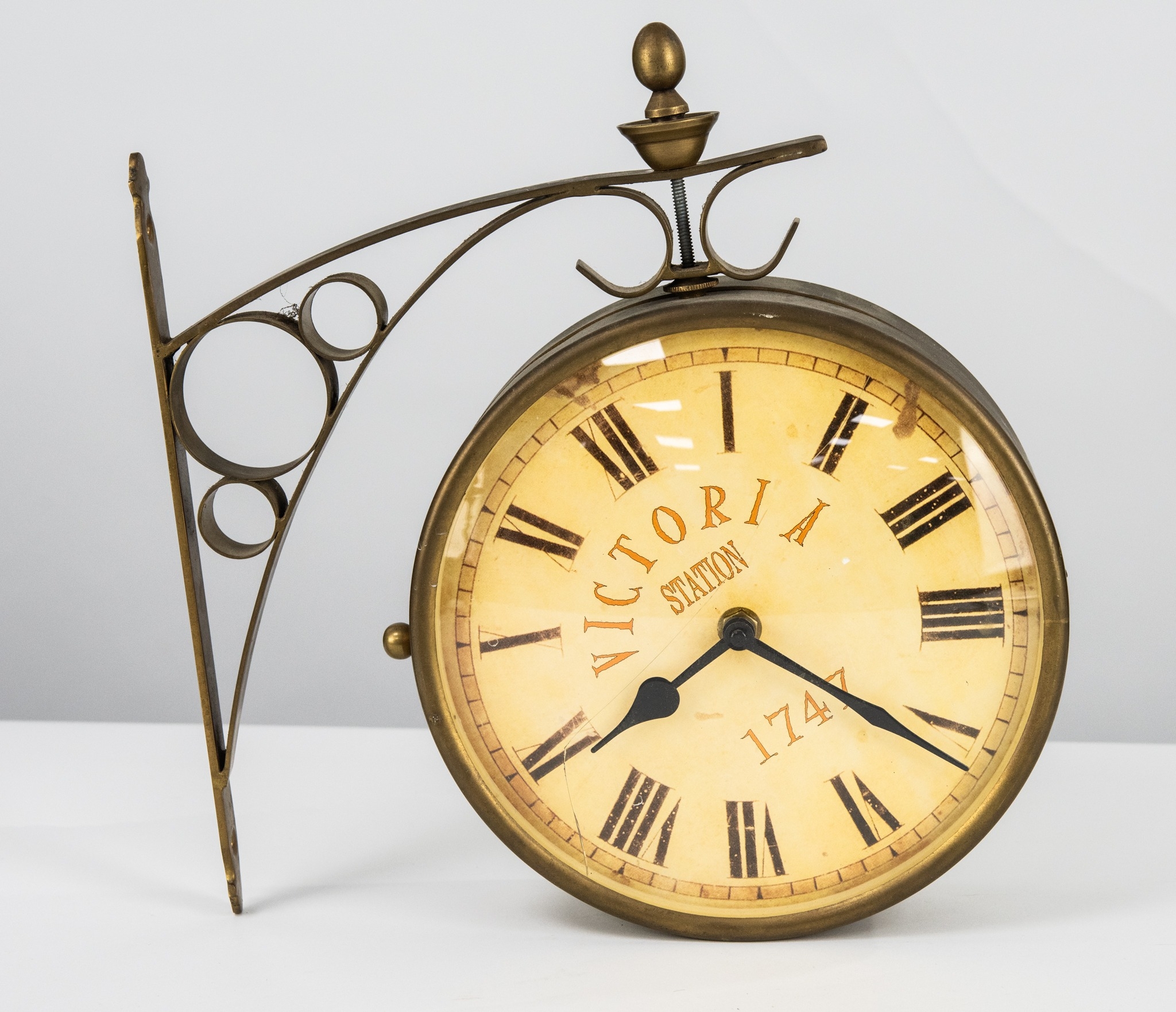 MODERN REPRODUCTION ‘VICTORIA STATION 1747’ RAILWAY STATION STYLE GILT METAL WALL CLOCK, with twin, opposing dials and wall fixing bracket, 11” x 11” (28cm x 28cm) approx, glass cracked to one side