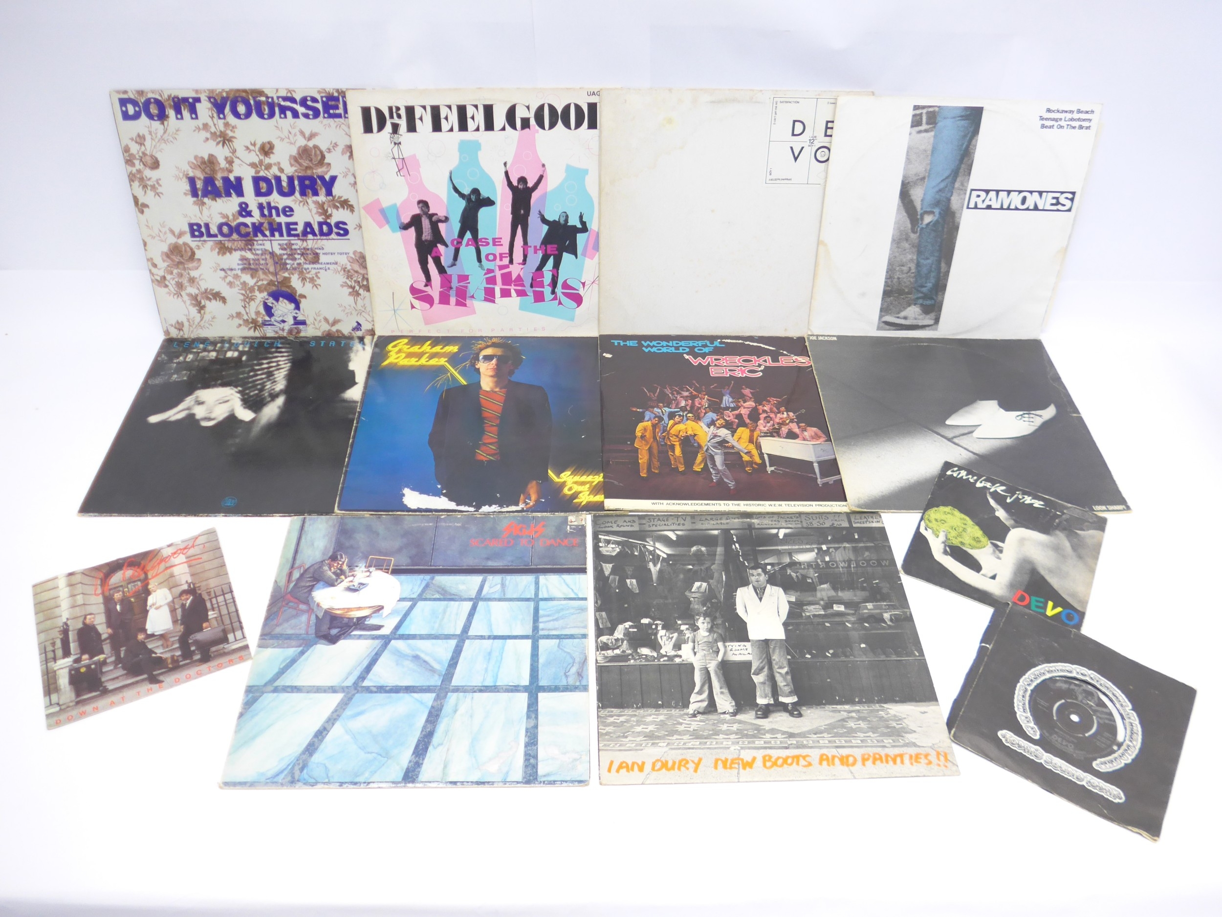 Punk / New Wave / Pub Rock - A collection assorted LPs and singles to include RAMONES: 'Rockaway Beach / Teenage Lobotomy / Beat On The Brat' 12" (Sire 6078 611), IAN DURY & THE BLOCKHEADS: 'New Boots And Panties' LP (Stiff SEEZ 4) and 'Do It Yourself' LP (Stiff SEEZ 14), DEVO: '(I Can't Get Me No) Satisfaction' 12" (Stiff Boy 1), 'Come Back Jonee' 7" on grey vinyl (Virgin VS 223, paper residue to b side label) and 'Jocko Homo / Mongoloid' 7" (Stiff DEV 1, paper reisdue to labels), DR FEELGOOD: 'A Case Of The Shakes' LP (UAG 30311) and 'Down At The Doctors' 7" (UP 36444), LENE LOVICH: 'Stateless' LP (Stiff SEEZ 7), GRAHAM PARKER: 'Squeezing Out Sparks' LP (Vertigo 9102 030, sleeve G), WRECKLESS ERIC: 'The Wonderful World Of Wreckless Eric' LP (Stiff SEEZ 9), JOE JACKSON: 'Look Sharp!' LP (AMLH 64743) and SKIDS: 'Scared To Dance' LP (Virgin V2116) (13, vinyl generally VG+ wih a few dropping slightly under, sleeves generally VG with water damage/staining to some)