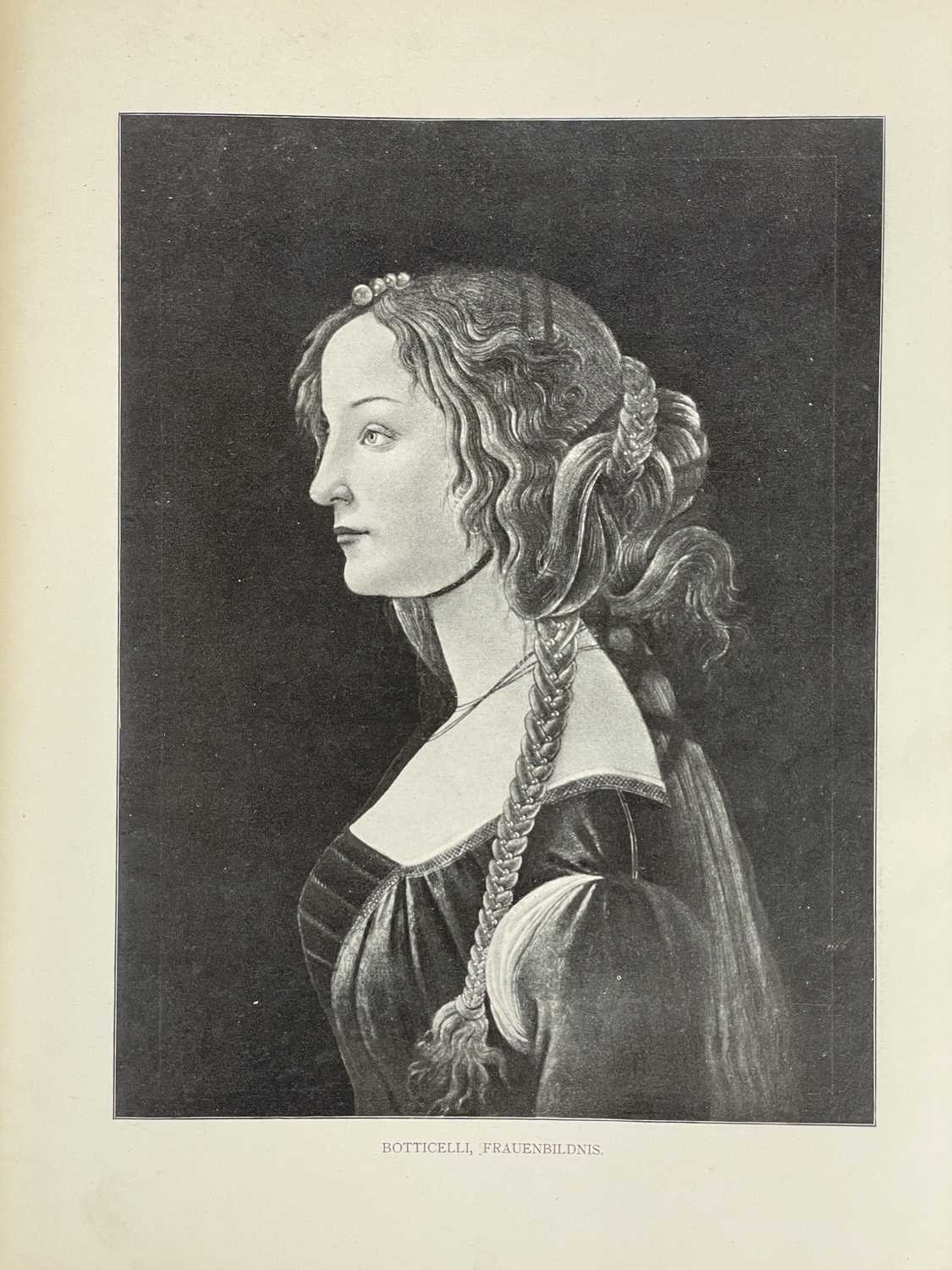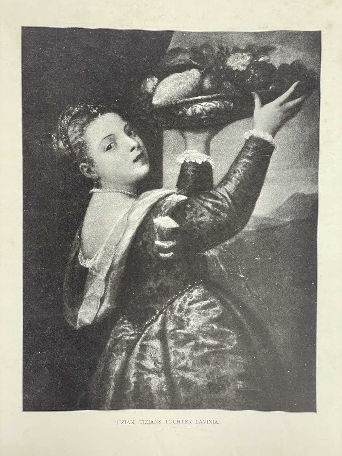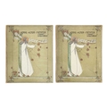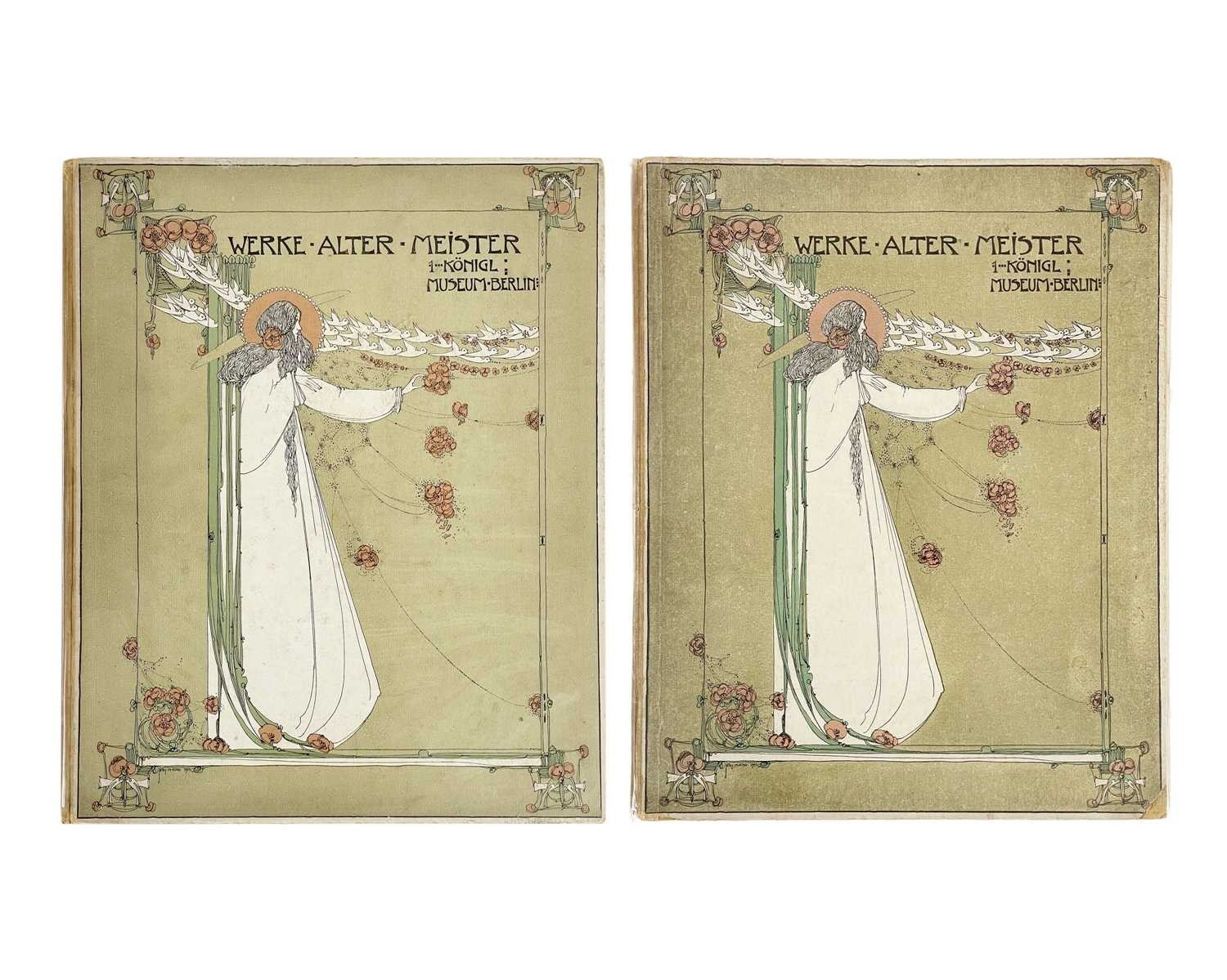 Jessie M. King designs Werke Alter Meister, Kõnigl. Museum Berlin Original cloth backed boards, with design in colour to the upper cover of a girl with birds and flowers by Jessie M. King, a little shelf wear, decorative endpapers, tear to joint of ffep, black and white repoductions, small amount of spoiling to margins, generally vg, Globus Verlag, Berlin, 1902; with another good copy, bumped with a small amount of loss to printed covers. (2) Provenance From the collection of Colin White (1927–2022) (see lot 1 for more information)