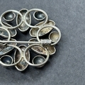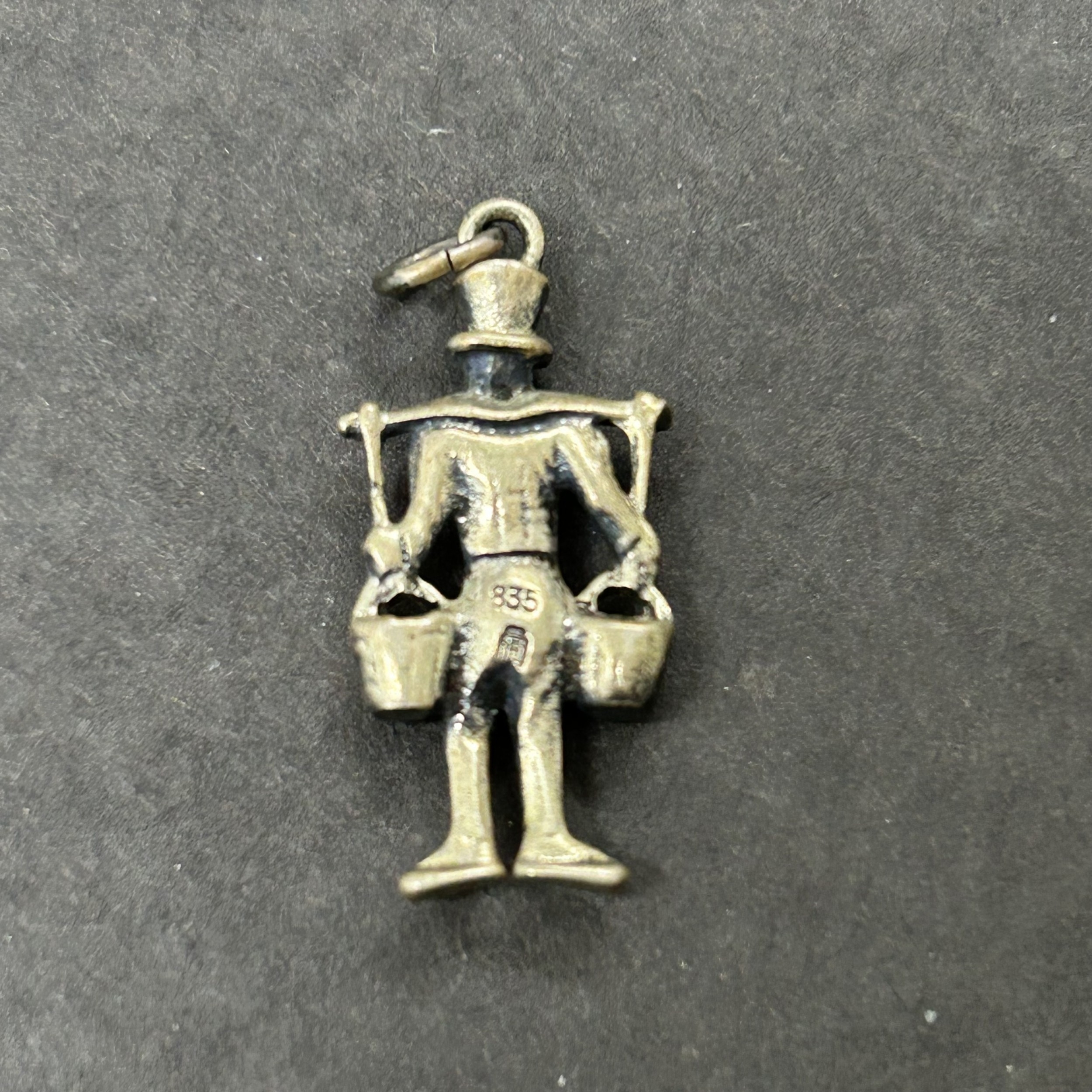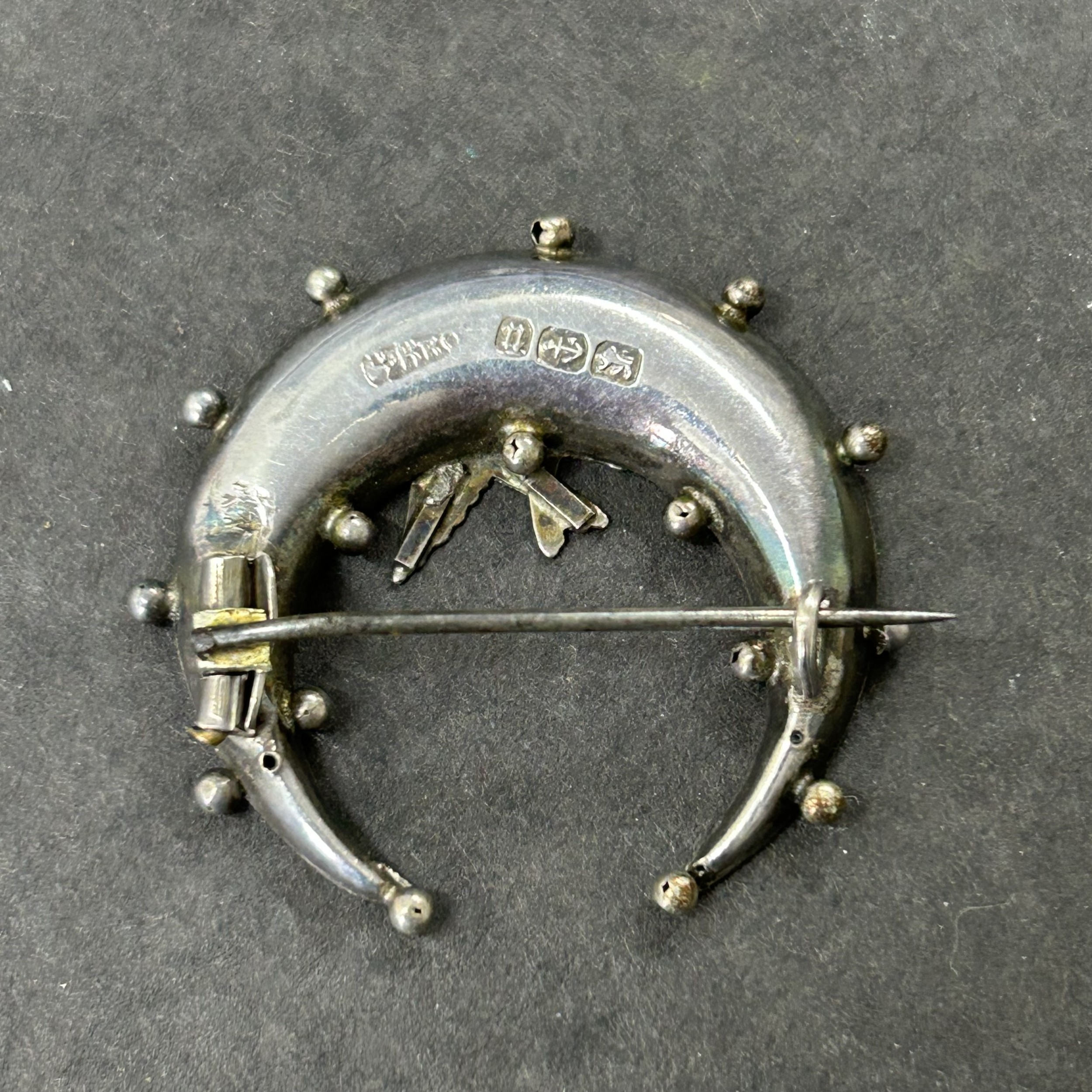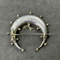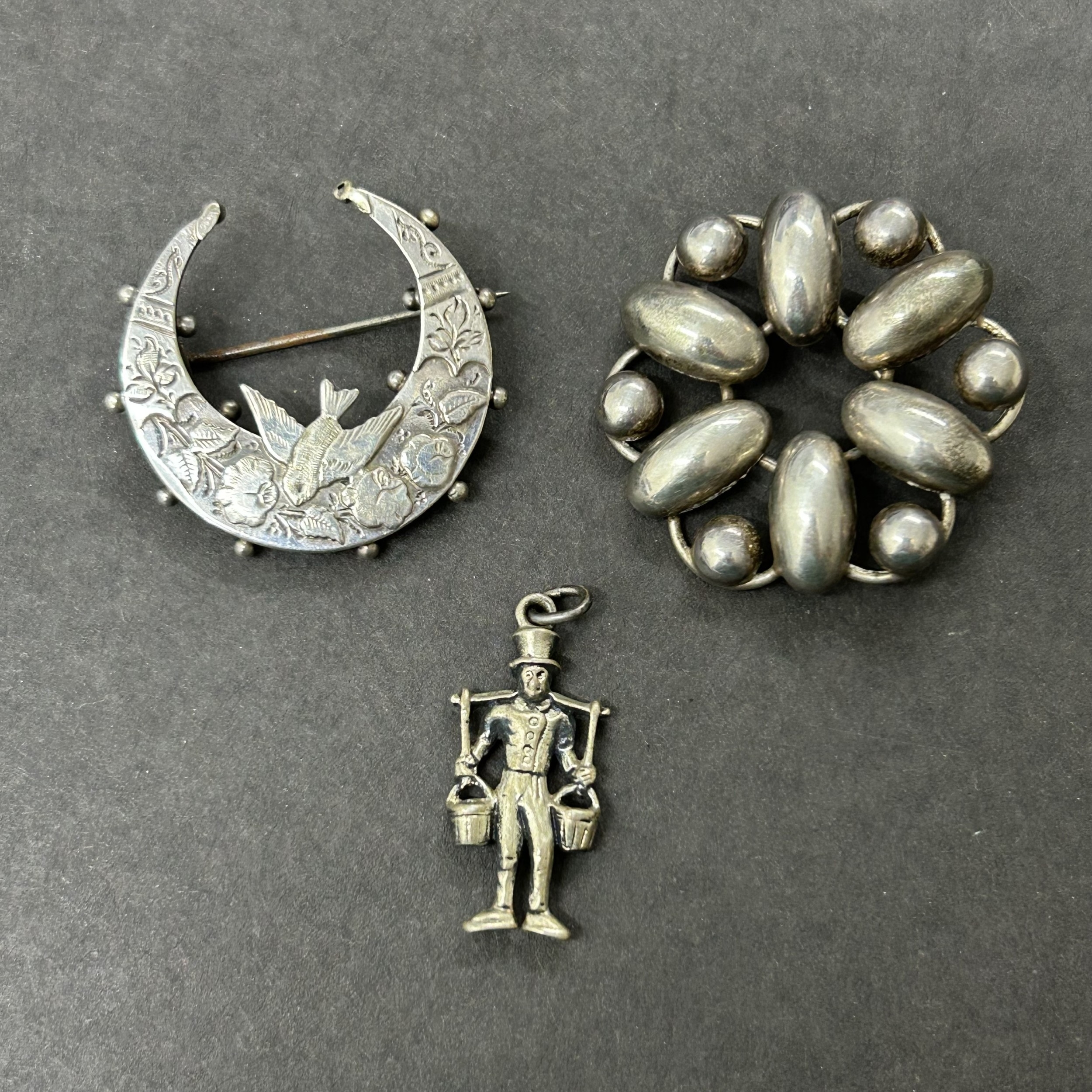 A hallmarked silver crescent shape brooch with bird together with an 835 grade mini figure and an 830 grade pin brooch