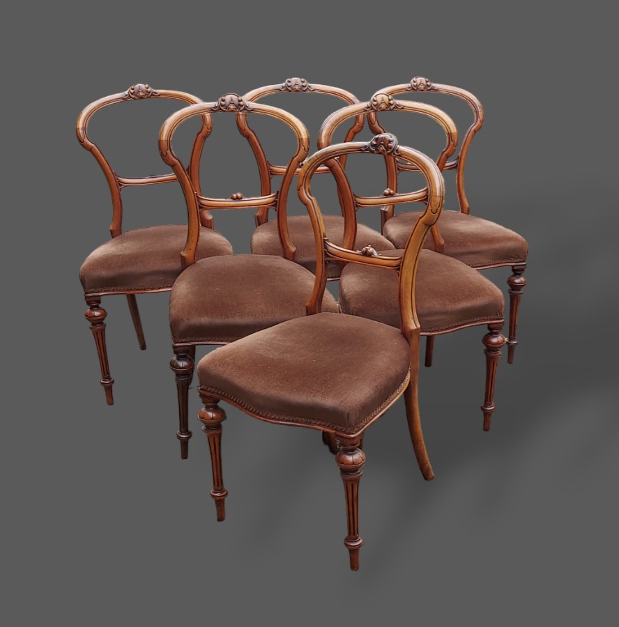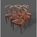 A set of six Victorian walnut balloon back dining chairs, each with a carved rail back above a stuffover set raised upon tirned legs