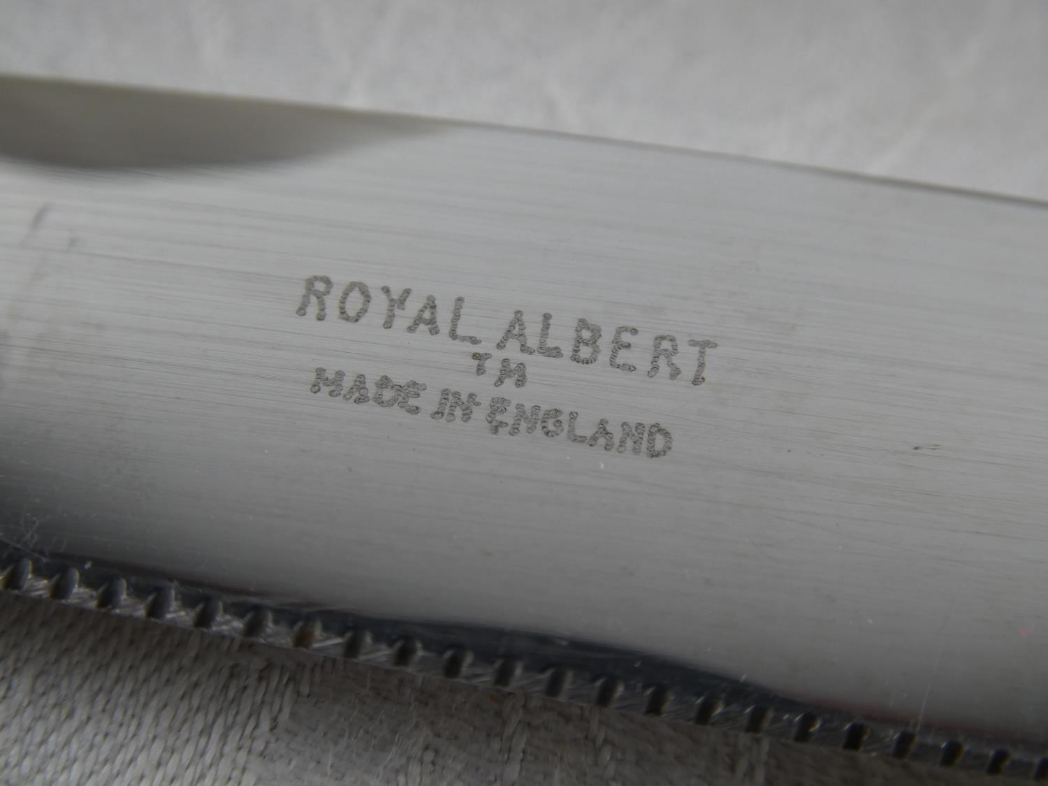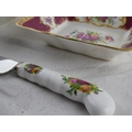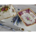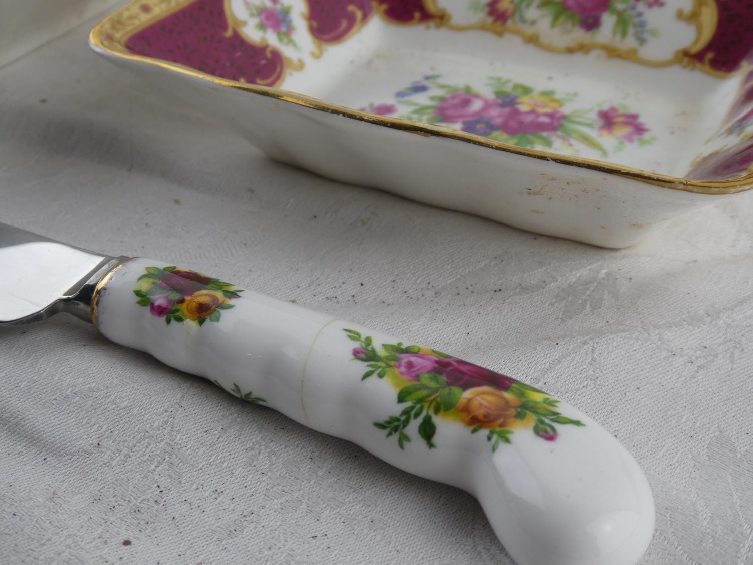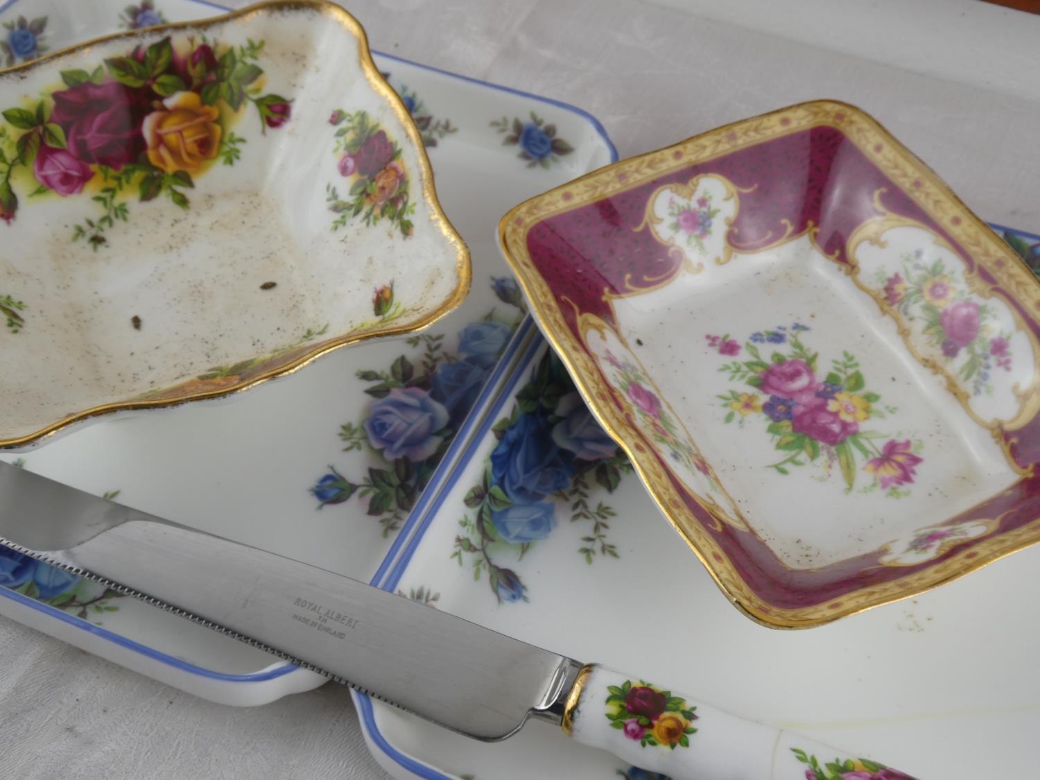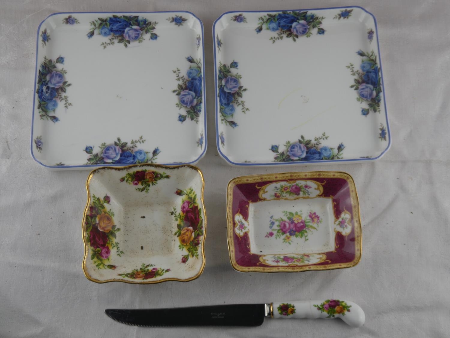 Two Royal Albert 'Moonlight Rose' square plates, a Royal Albert 'Old Country Rose' dish and knife and a Royal Albert 'Lady Hamilton' dish.