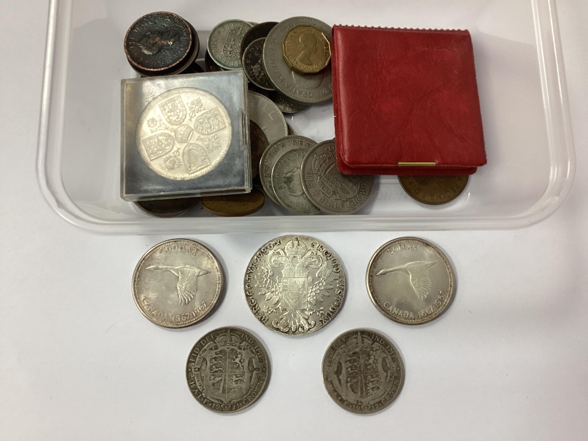 Collection Of GB And World Coins, including three 1967 Canada silver Dollars, two GB pre 1947 silver Half Crowns, a 1780 Austria Maria Theresia silver Thaler re-strike, GB commemorative Crowns etc.