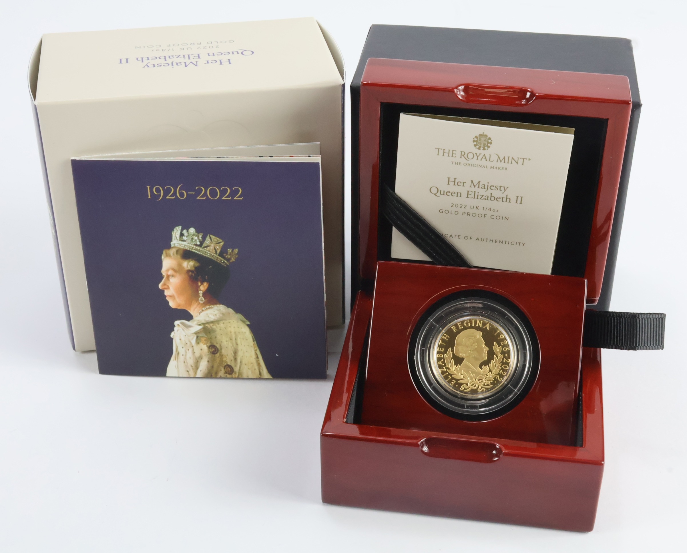 Twenty Five Pounds 2022 "Queen Elizabeth" gold Proof (Quarter oz). FDC boxed as issued