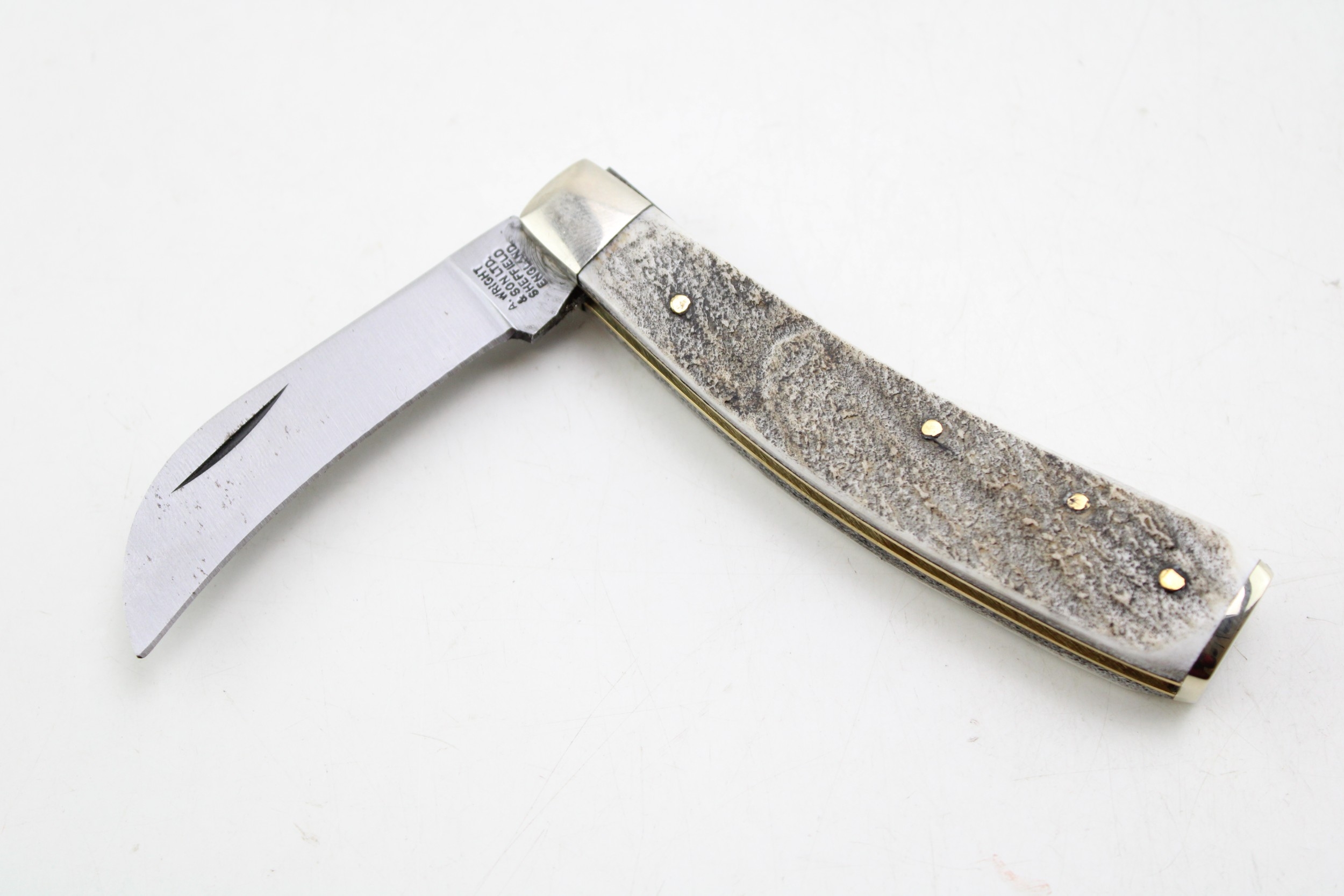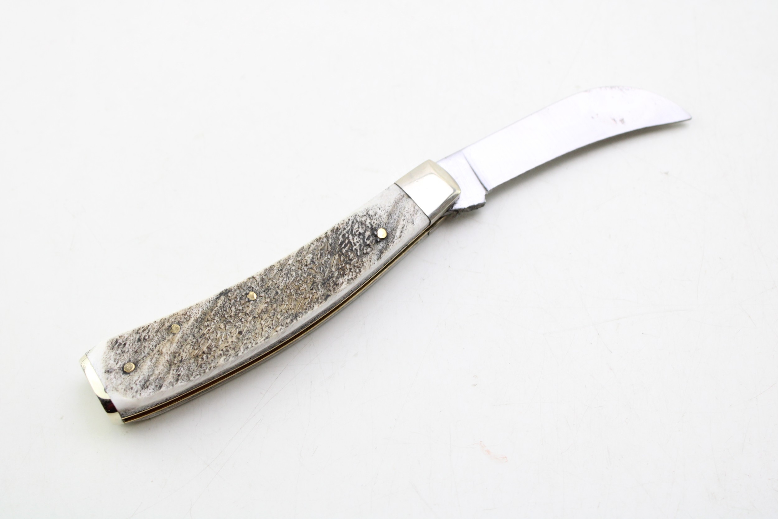 A Wright & Son, Sheffield Stag Handle Flat Cap Pruner Pruning Folding Pocket Knife, 10.5cm.