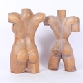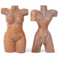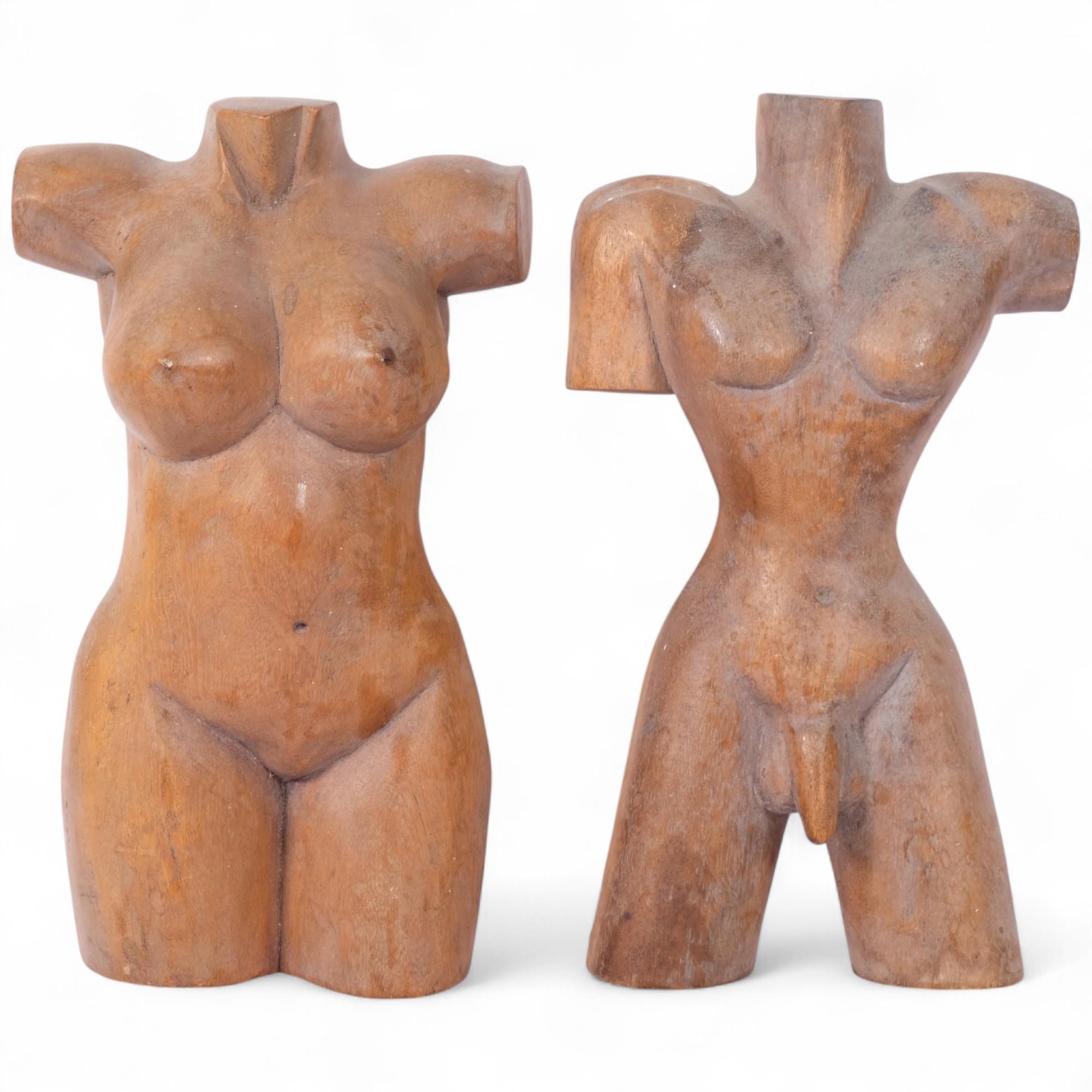 2 carved wood sculptures, depicting a female and male torsos, H30cm