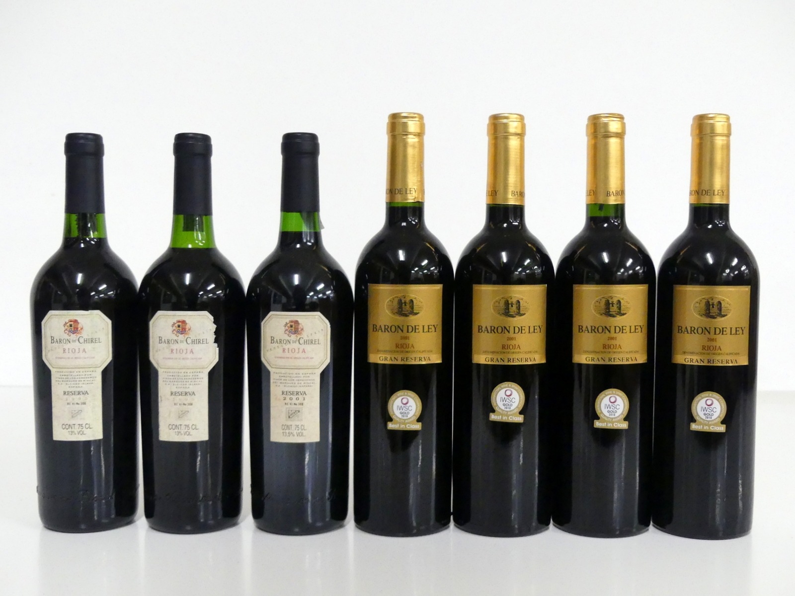 2 bts Baron de Chirel Rioja Reserva 1995 ts 1 bt Baron de Chirel Rioja Reserva 2001 i.n 4 bts Baron de Ley Rioja Gran Reserva 2001 i.n Above 7 bottles