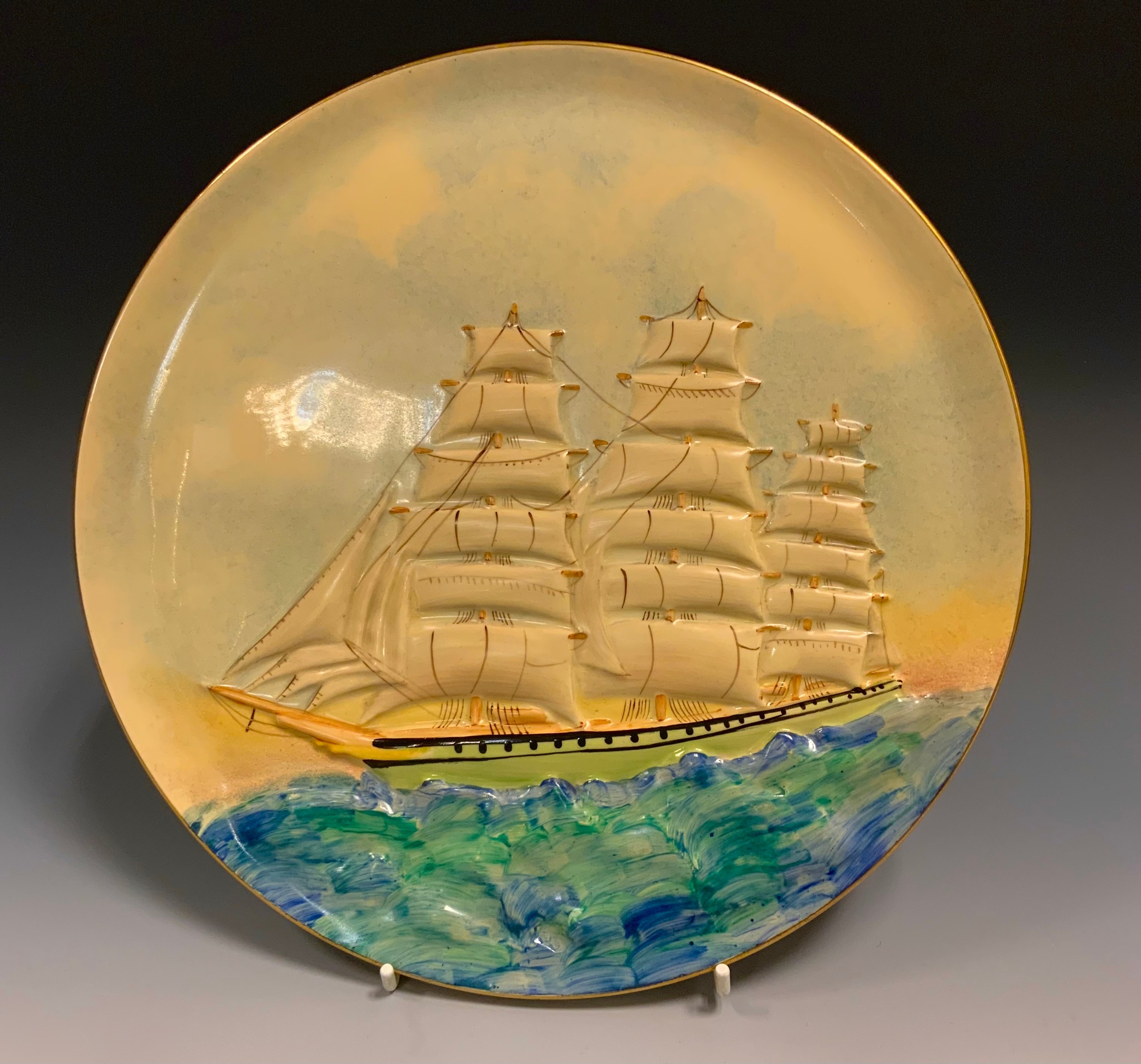 A Grays pottery circular wall plaque, relief decorated with a three masted ship at full sail, 27.5cm diameter, printed marks.