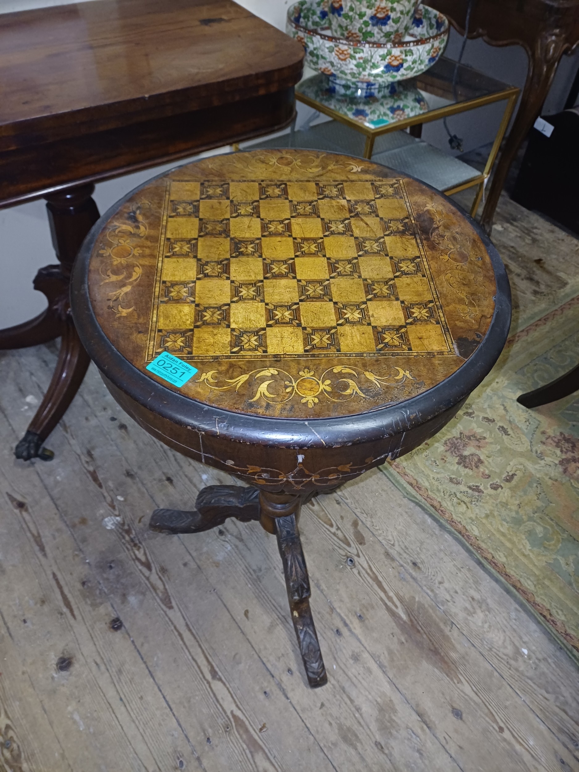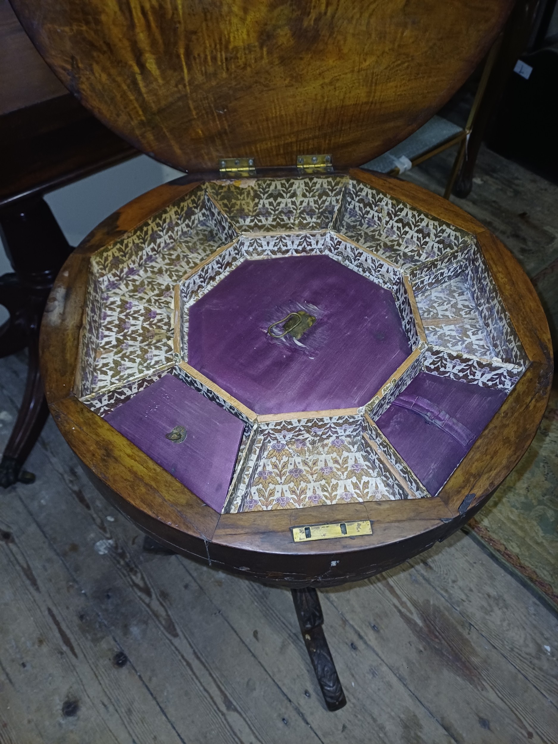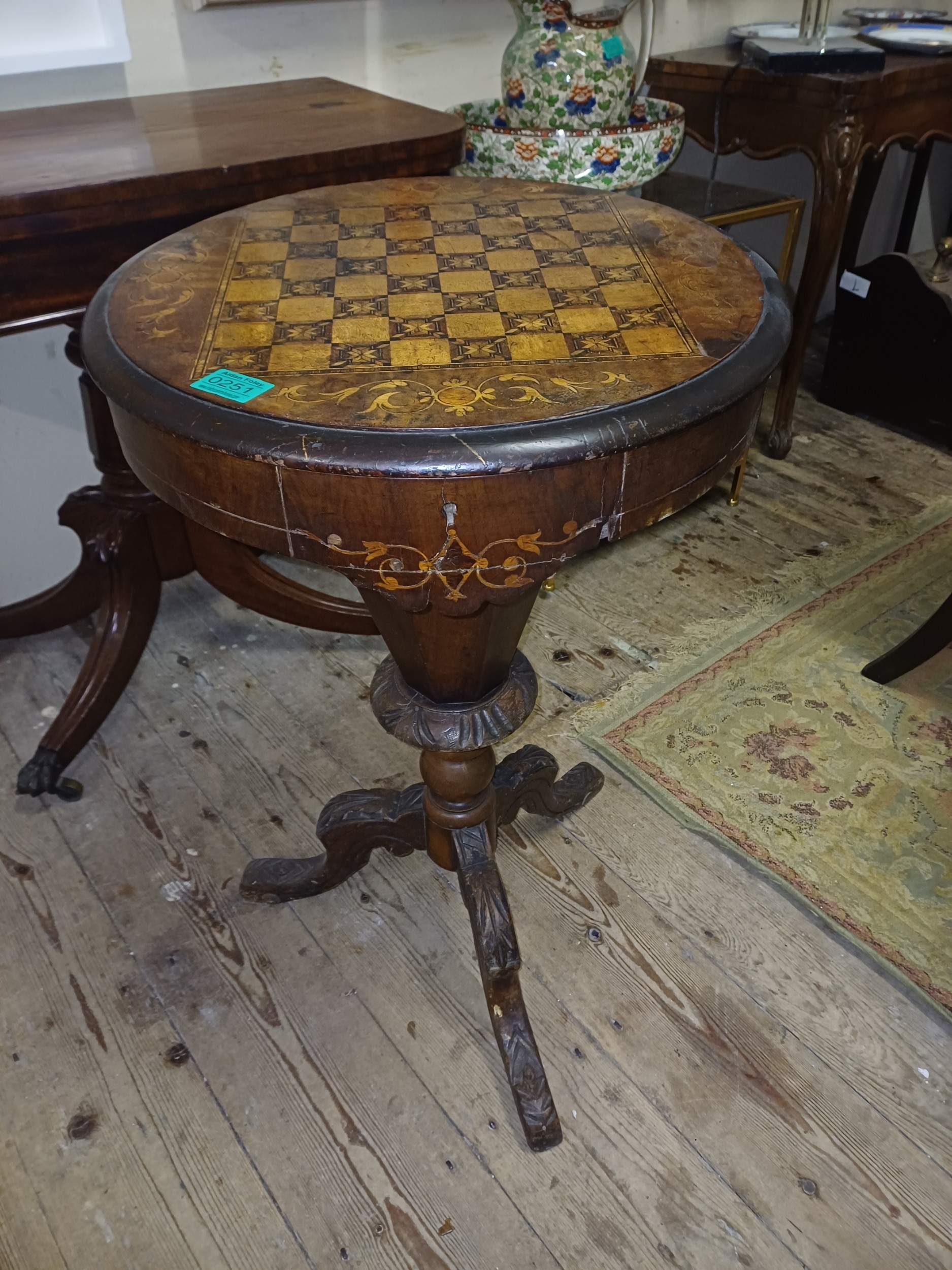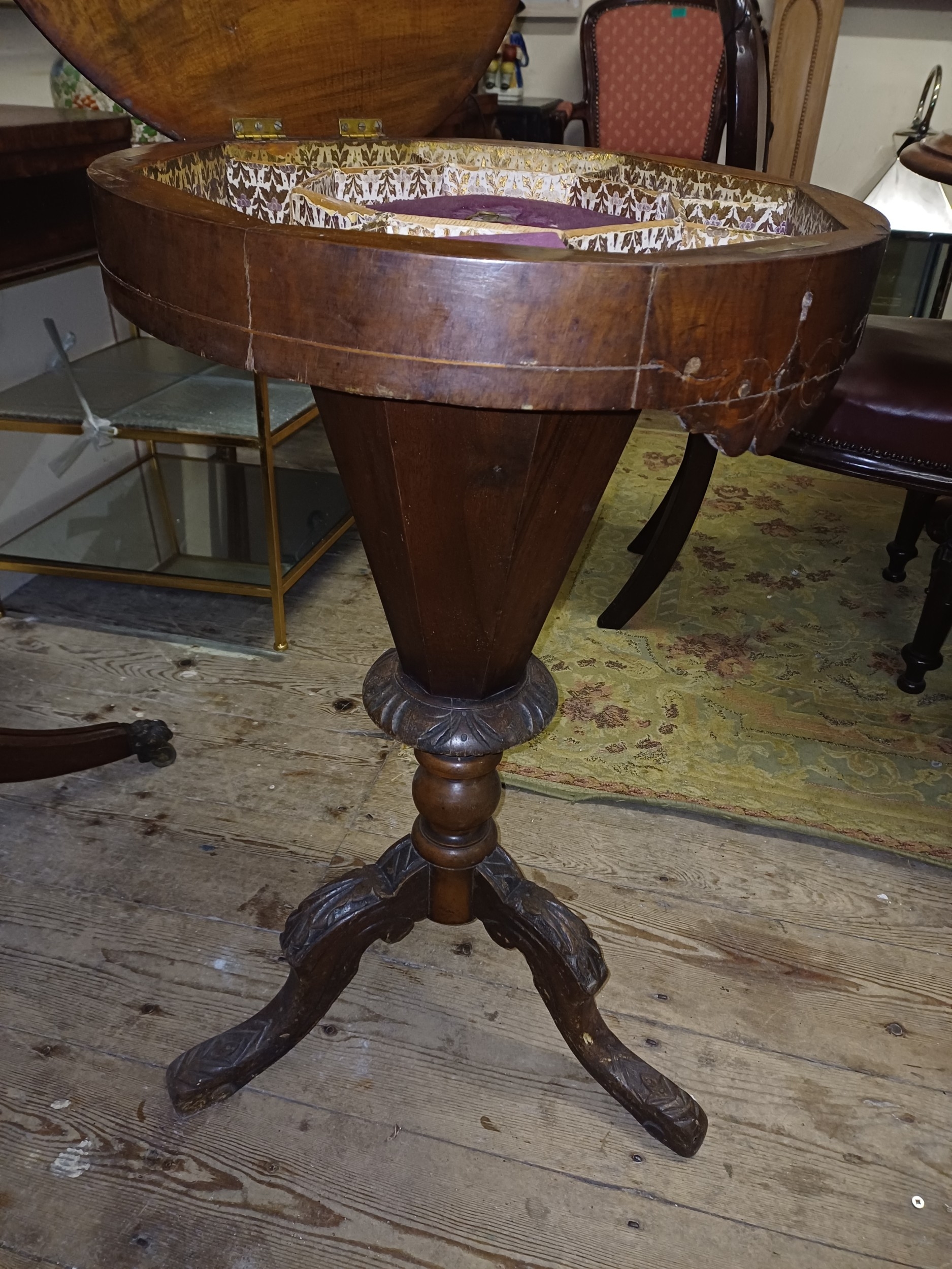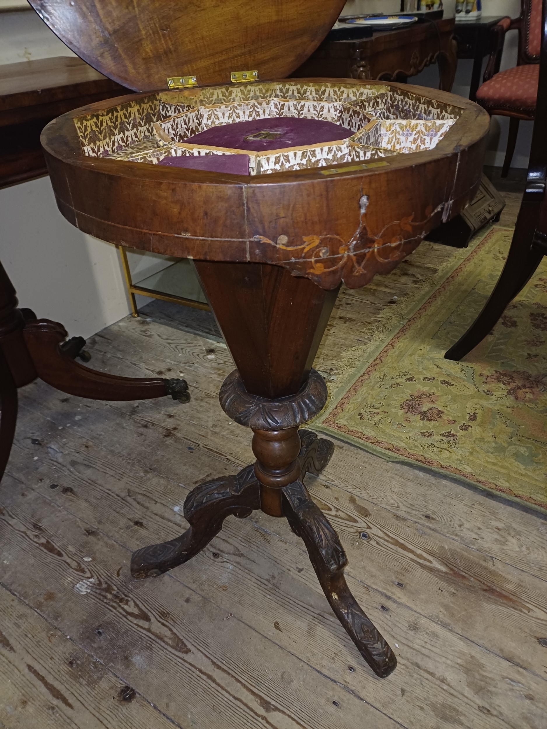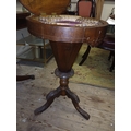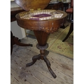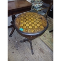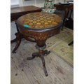 Victorian Inlaid Walnut Trumpet Sewing Table with Games Board Top