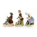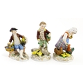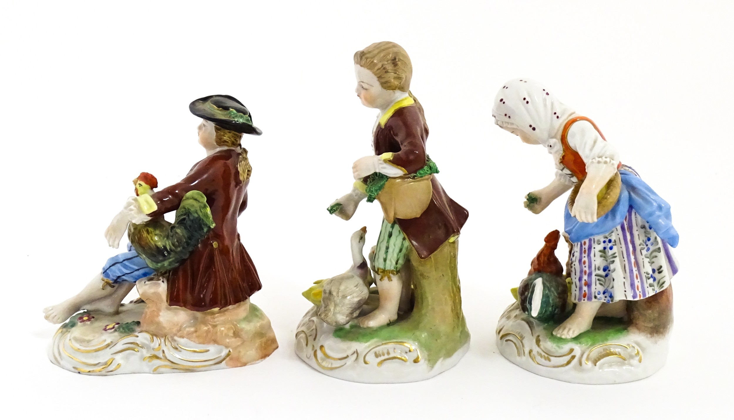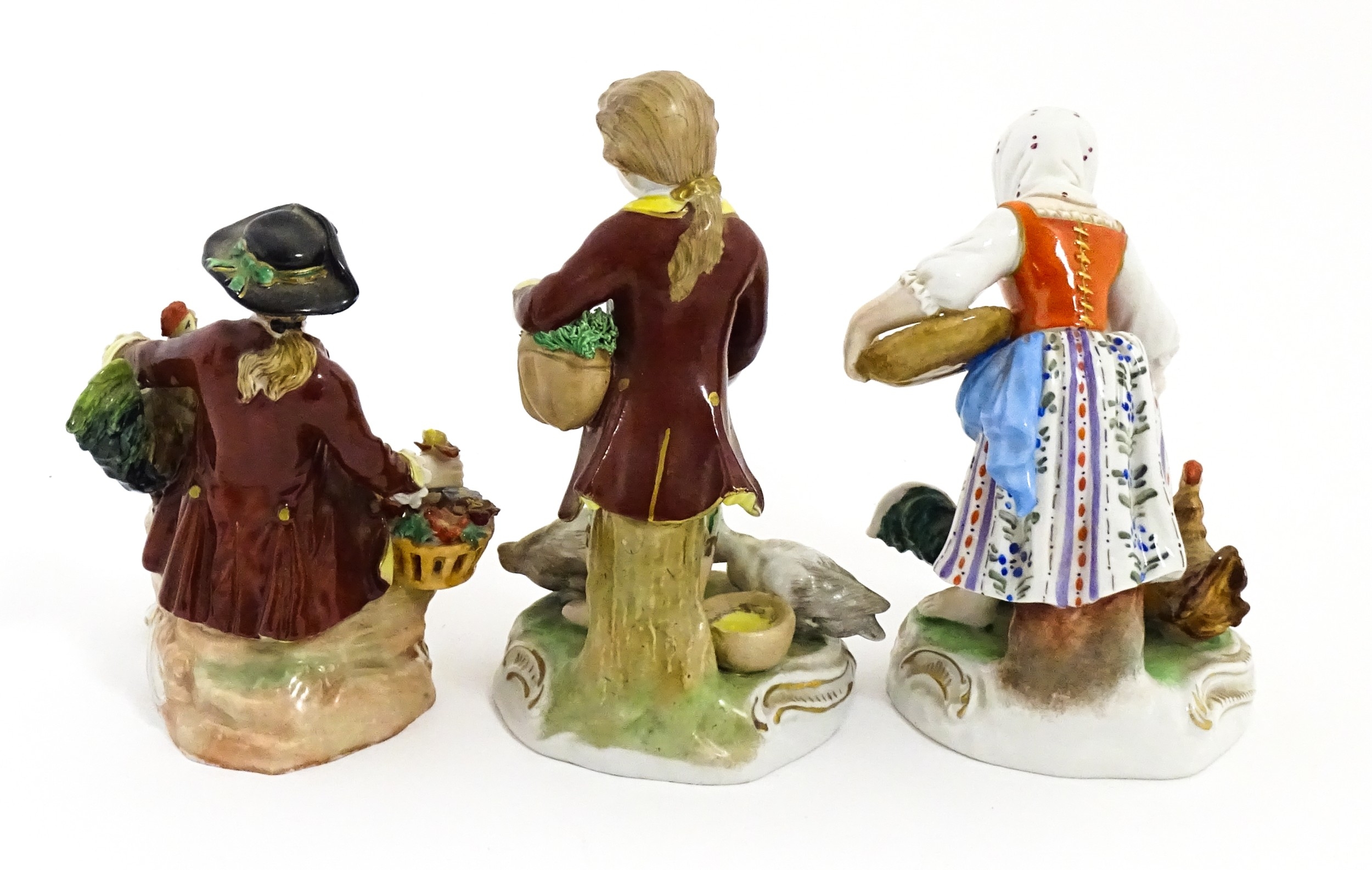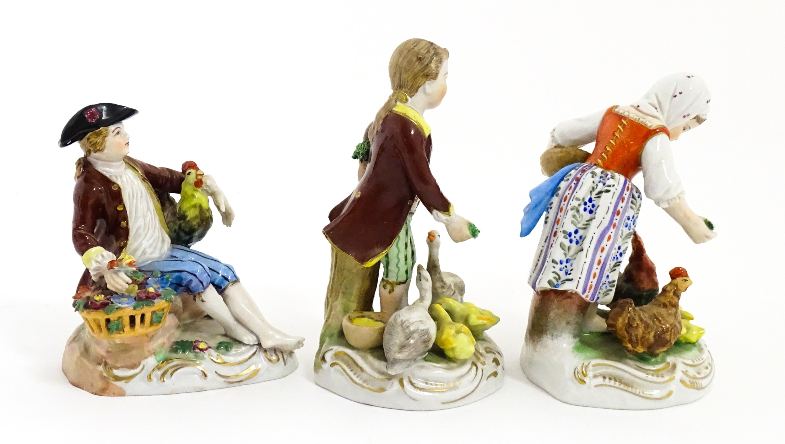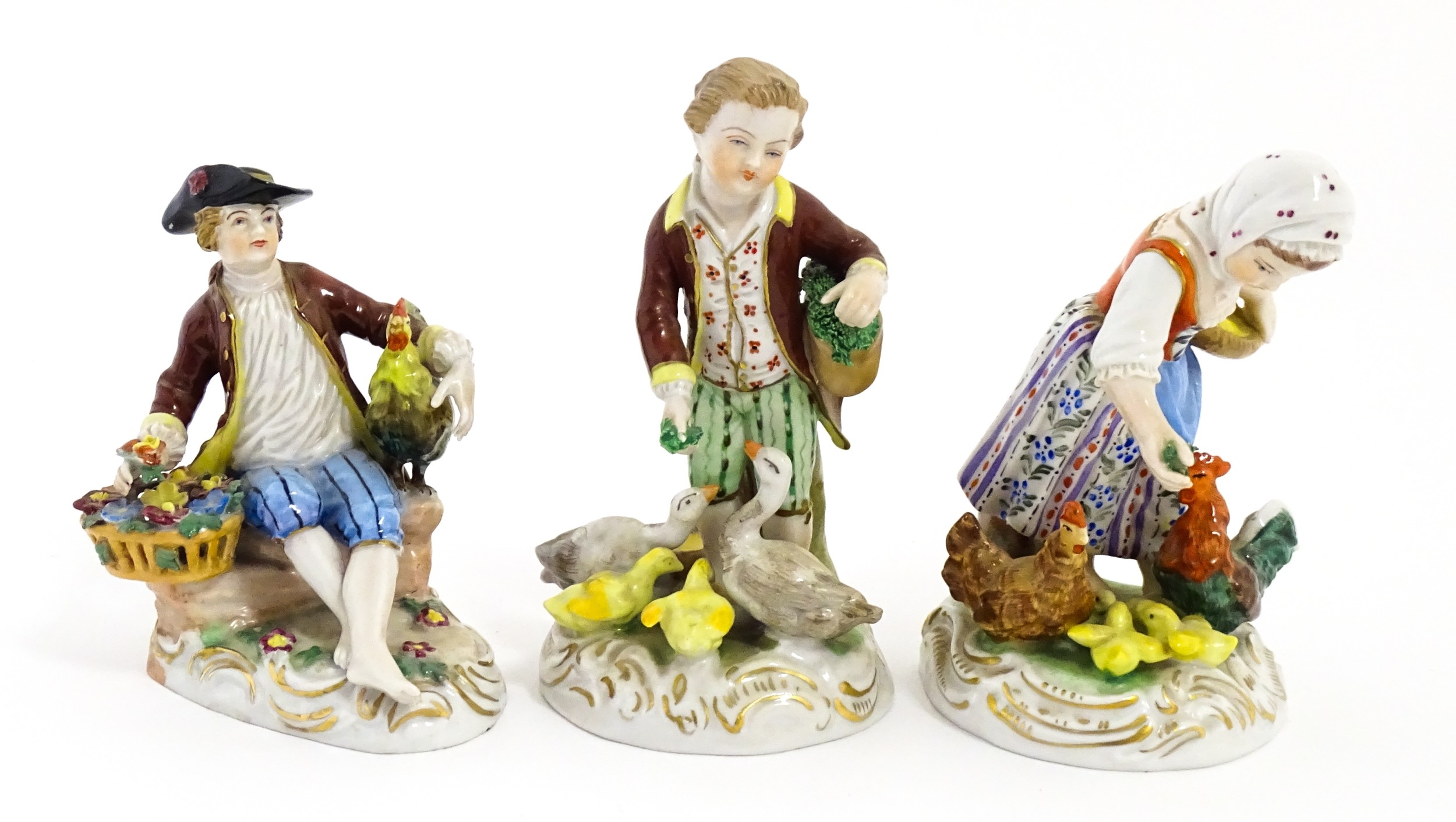 Three Dresden figures comprising a Game Seller, Boy Feeding Geese, and Farm Girl with Chickens. Marked under. Largest approx. 5" high (3)