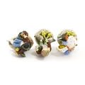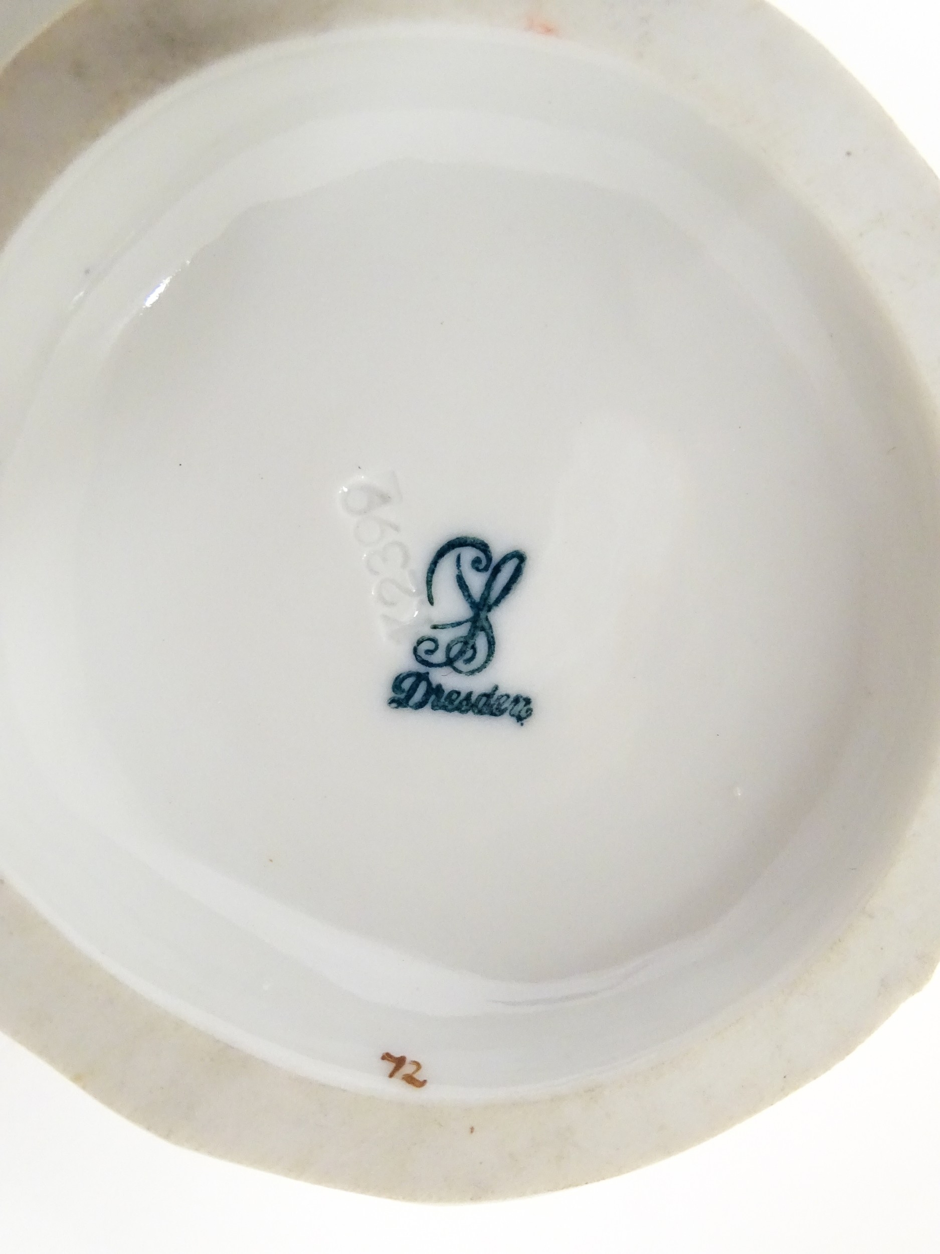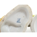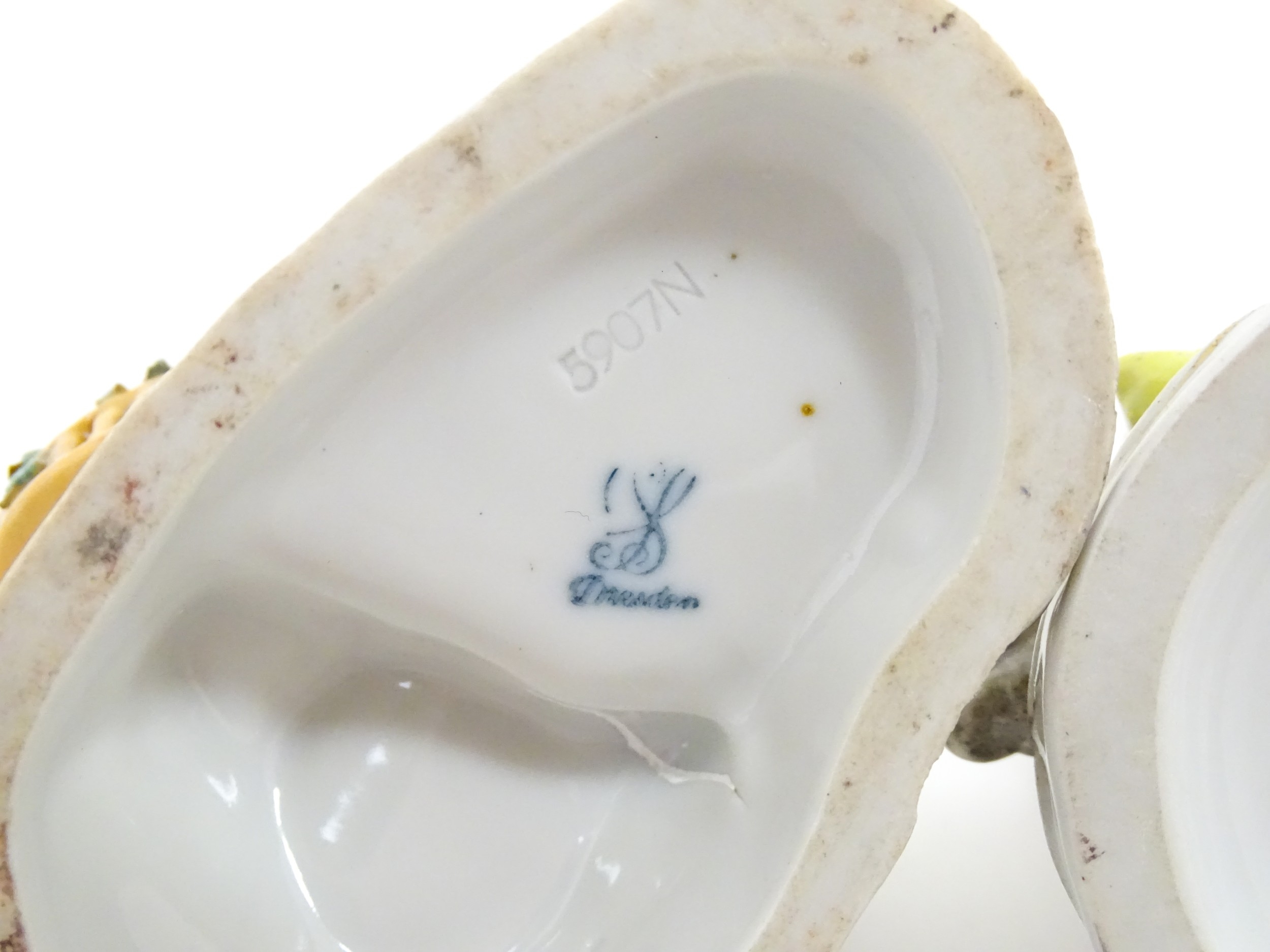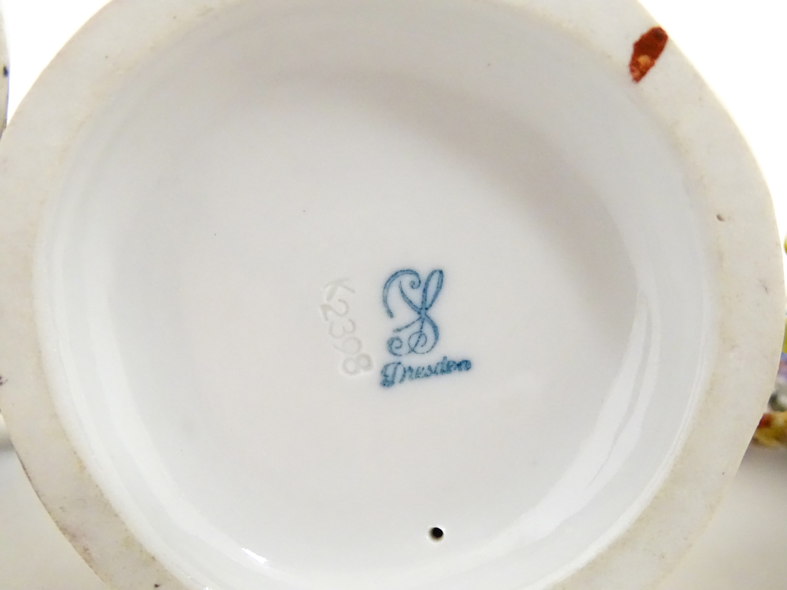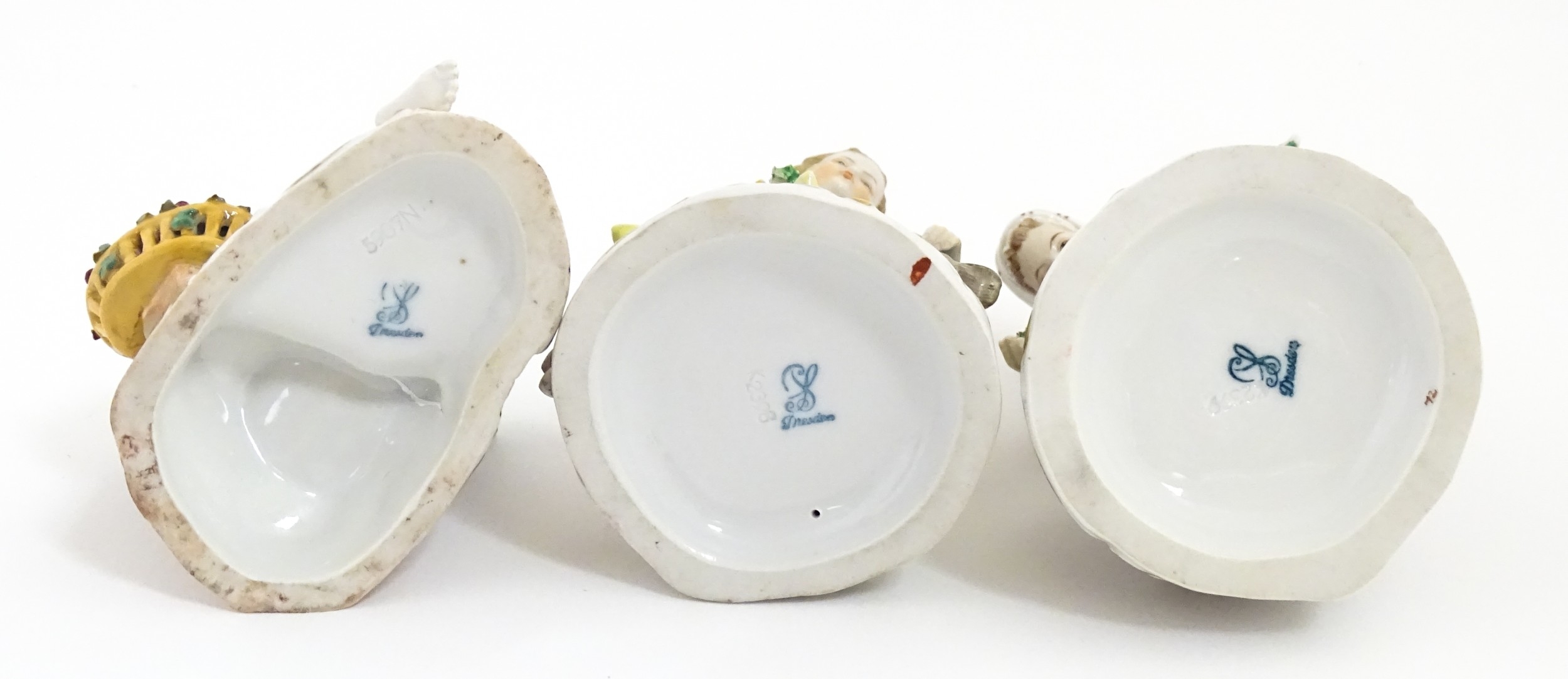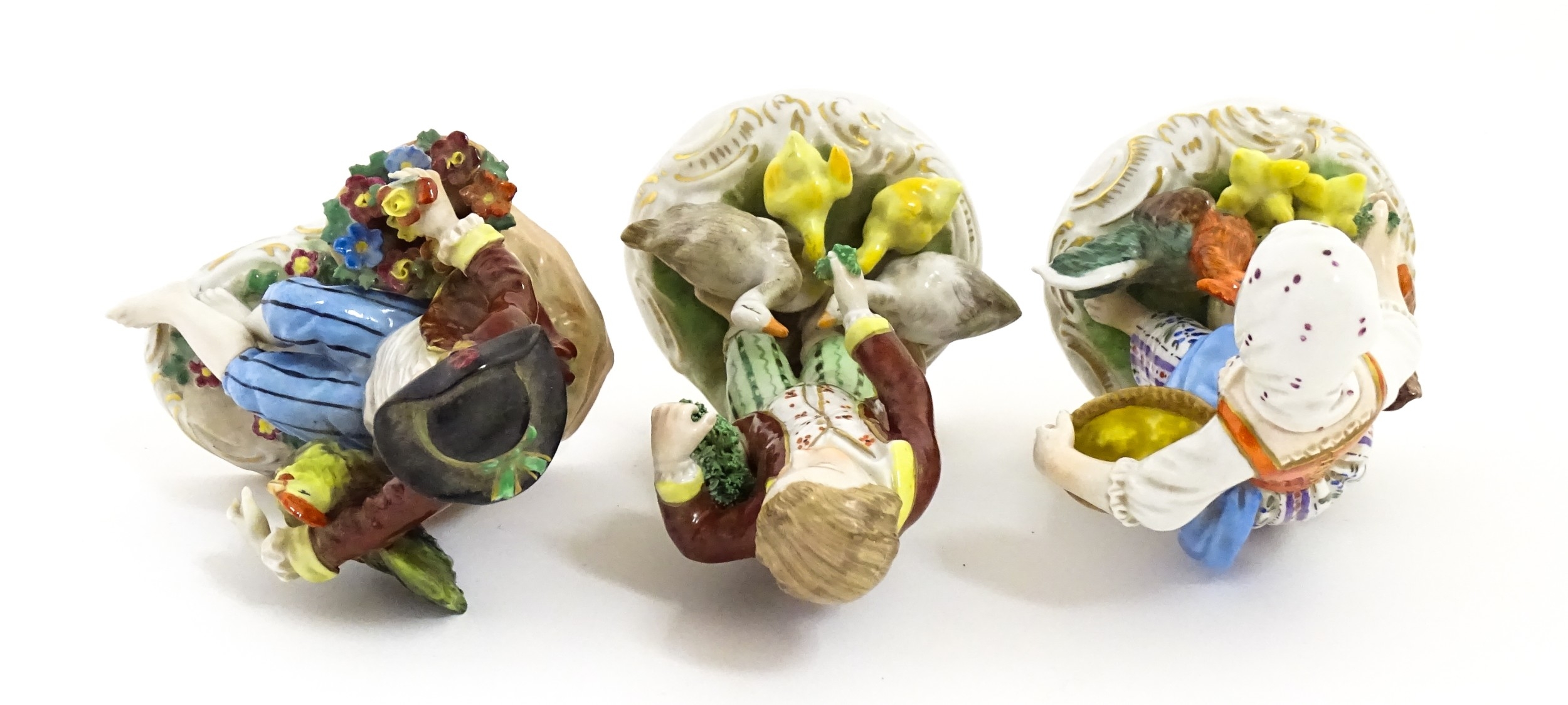 Three Dresden figures comprising a Game Seller, Boy Feeding Geese, and Farm Girl with Chickens. Marked under. Largest approx. 5" high (3)