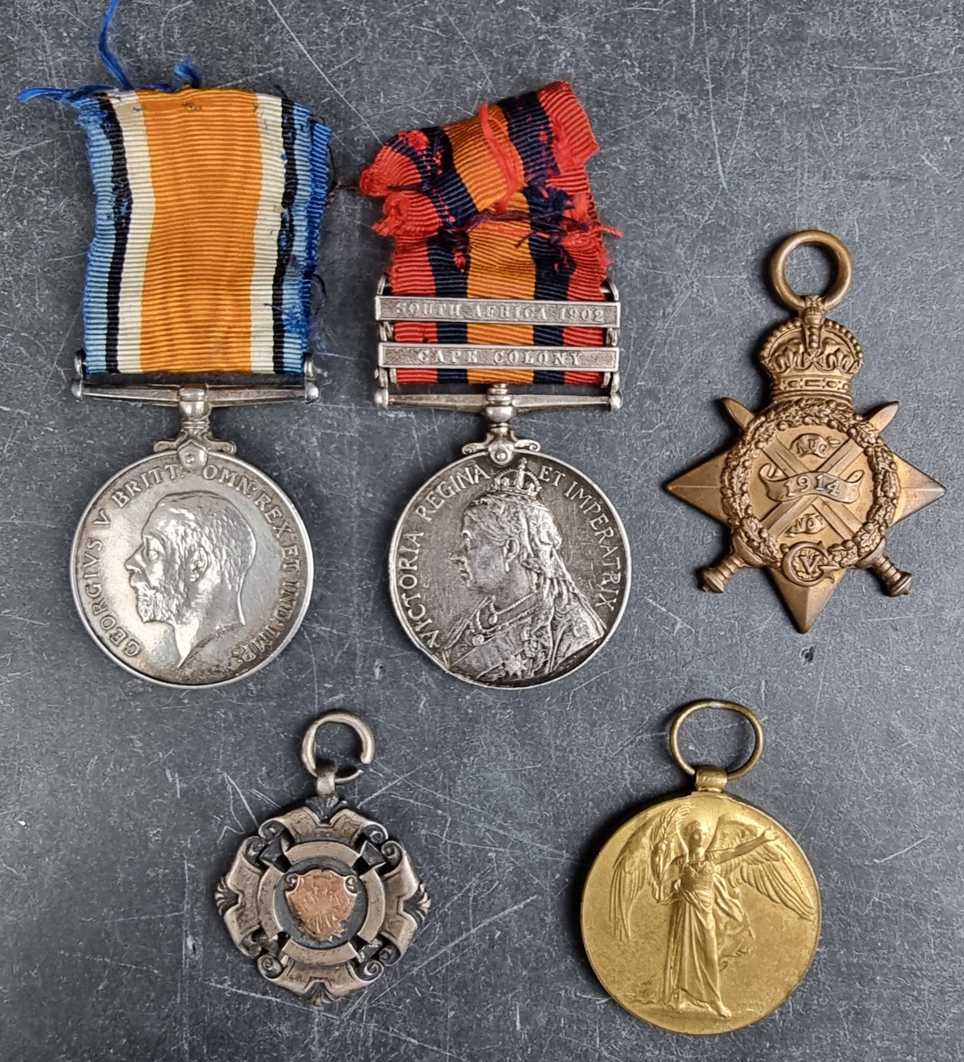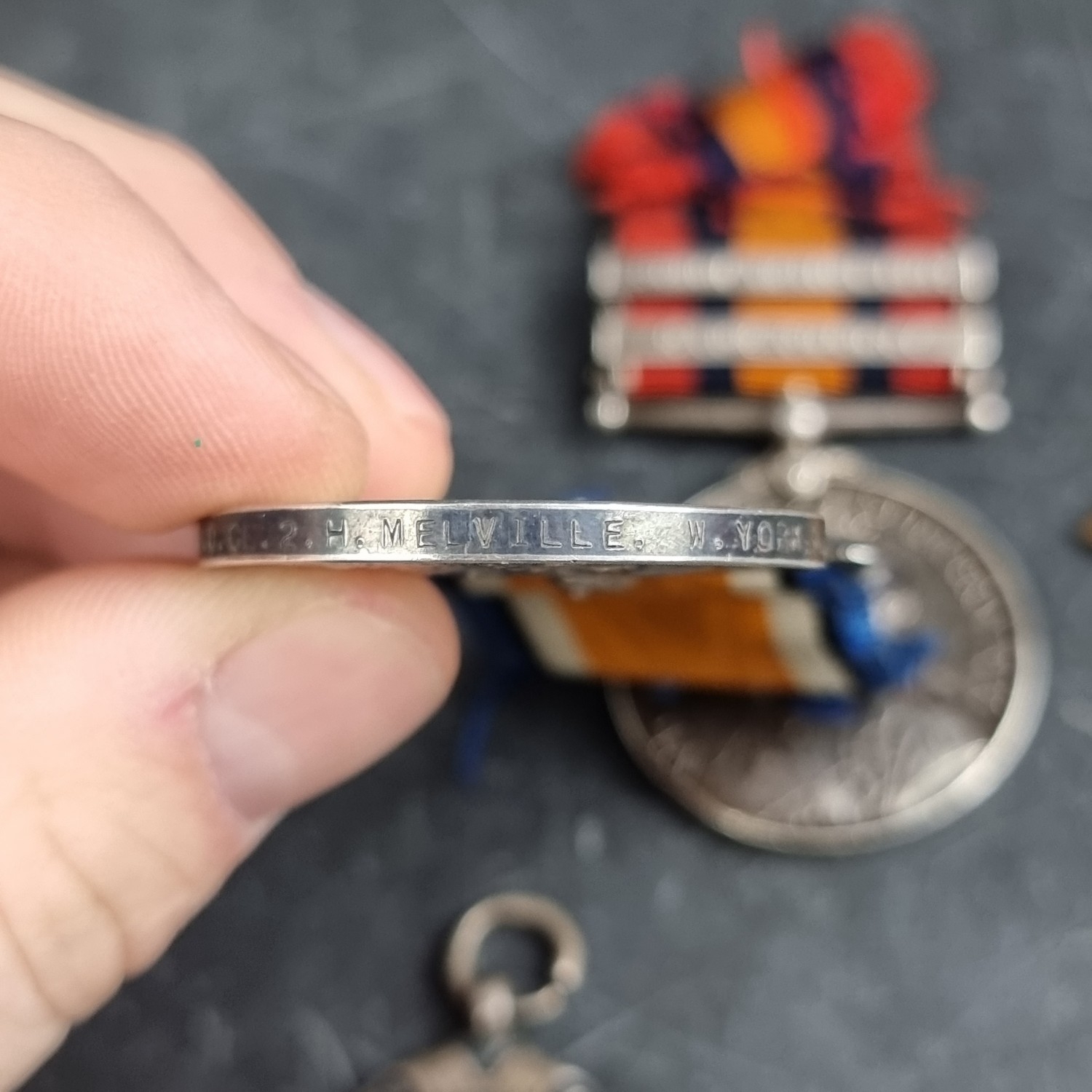 Medals: a Boer War and WWI group of four to 9515 Corp H Melville, York & Lancashire Regt, later 7613 W.O Cl 2 West Yorkshire Regiment; together with a silver 1899 sports medal, to H.F Melville. (5)