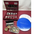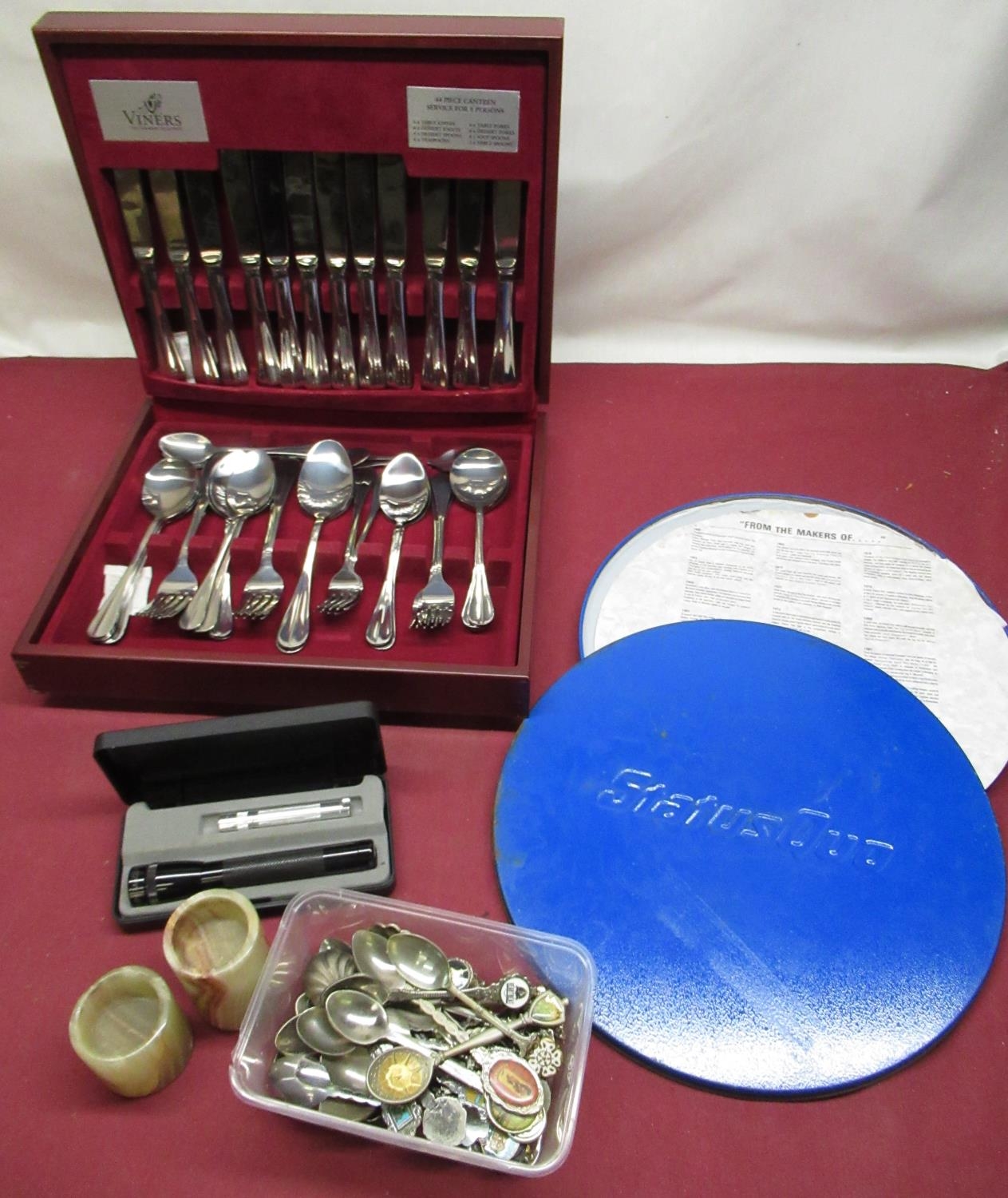 Status Quo From The Makers Of ltd. ed. 12" record, metal presentation tin 25712/5000, December 1982, Viners forty four piece cased canteen of cutlery, silver plated souvenir spoons, set of four graduated onyx tealight holders and other items